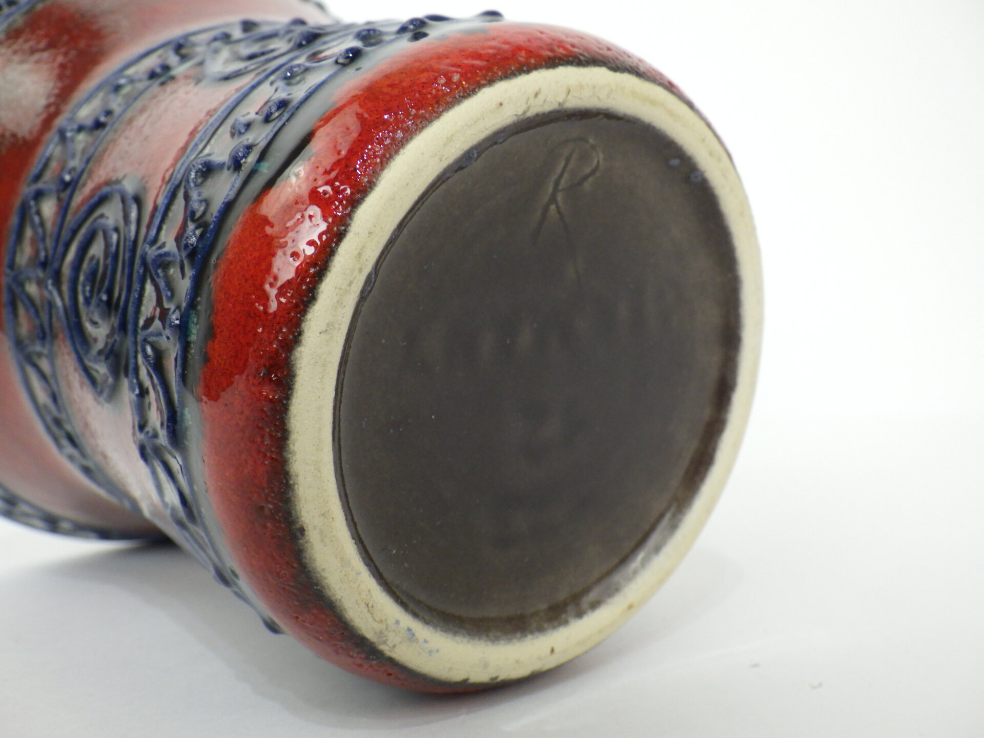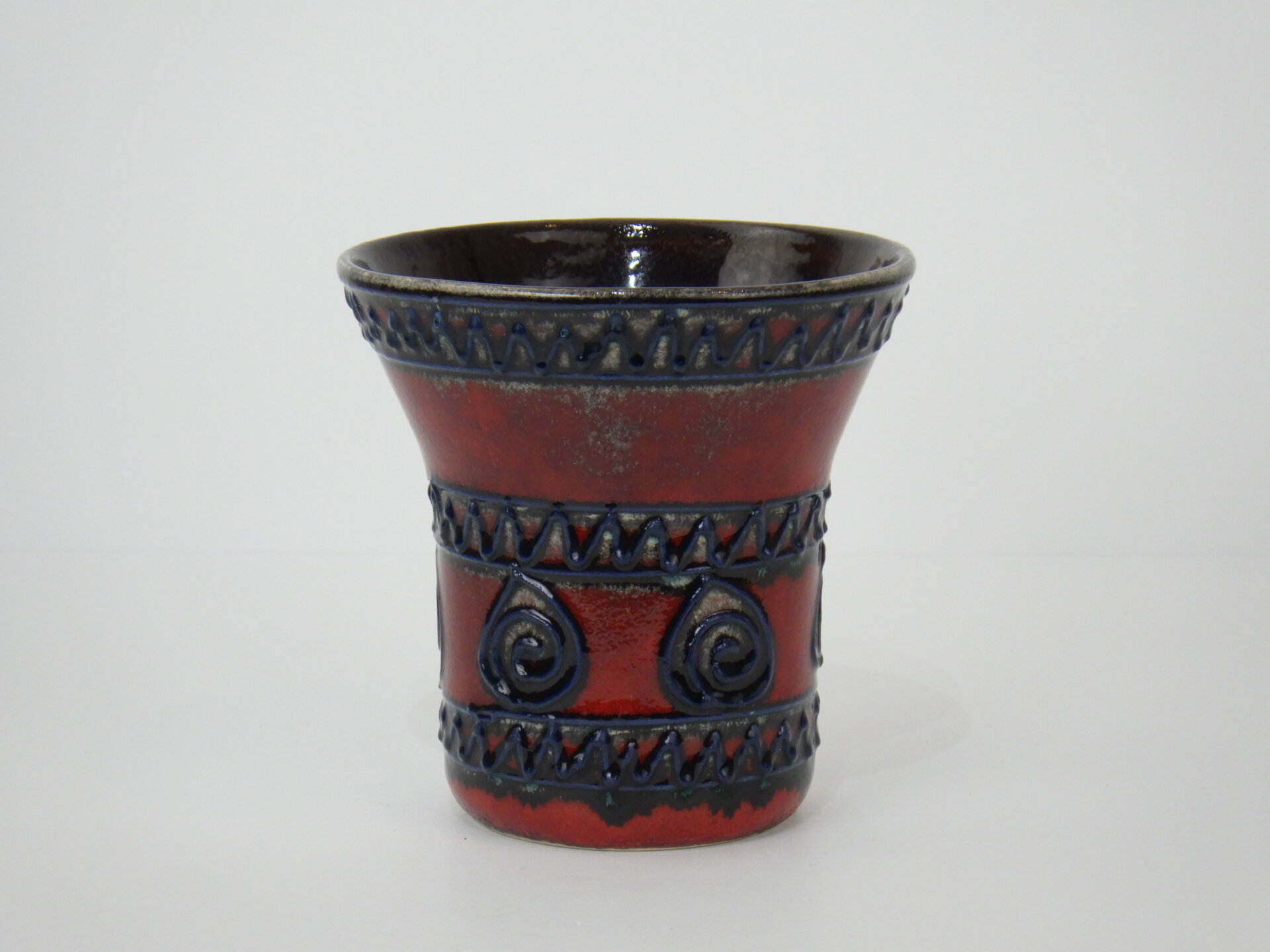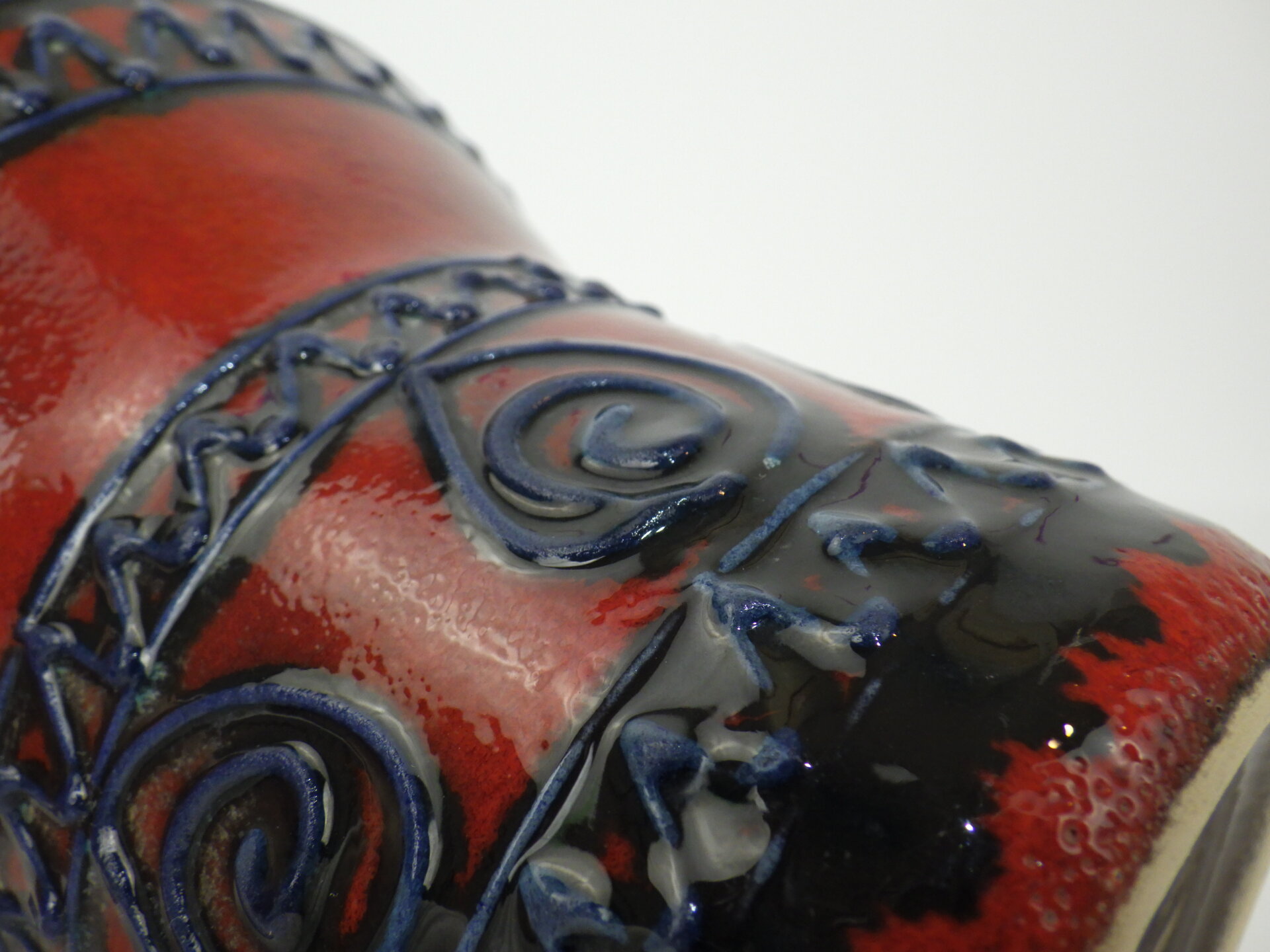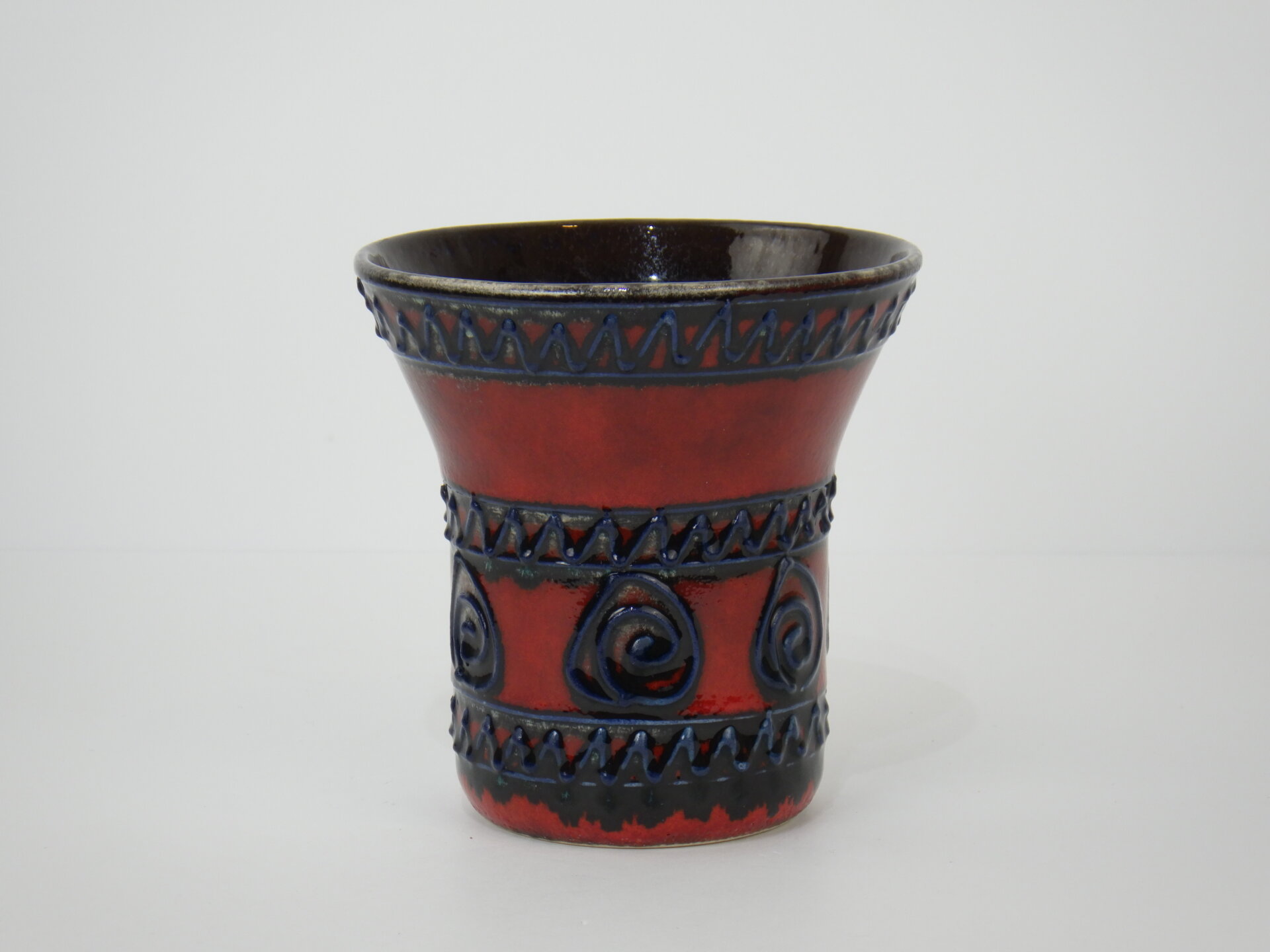 | ヨーロッパで買い付けました。 西ドイツ製、「Barlow」のフラワーベースです。 「Fat Lava」「German Art Pottery」と呼ばれるこの時代のドイツの陶器は、多くが職人による手作業で製作されており、同じシリーズでも一つとして同じ表情の物が存在しません。 情熱的なレッドと深いネイビーのコントラストが印象的な一品。 胴部をぐるりと囲むスパイラルとジグザグのレリーフは、手仕事ならではの立体感とリズムを生み出し、見る角度によって異なる表情を見せてくれます。 北欧モダンやUSミッドセンチュリー家具との相性も抜群で、花を活けずともオブジェの様に飾って楽しむのもおすすめしています。 |
