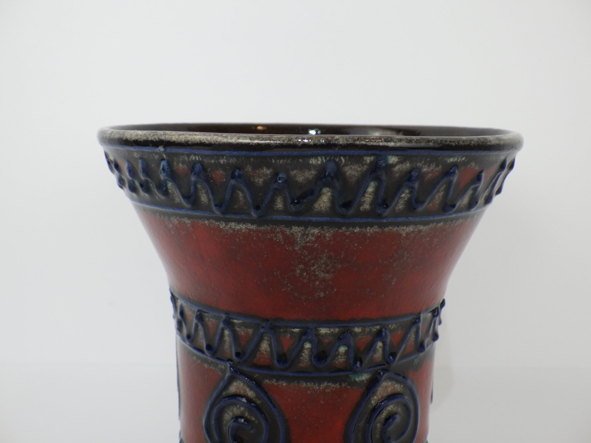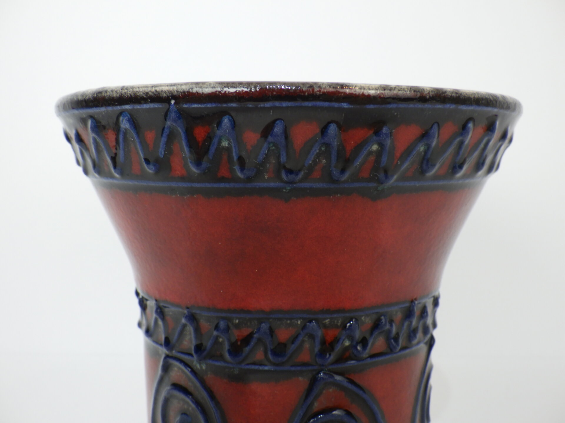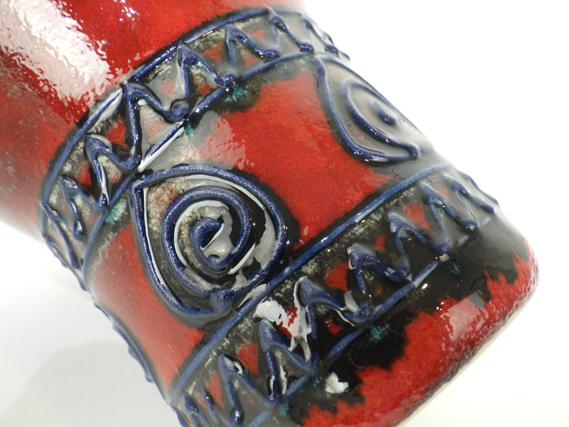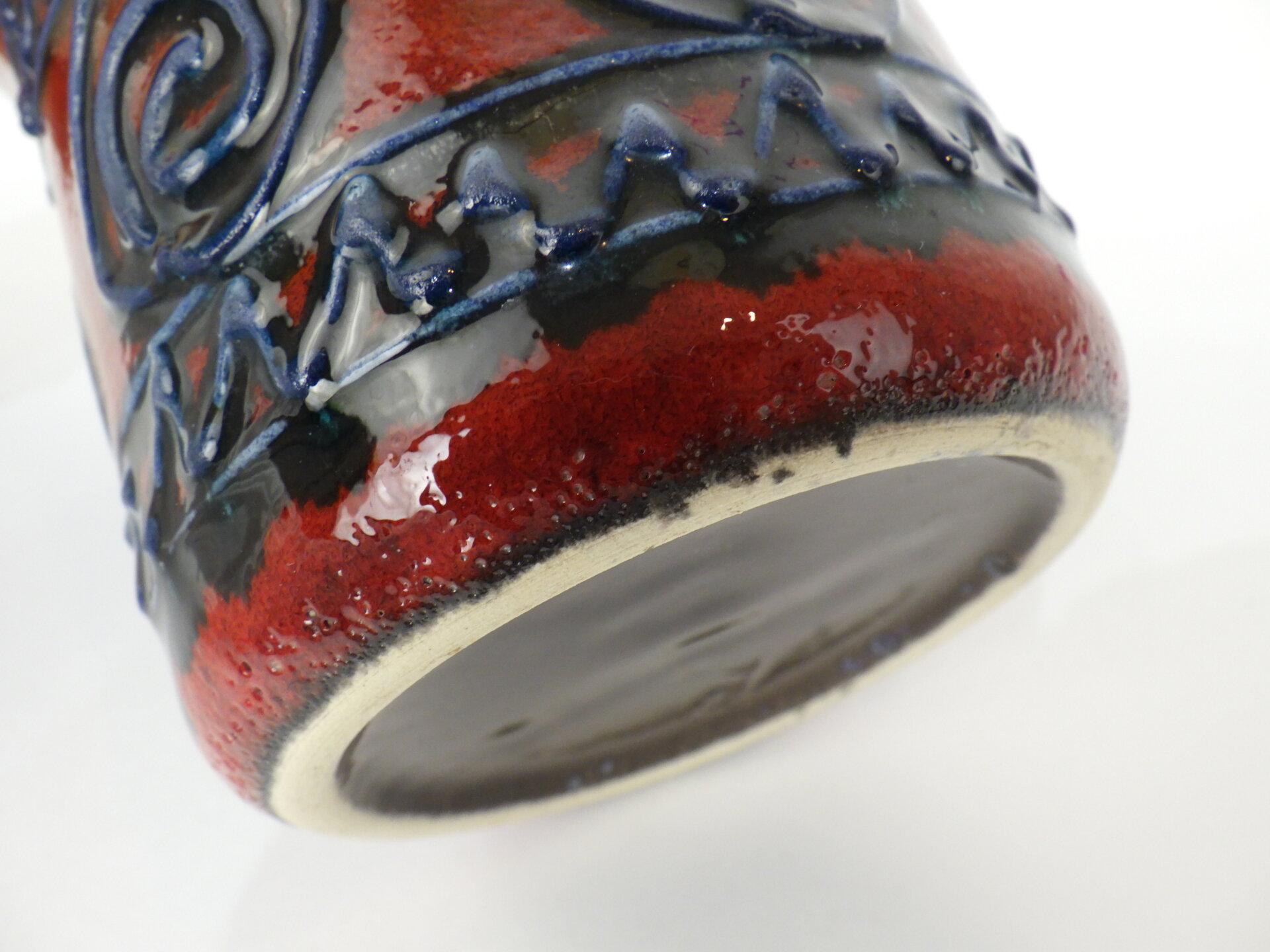 | ヨーロッパで買い付けました。 西ドイツ製、「Barlow」のフラワーベースです。 「Fat Lava」「German Art Pottery」と呼ばれるこの時代のドイツの陶器は、多くが職人による手作業で製作されており、同じシリーズでも一つとして同じ表情の物が存在しません。 情熱的なレッドと深いネイビーのコントラストが印象的な一品。 胴部をぐるりと囲むスパイラルとジグザグのレリーフは、手仕事ならではの立体感とリズムを生み出し、見る角度によって異なる表情を見せてくれます。 北欧モダンやUSミッドセンチュリー家具との相性も抜群で、花を活けずともオブジェの様に飾って楽しむのもおすすめしています。 |