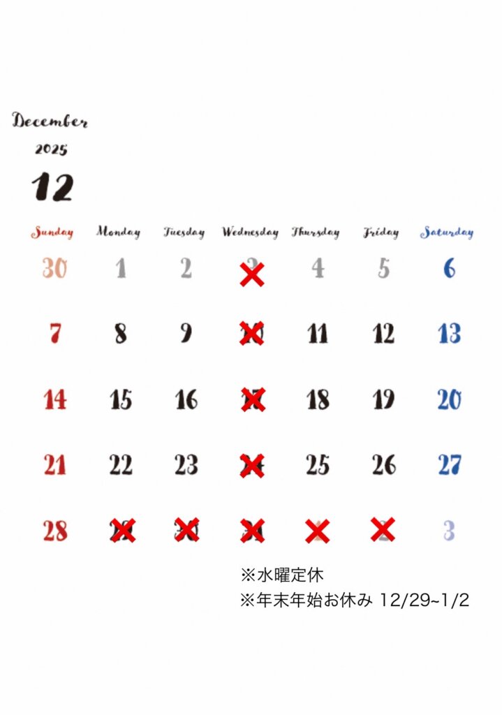画像の通り、基本的には水曜定休ですが、年末年始 12/29(月)~1/2(金)の間、臨時休業いただきます。