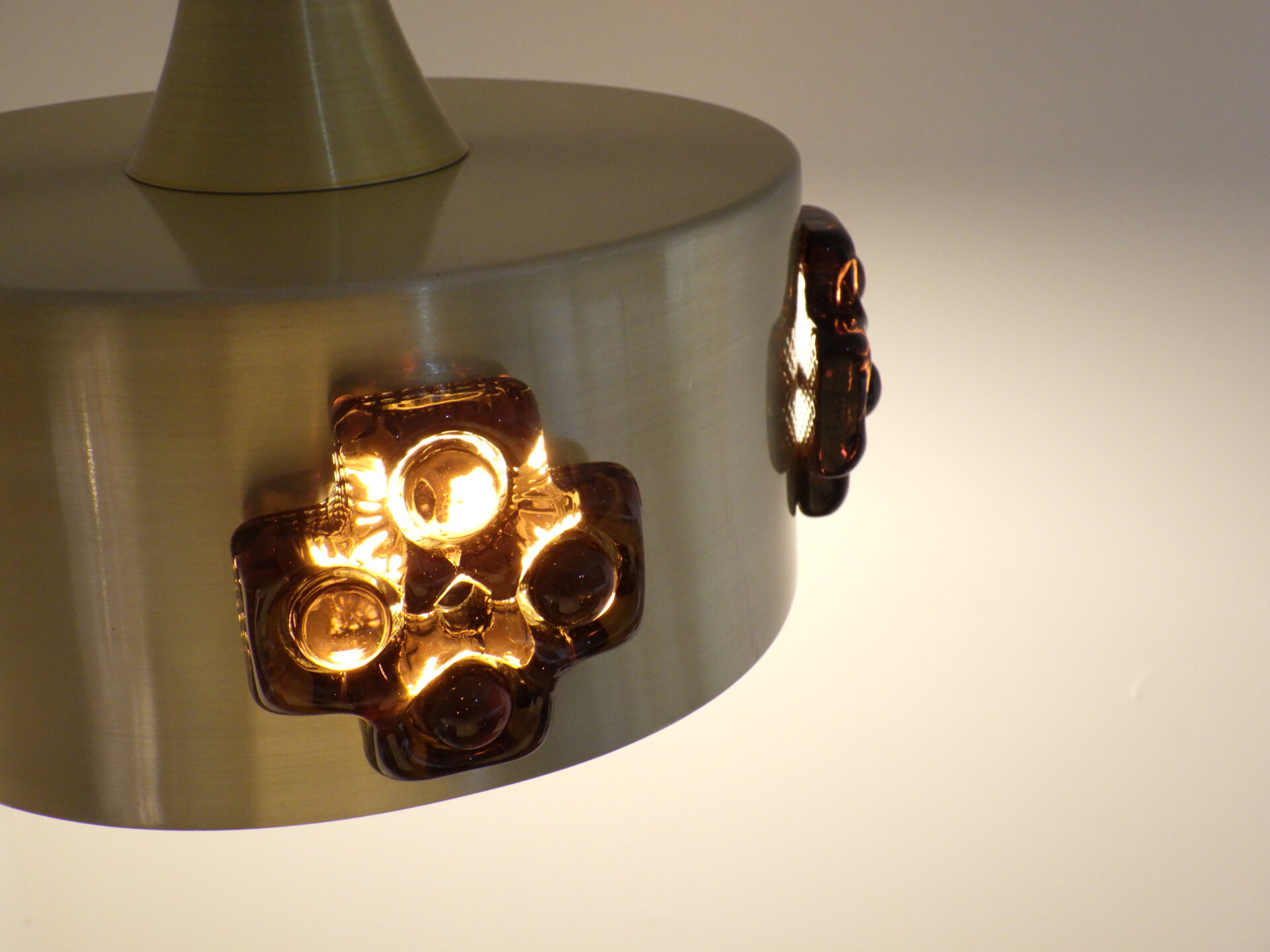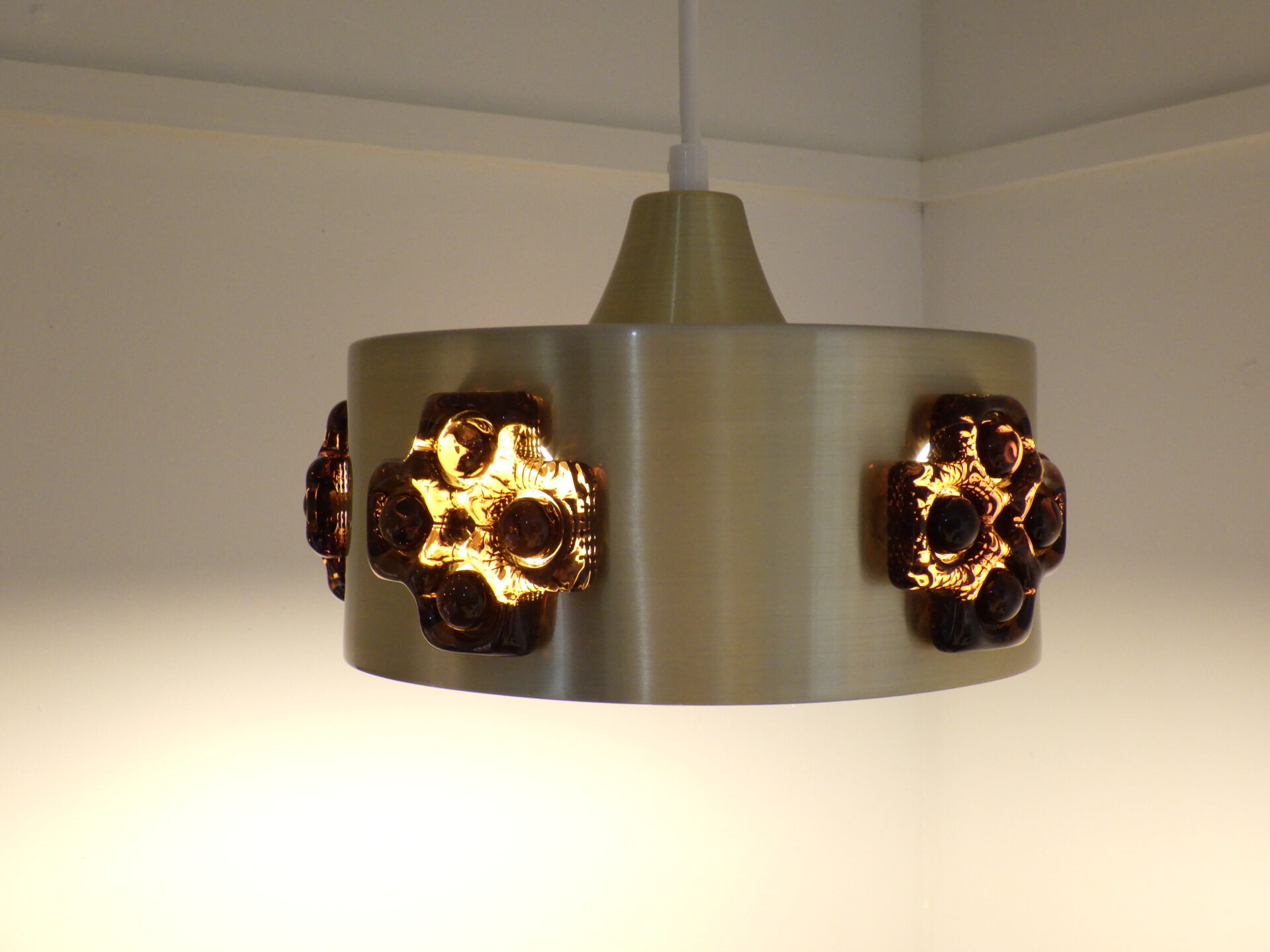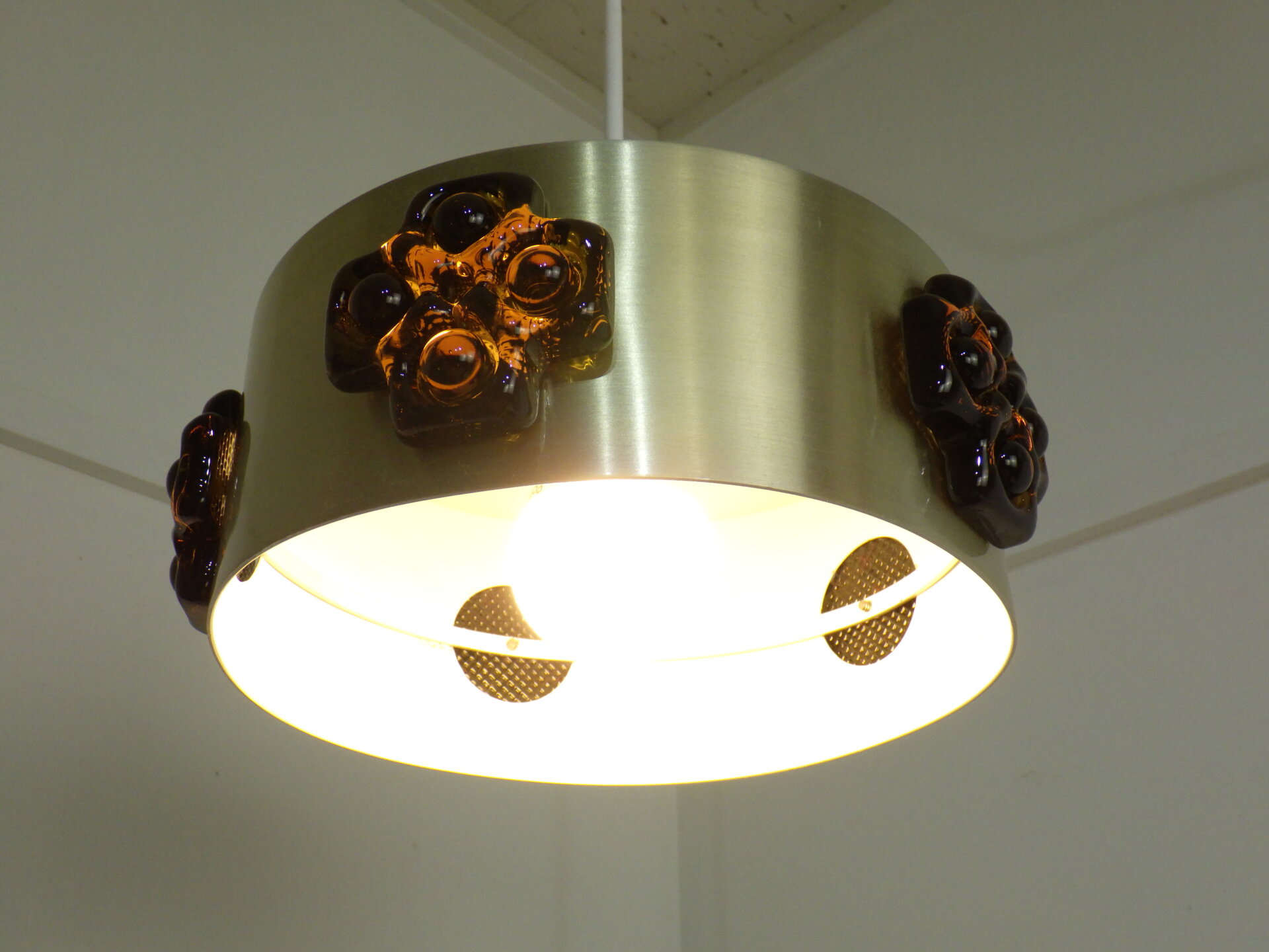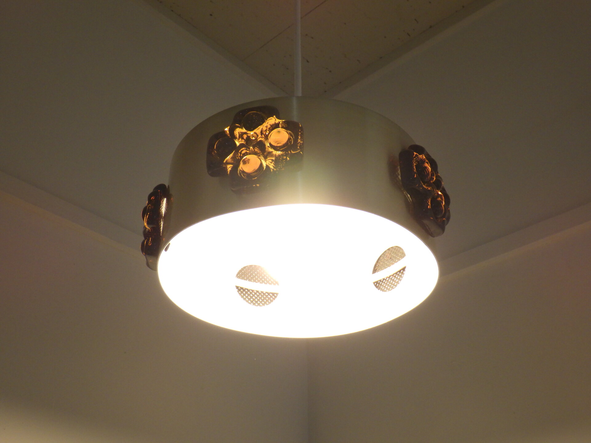 | デンマークで買い付けました。 ビンテージのペンダントランプです。 スカンジナビアンデザインらしい、スッキリとしたシェードのラインと遊び心のあるガラス装飾。 こっくりとしたアンバーカラーのガラスの装飾は、あかりを灯すとツヤ感と深みが増します。 洗練されながらも温かみのある雰囲気を醸し出してくれる、そんな照明です。 |