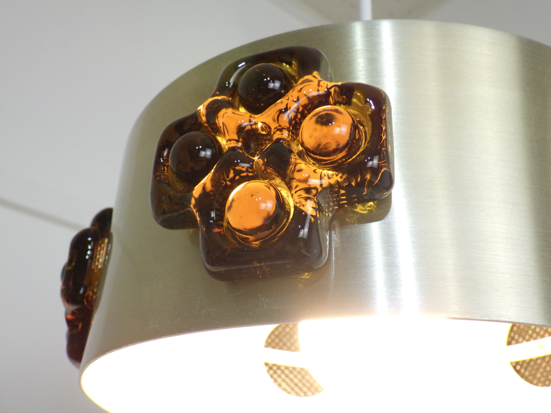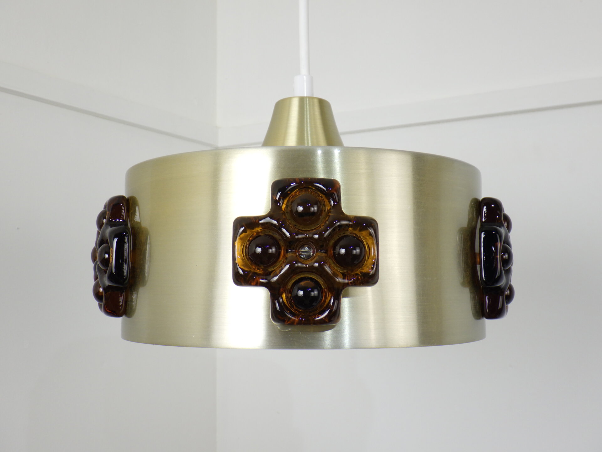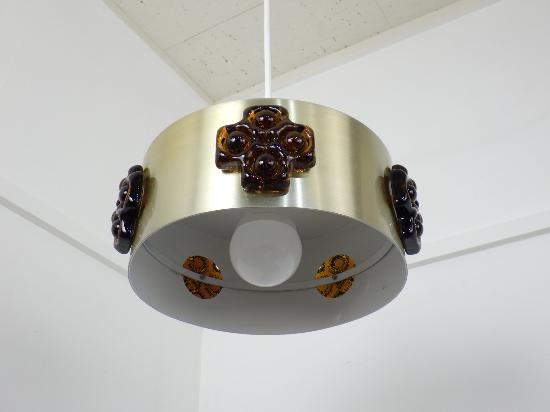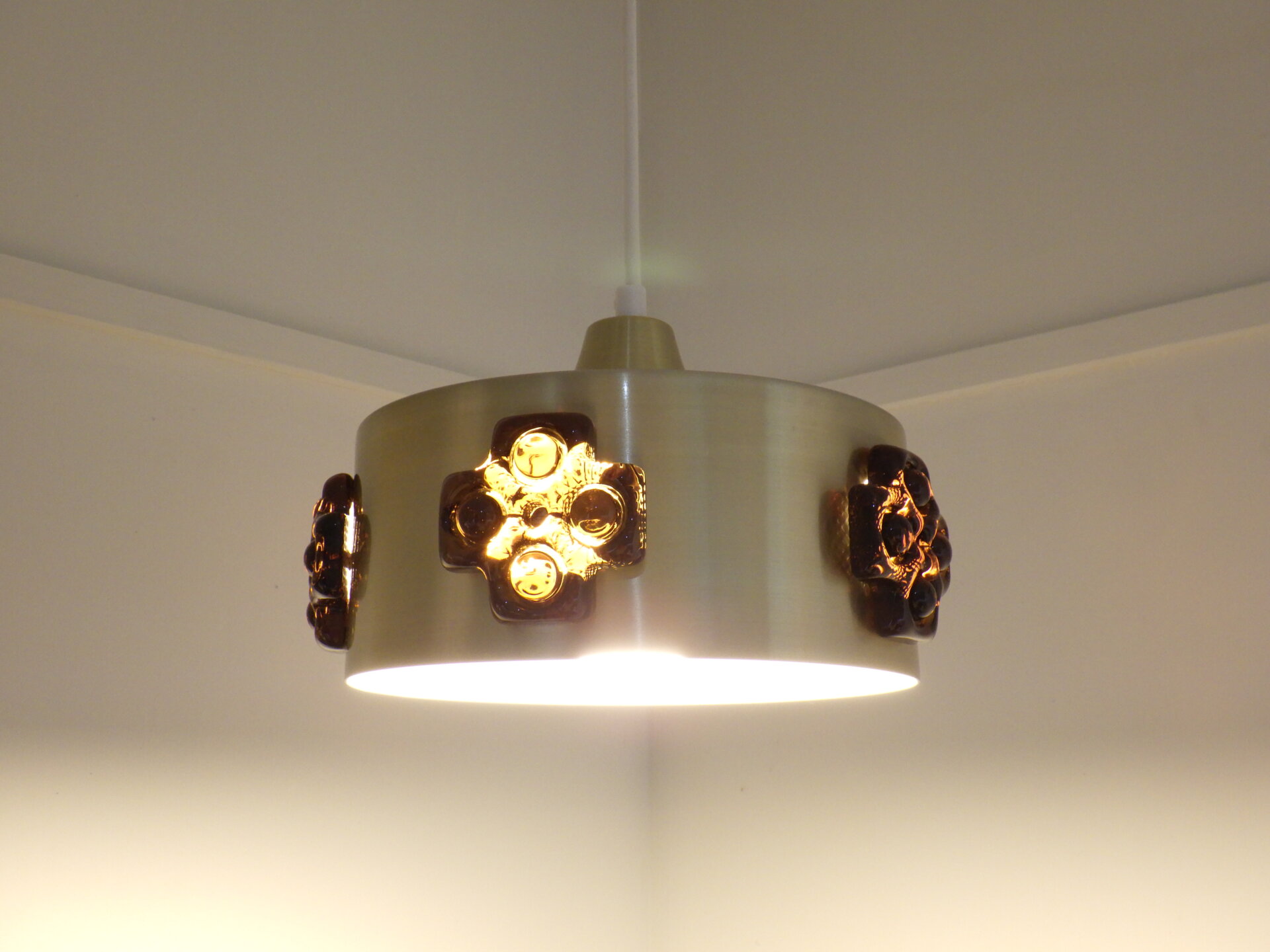 | デンマークで買い付けました。 ビンテージのペンダントランプです。 スカンジナビアンデザインらしい、スッキリとしたシェードのラインと遊び心のあるガラス装飾。 こっくりとしたアンバーカラーのガラスの装飾は、あかりを灯すとツヤ感と深みが増します。 洗練されながらも温かみのある雰囲気を醸し出してくれる、そんな照明です。 |