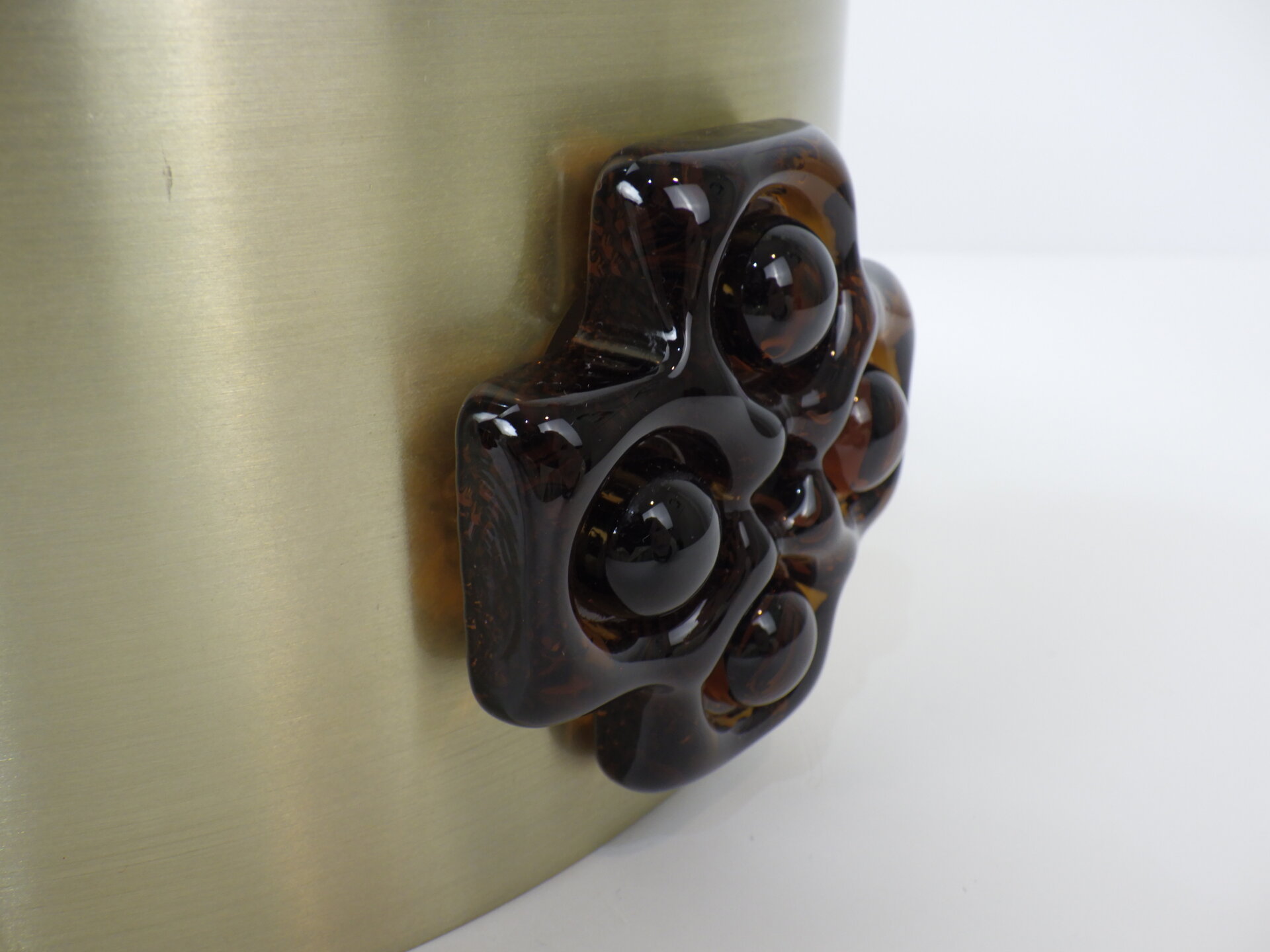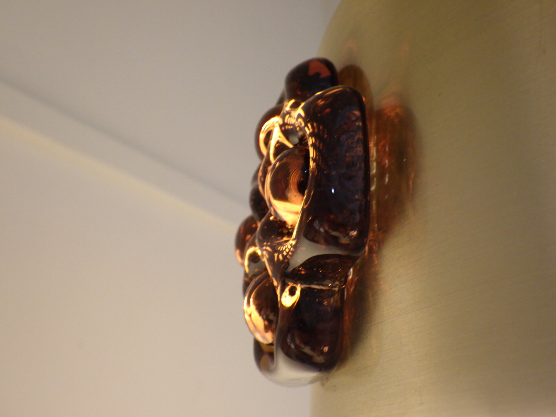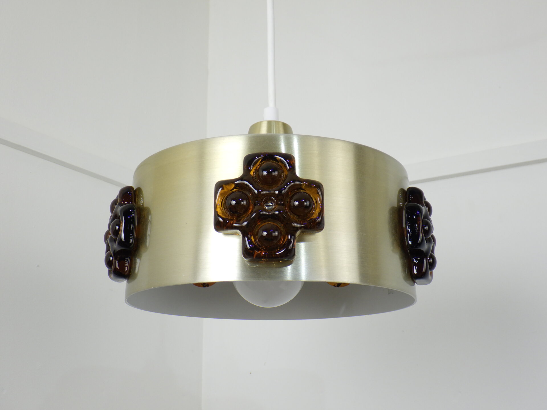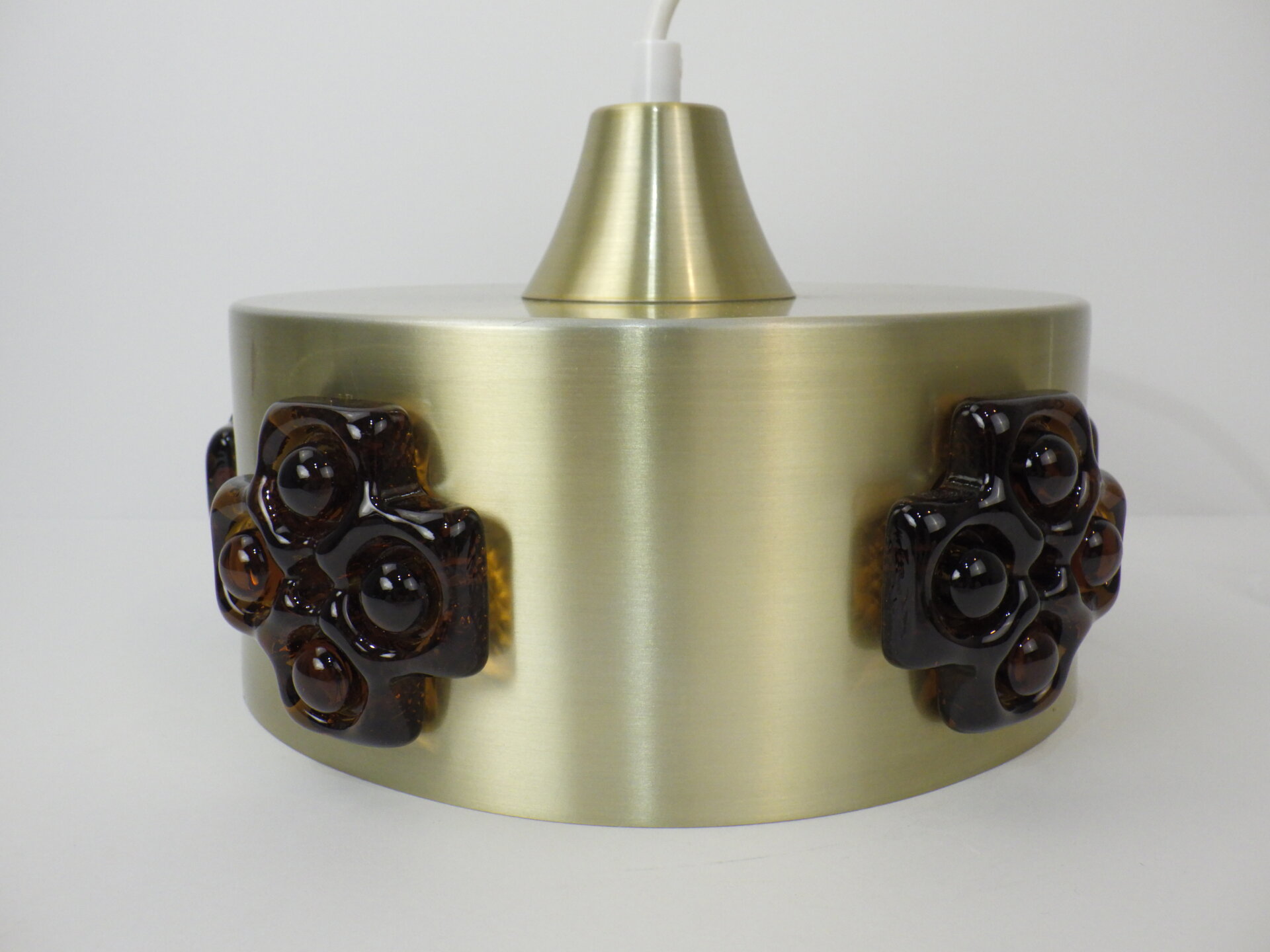 | デンマークで買い付けました。 ビンテージのペンダントランプです。 スカンジナビアンデザインらしい、スッキリとしたシェードのラインと遊び心のあるガラス装飾。 こっくりとしたアンバーカラーのガラスの装飾は、あかりを灯すとツヤ感と深みが増します。 洗練されながらも温かみのある雰囲気を醸し出してくれる、そんな照明です。 |