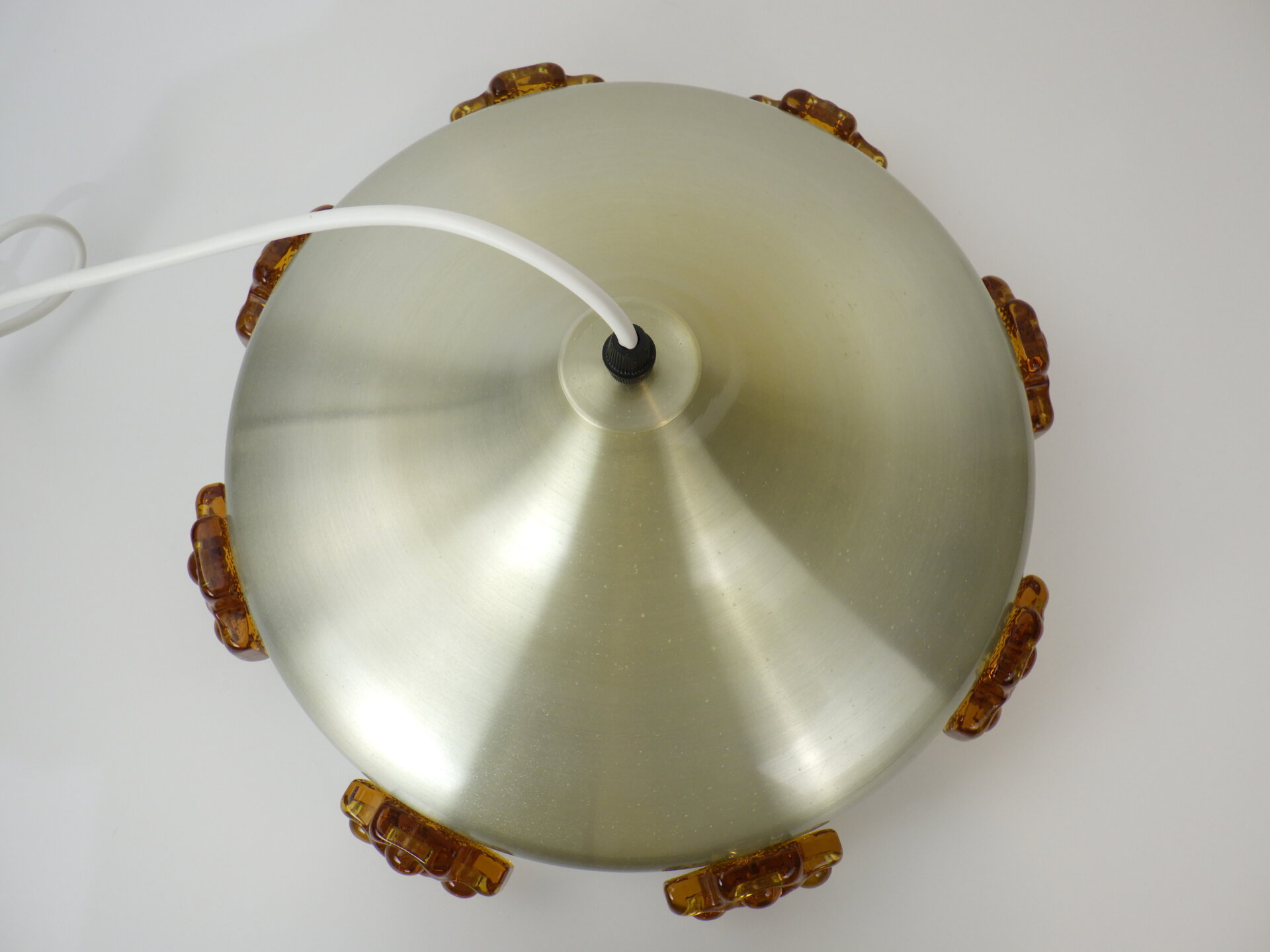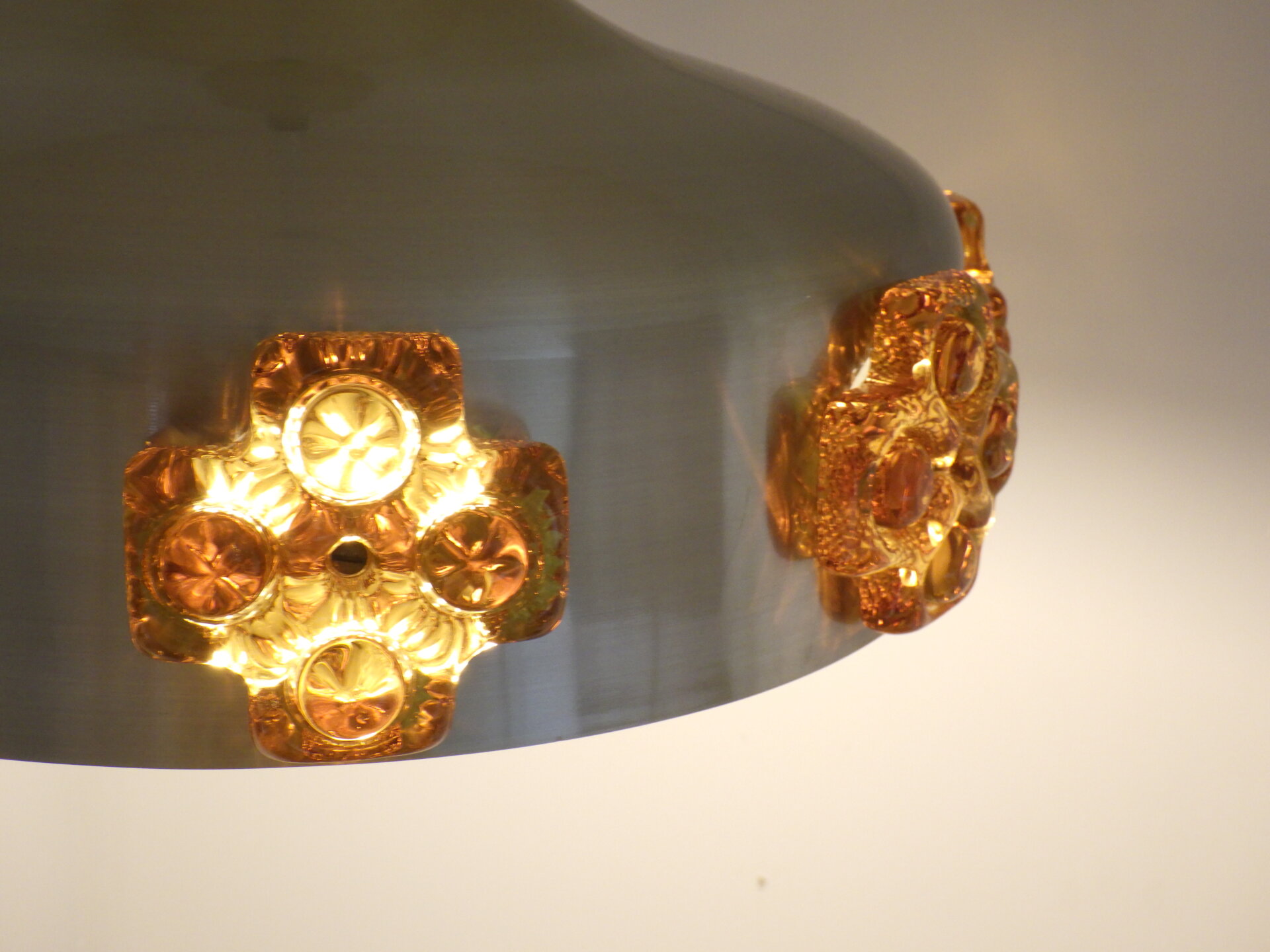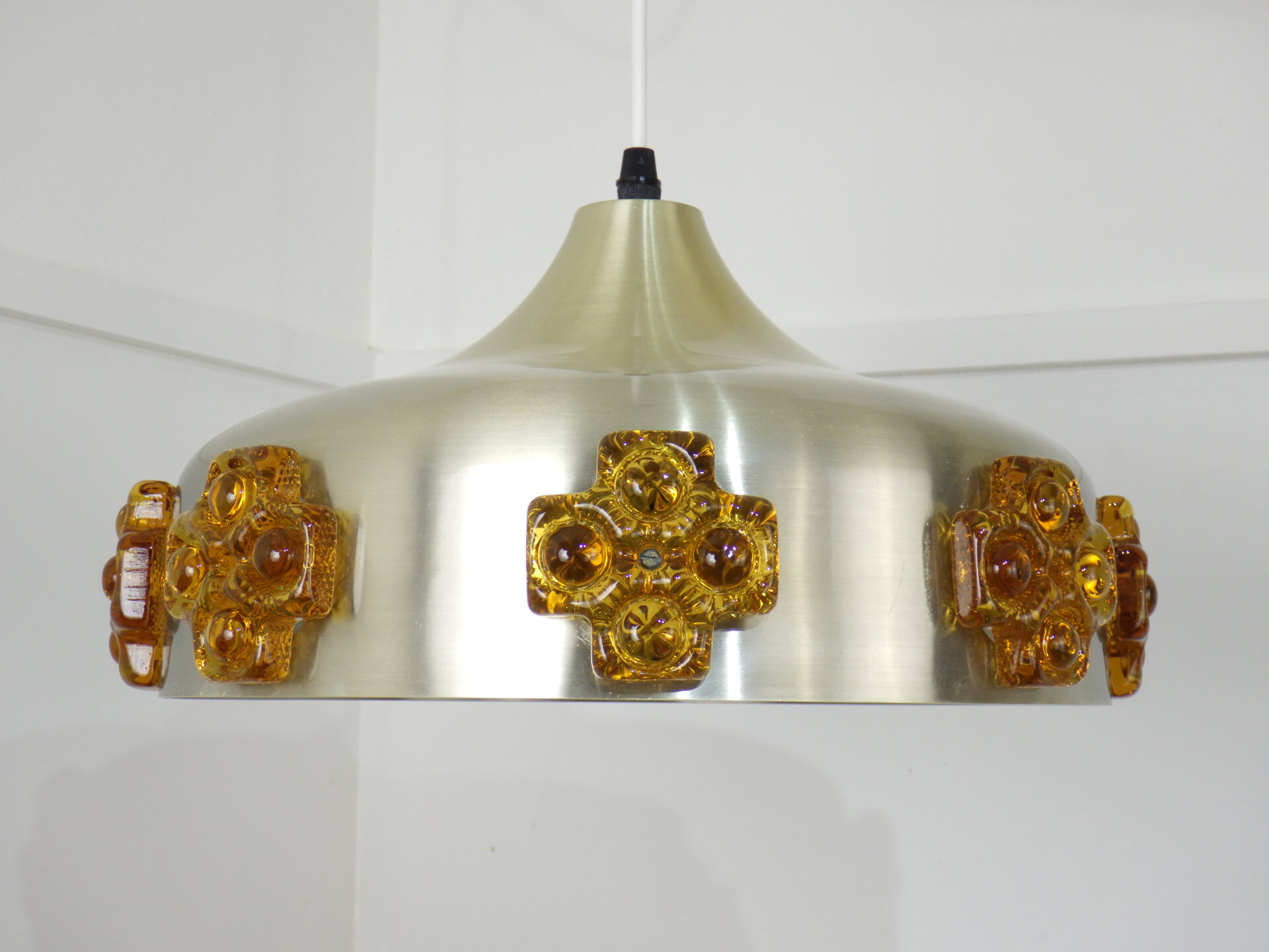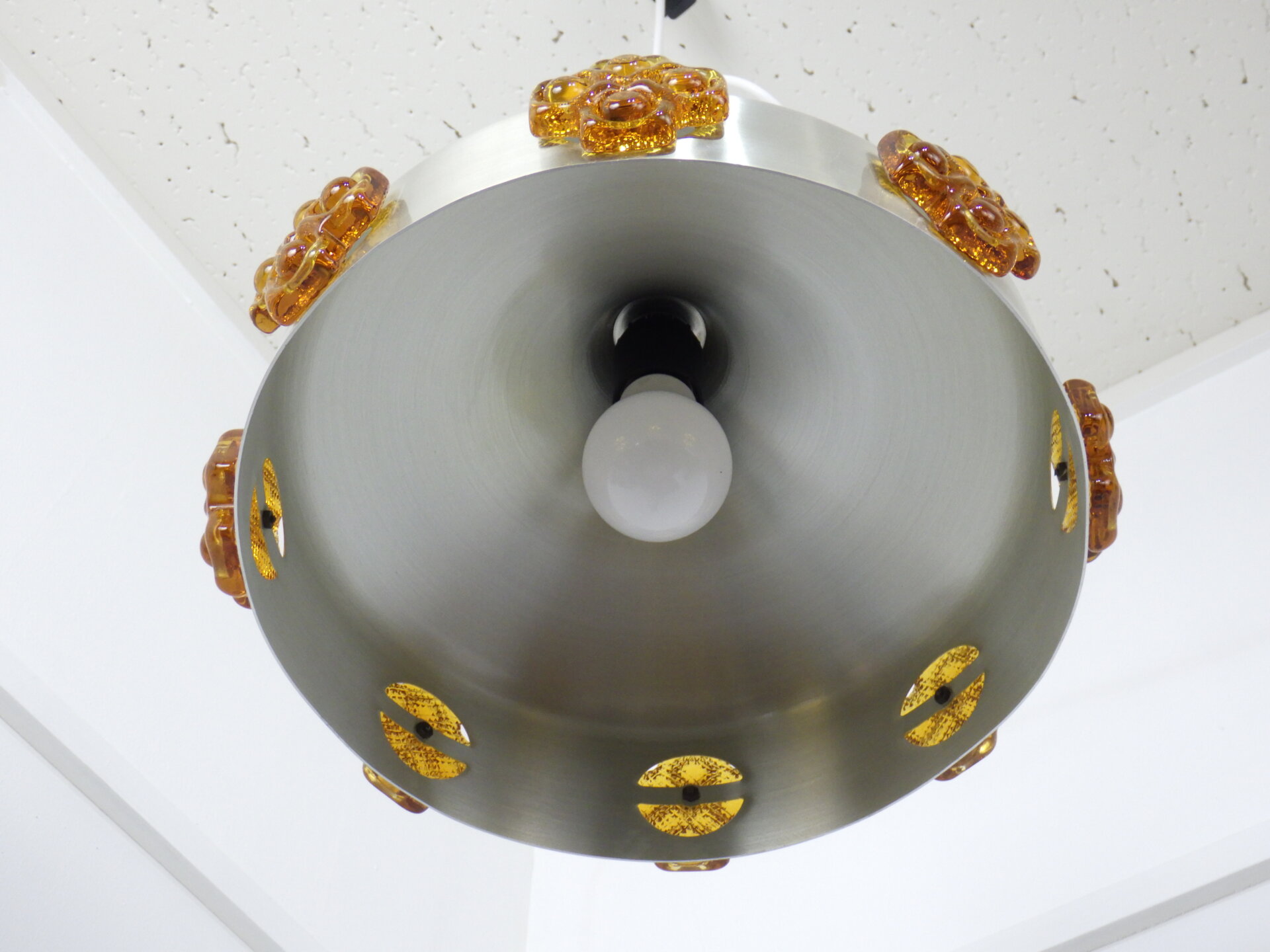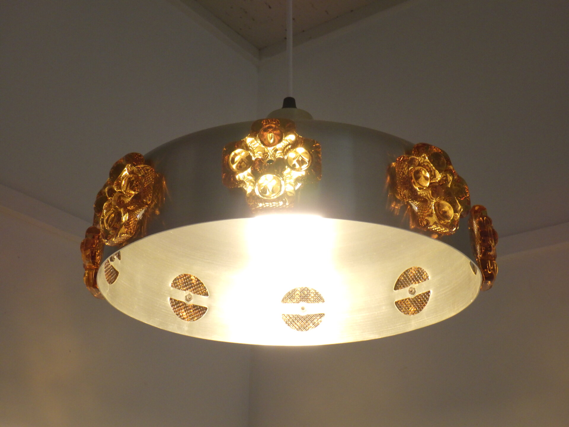 | デンマークで買い付けました。 ビンテージのペンダントランプです。 スカンジナビアンデザインらしい、スッキリとしたシェードのラインと遊び心のあるガラス装飾。 こっくりとしたアンバーカラーのガラスの装飾は、あかりを灯すとツヤ感と深みが増します。 洗練されながらも温かみのある雰囲気を醸し出してくれる、そんな照明です。 |