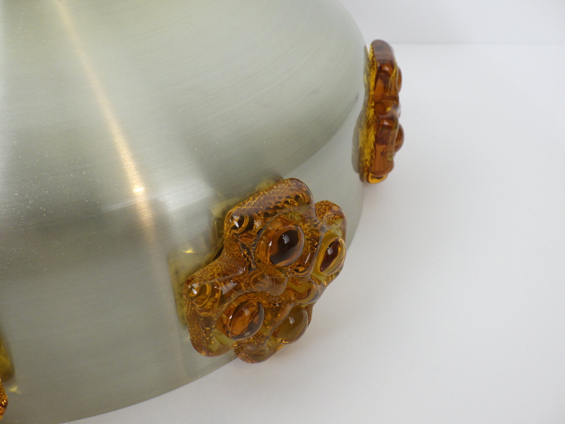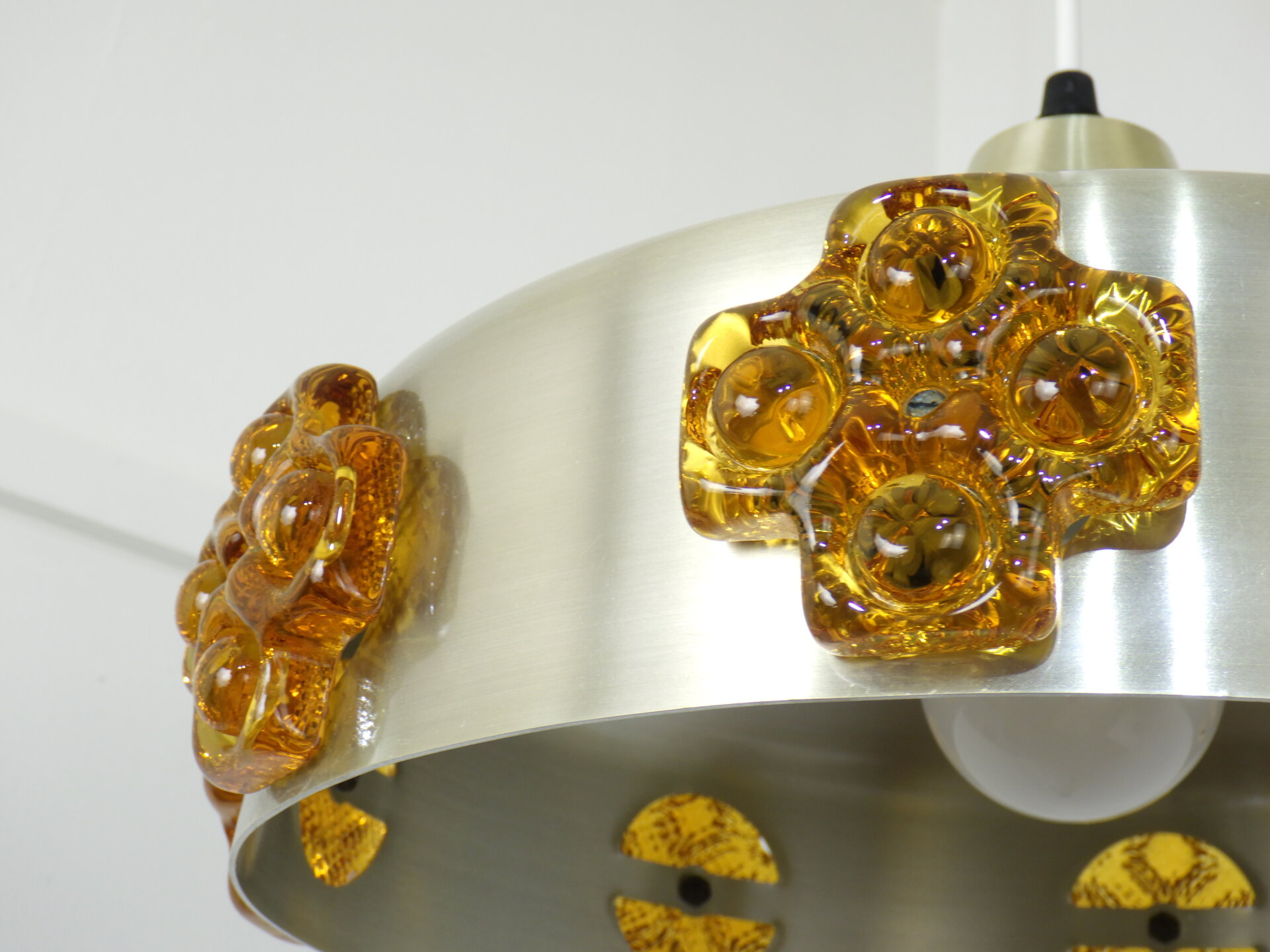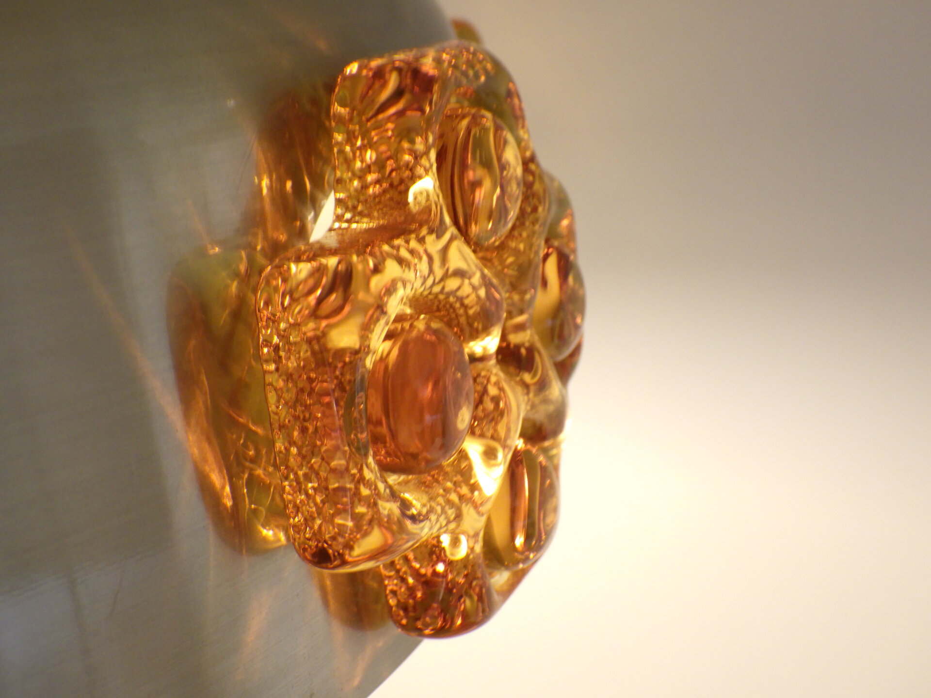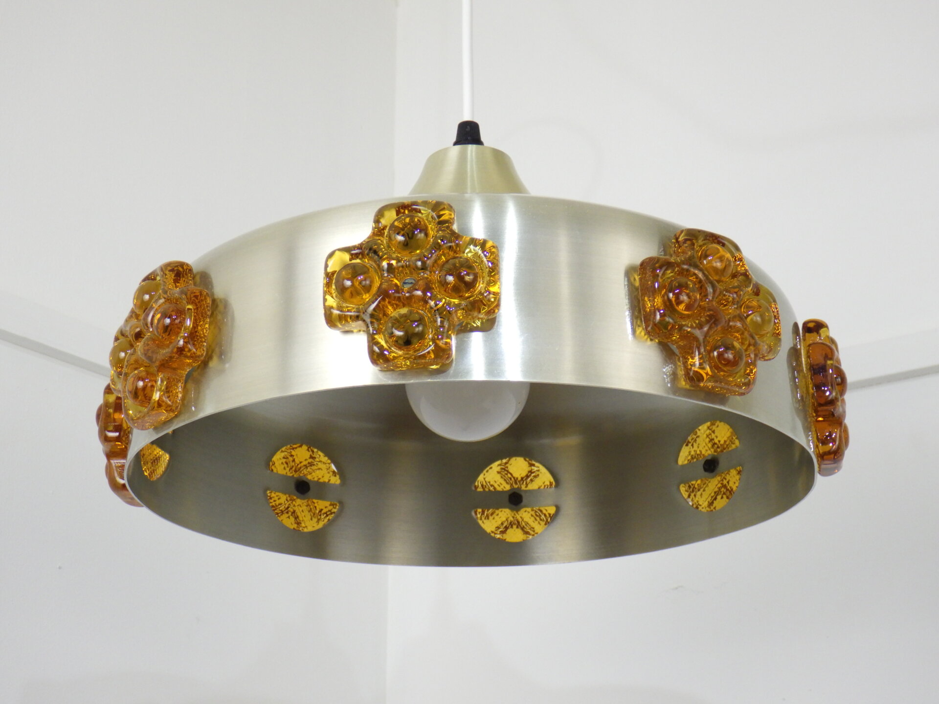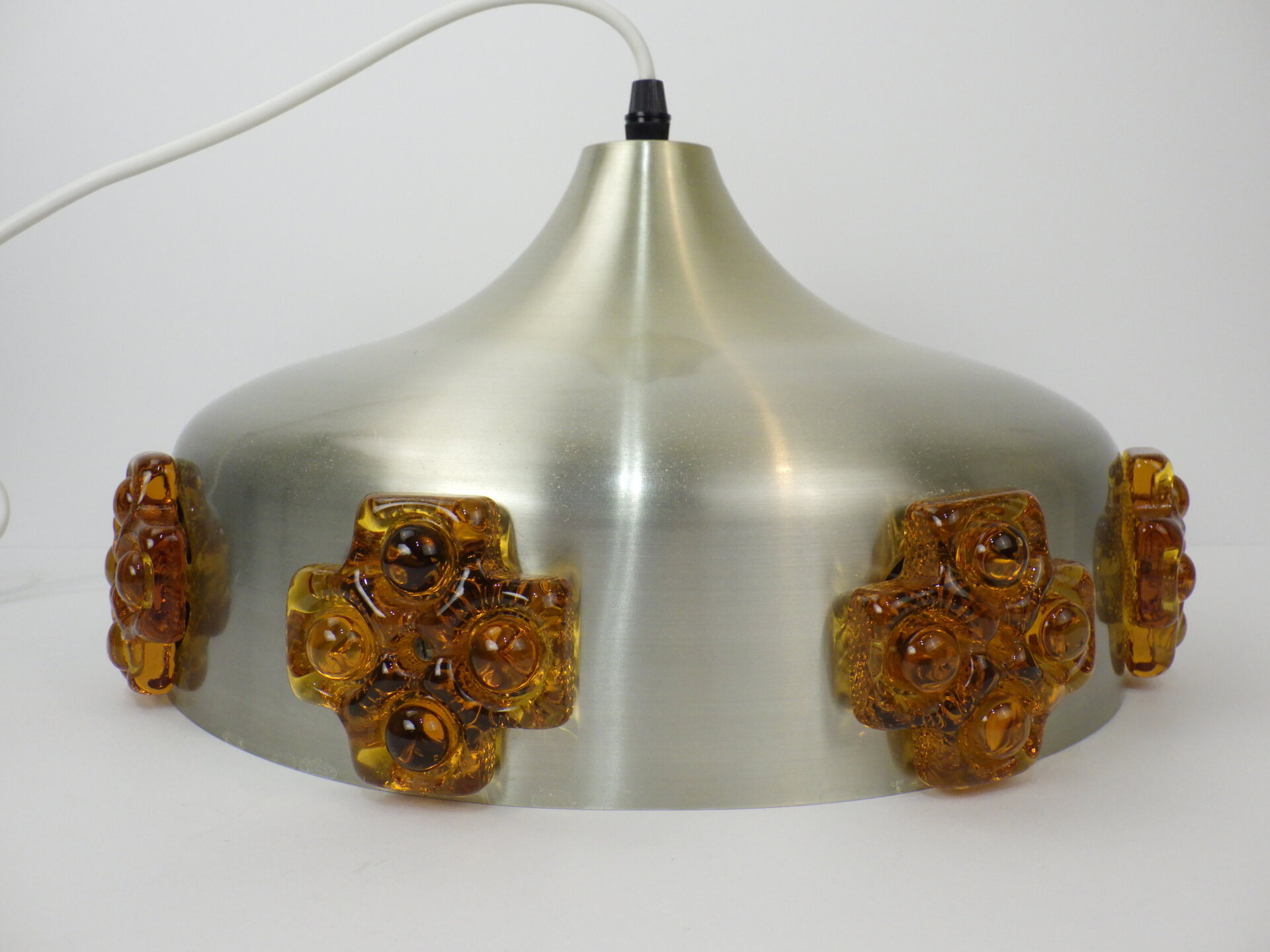 | デンマークで買い付けました。 ビンテージのペンダントランプです。 スカンジナビアンデザインらしい、スッキリとしたシェードのラインと遊び心のあるガラス装飾。 こっくりとしたアンバーカラーのガラスの装飾は、あかりを灯すとツヤ感と深みが増します。 洗練されながらも温かみのある雰囲気を醸し出してくれる、そんな照明です。 |