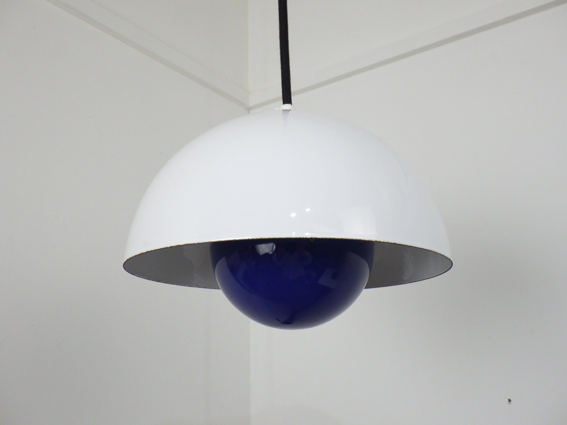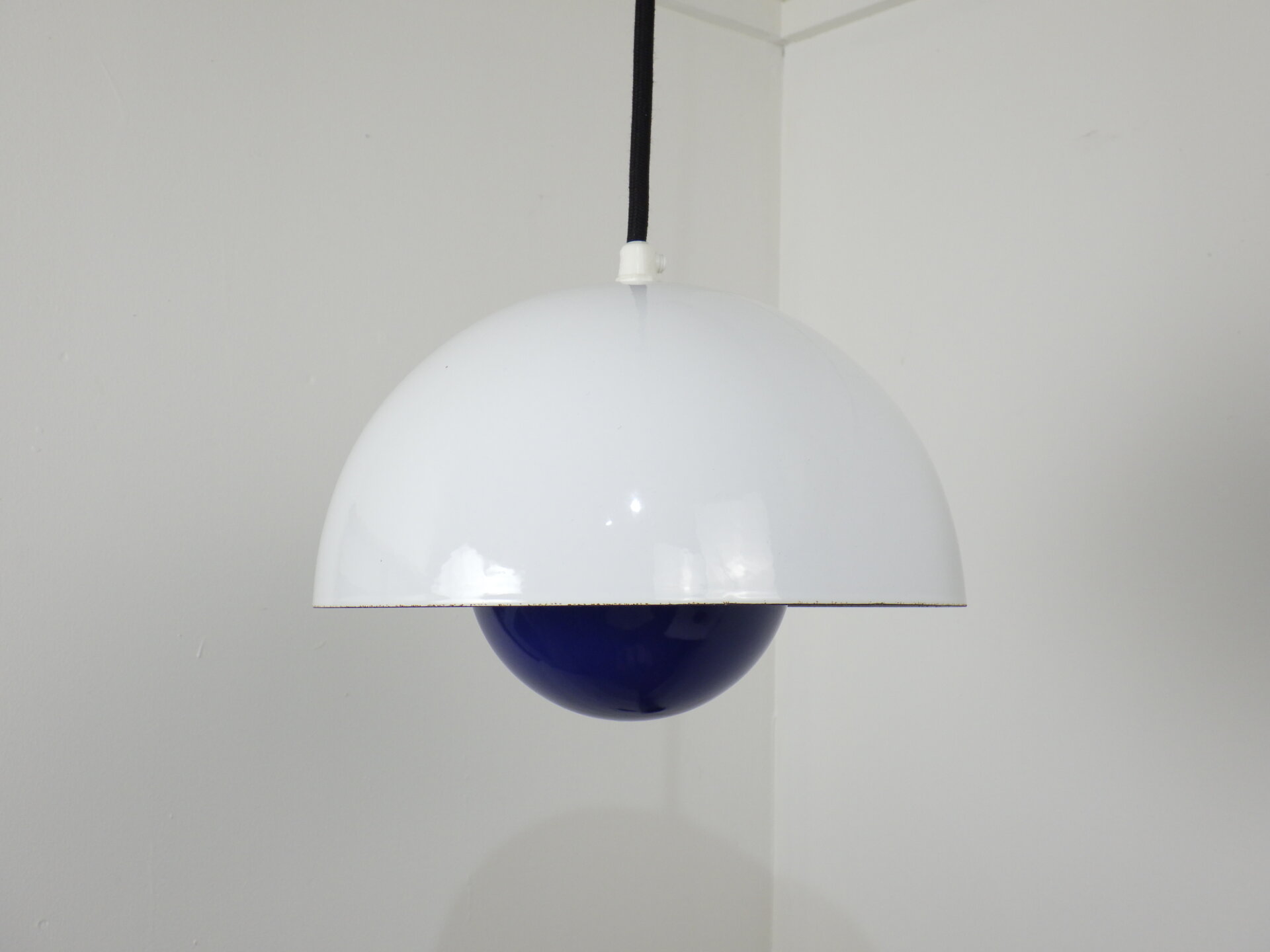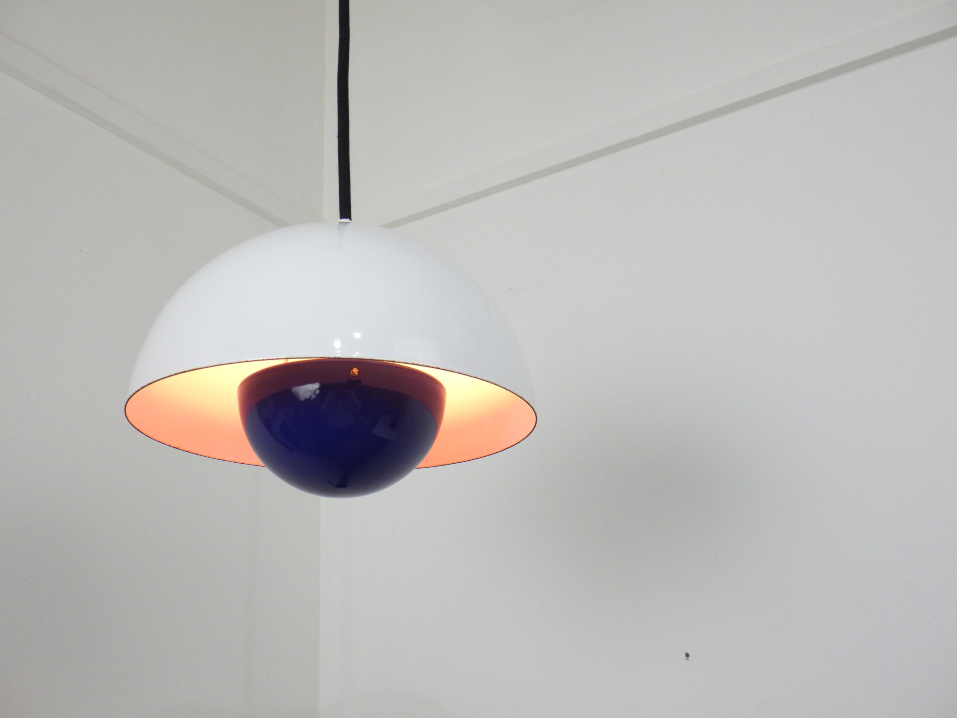 | デンマークで買い付けました。 Verner Panton(ヴェルナー・パントン)デザイン、Louis Poulsen(ルイスポールセン)社から発表されたフラワーポット ペンダントランプです。 何度も復刻されていますが、こちらはエナメル製のビンテージ。 半球を組み合わせたシンプルな幾何学状が、ミッドセンチュリーから現代のインテリアまで自然に溶け込み、空間をスタイリッシュに引き締めてくれます。 また、下部の半球の内側にはオレンジの塗装がされているため、灯りを灯すと上部のシェードに反射してほんのり色づきます。 ただの照明としてではなく、アートを飾るような感覚で照明を楽しみたい方におすすめのアイテムです。 |