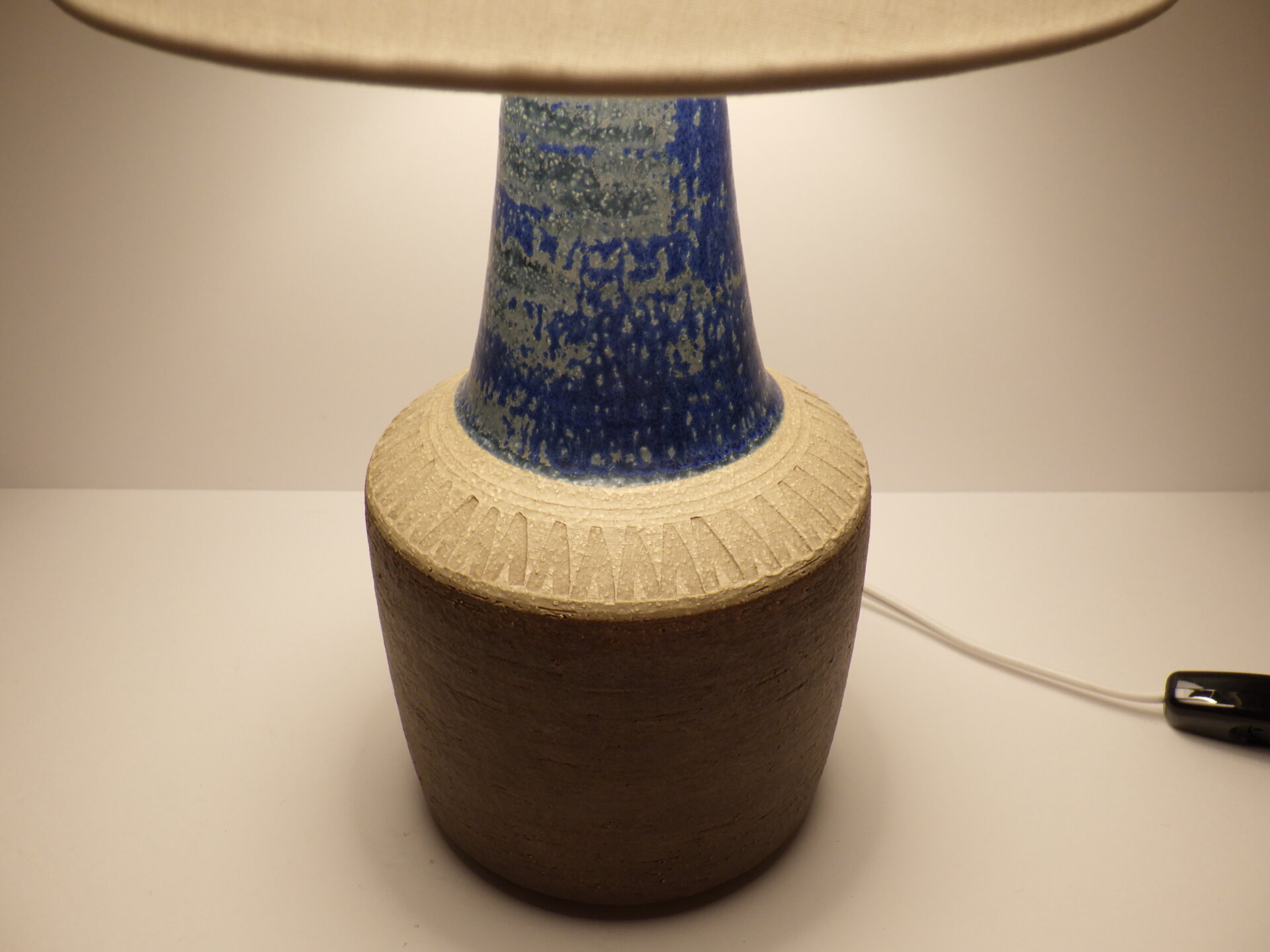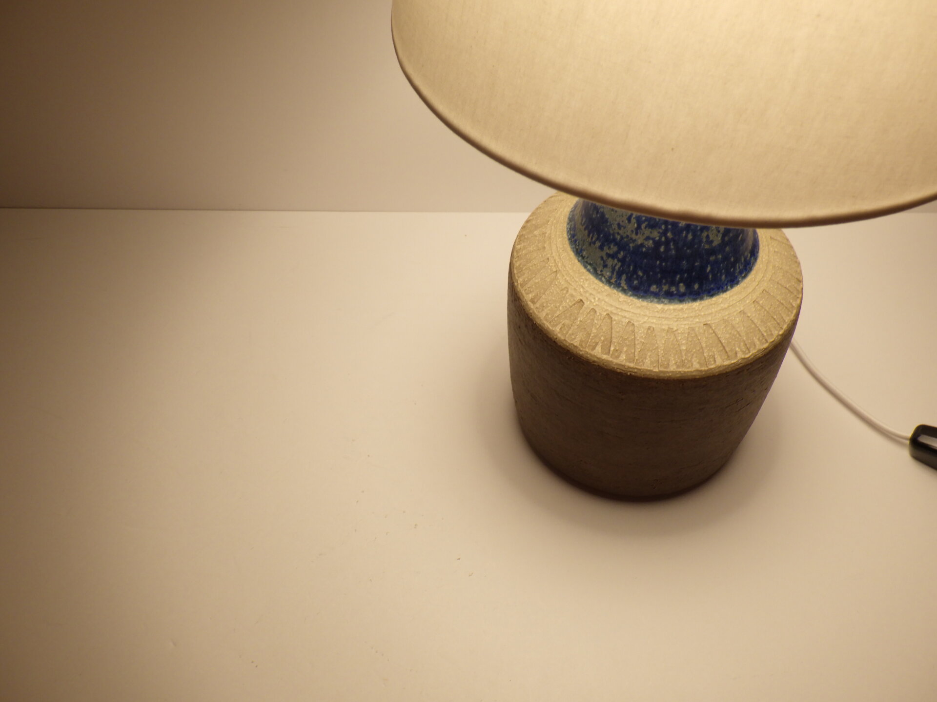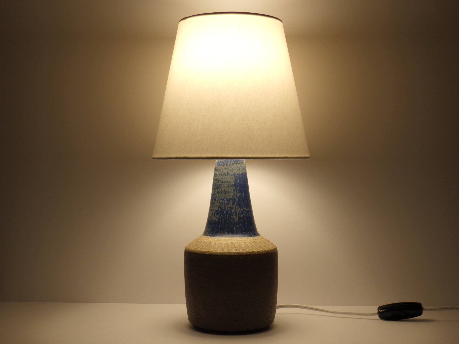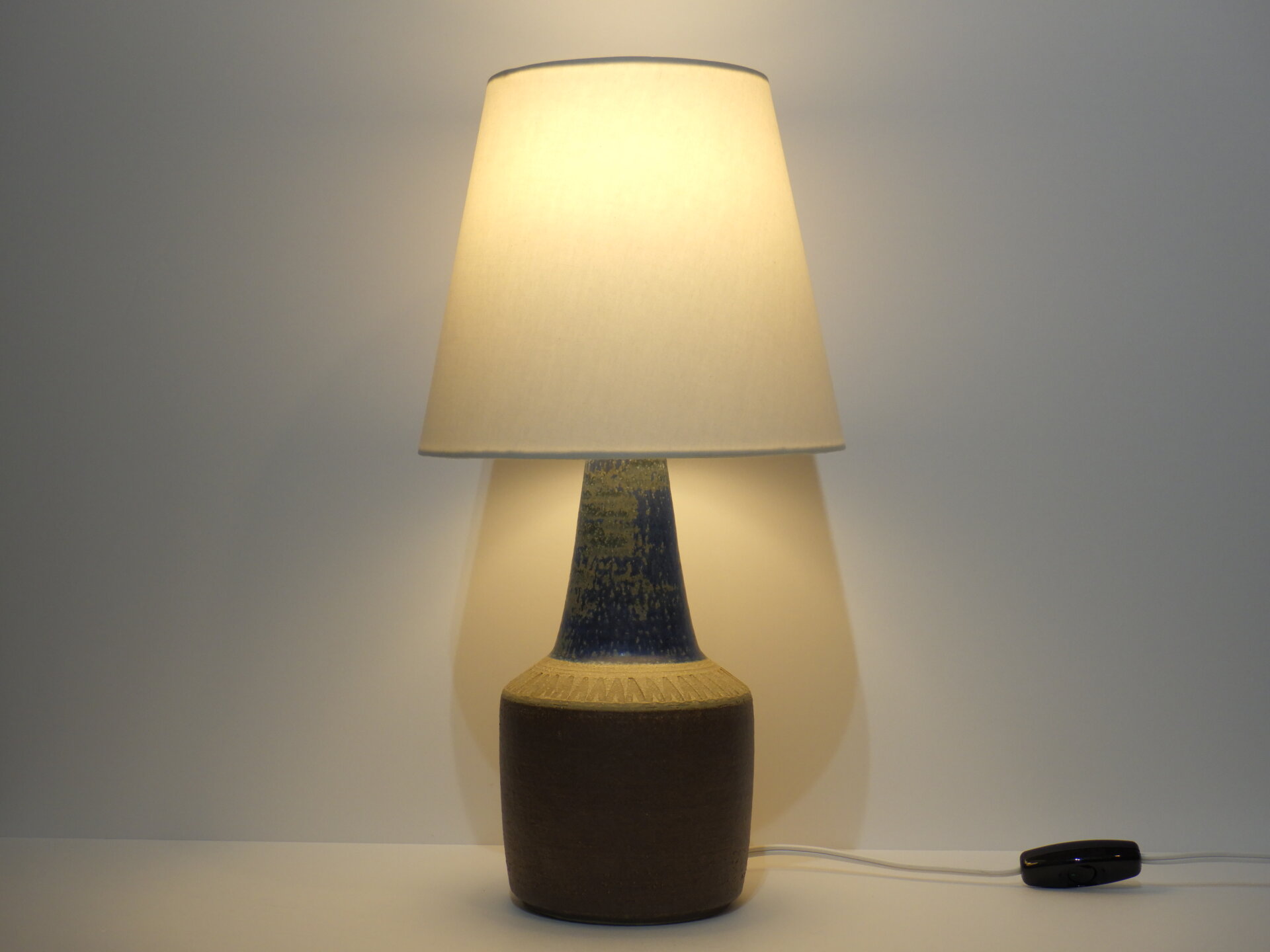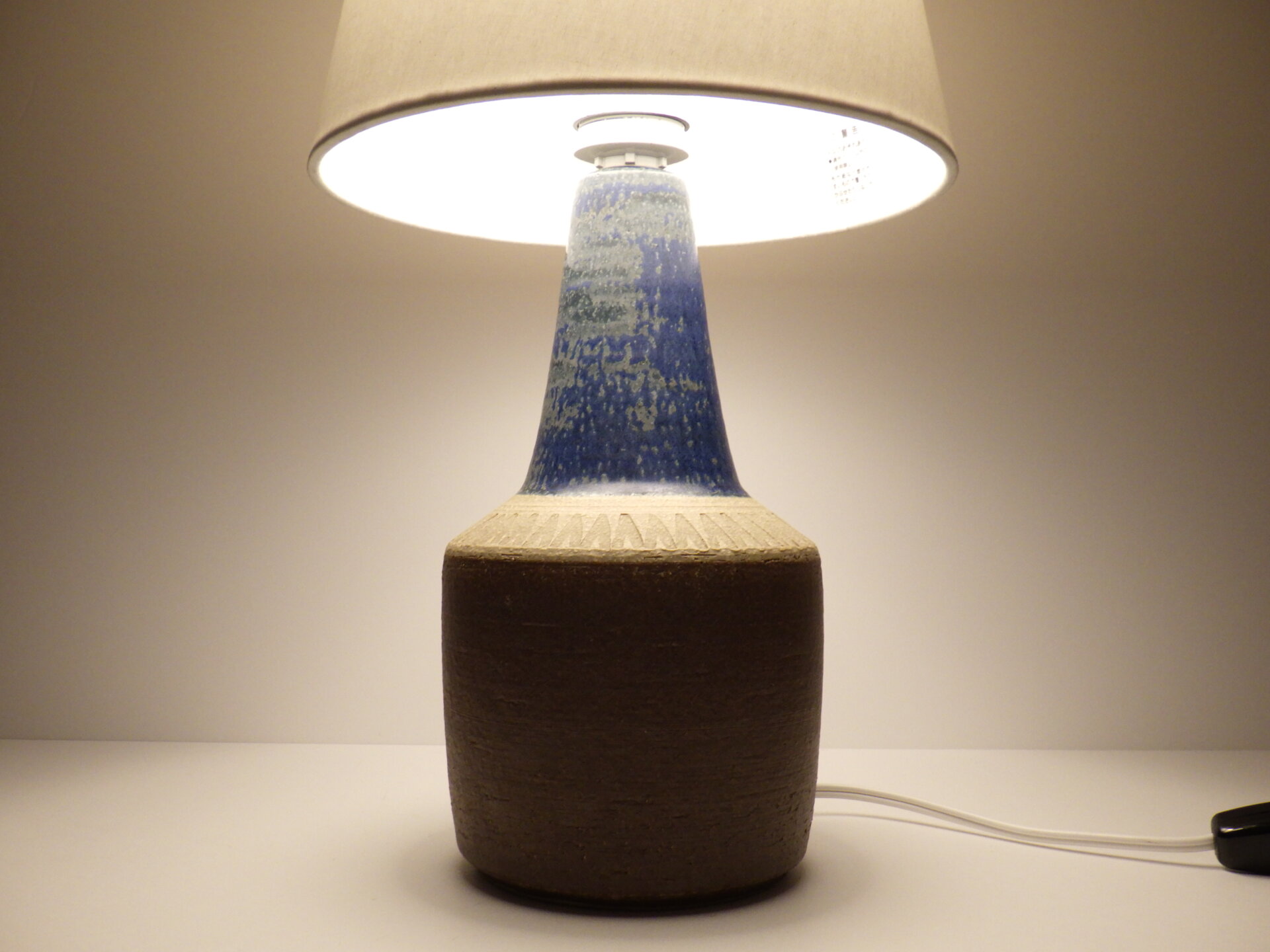 | ヨーロッパで買い付けました。 デンマーク、ボーンホルム島で1835年に創業した「Soholm」のテーブルランプです。 こちらはスーホルムで多くのデザインを手掛けたEinar Johansenのデザイン。 素地部分に放射線状に刻まれた彫りが、シンプルなフォルムにリズム感を与え、照明としてだけでなくオブジェとしても美しい存在感を放ちます。 濃淡が揺らぐブルーの釉薬は、光の当たり方で印象が変わり、夜はより深く、昼は鮮やかに映えますね。 土のあたたかみを残しつつもモダンな佇まいなので、北欧インテリアはもちろん、USミッドセンチュリーや和の空間にも自然に溶け込みます。 小ぶりながらも存在感があり、置くだけで空間の温度が一段上がるような、北欧陶器ならではの質感と美しさが際立つランプですね。 コード部分のスイッチでON/OFFが切り替えられます。 (電球の口金サイズ:E26 LED対応) |