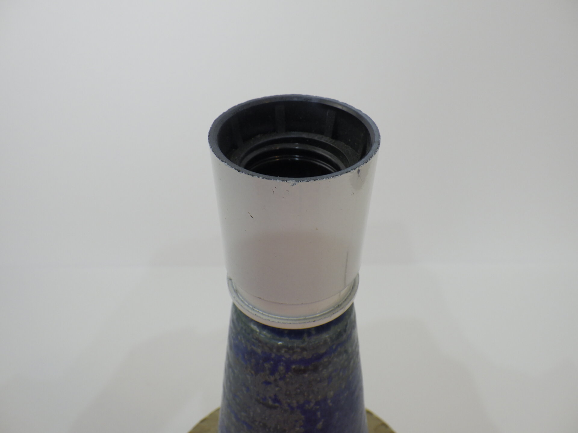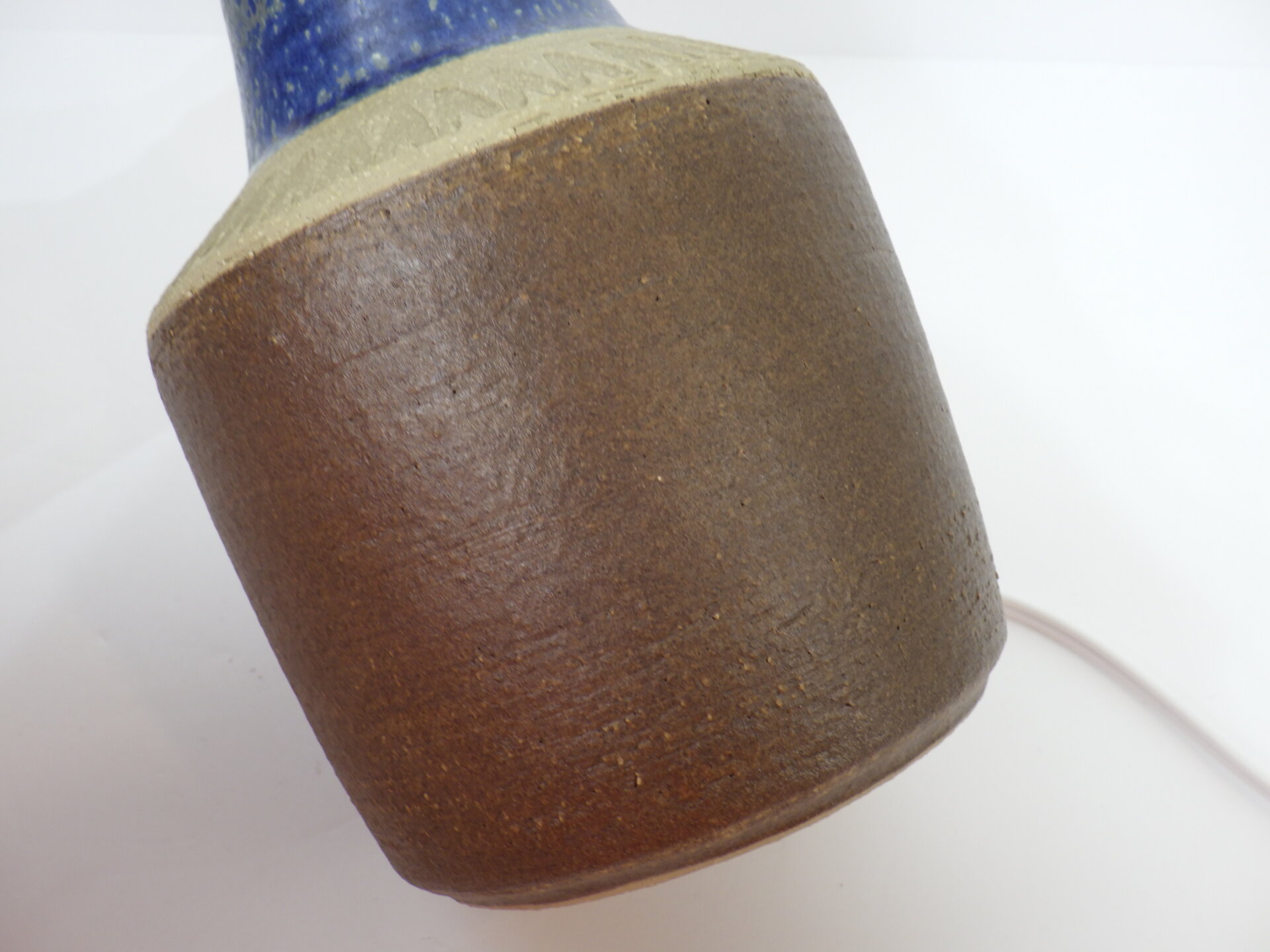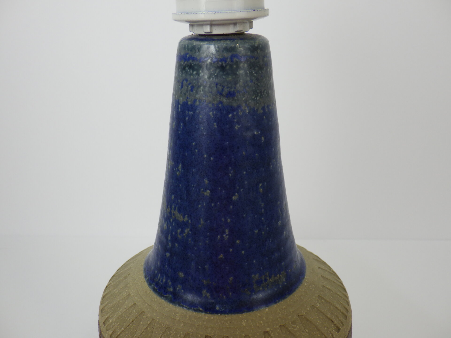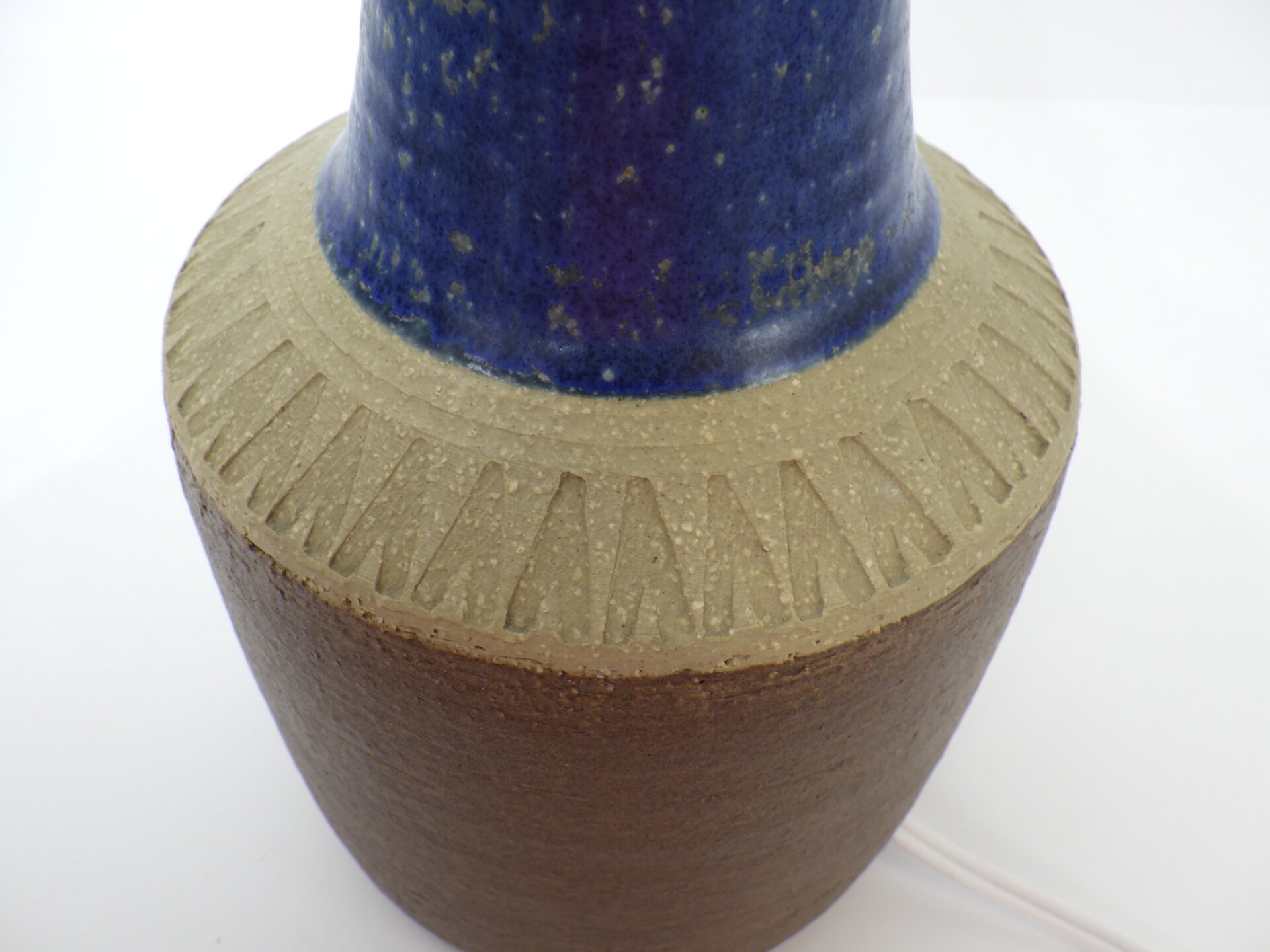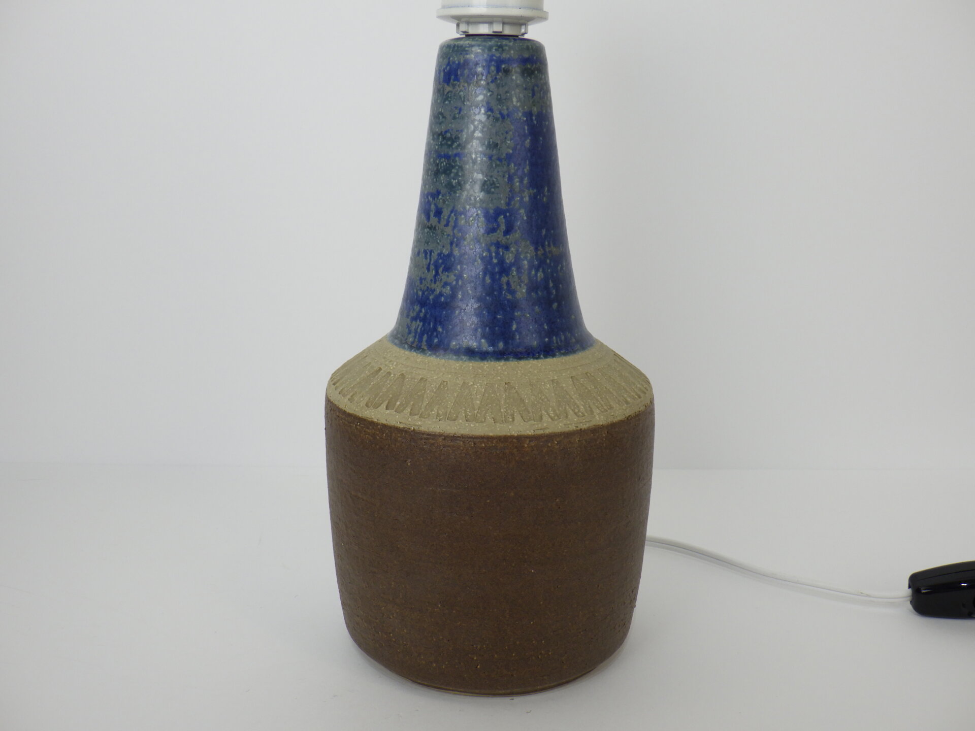| ヨーロッパで買い付けました。 デンマーク、ボーンホルム島で1835年に創業した「Soholm」のテーブルランプです。 こちらはスーホルムで多くのデザインを手掛けたEinar Johansenのデザイン。 素地部分に放射線状に刻まれた彫りが、シンプルなフォルムにリズム感を与え、照明としてだけでなくオブジェとしても美しい存在感を放ちます。 濃淡が揺らぐブルーの釉薬は、光の当たり方で印象が変わり、夜はより深く、昼は鮮やかに映えますね。 土のあたたかみを残しつつもモダンな佇まいなので、北欧インテリアはもちろん、USミッドセンチュリーや和の空間にも自然に溶け込みます。 小ぶりながらも存在感があり、置くだけで空間の温度が一段上がるような、北欧陶器ならではの質感と美しさが際立つランプですね。 コード部分のスイッチでON/OFFが切り替えられます。 (電球の口金サイズ:E26 LED対応) |