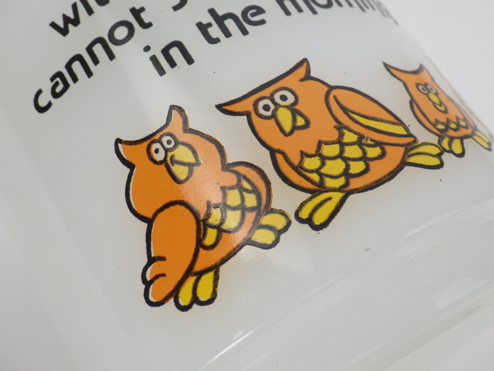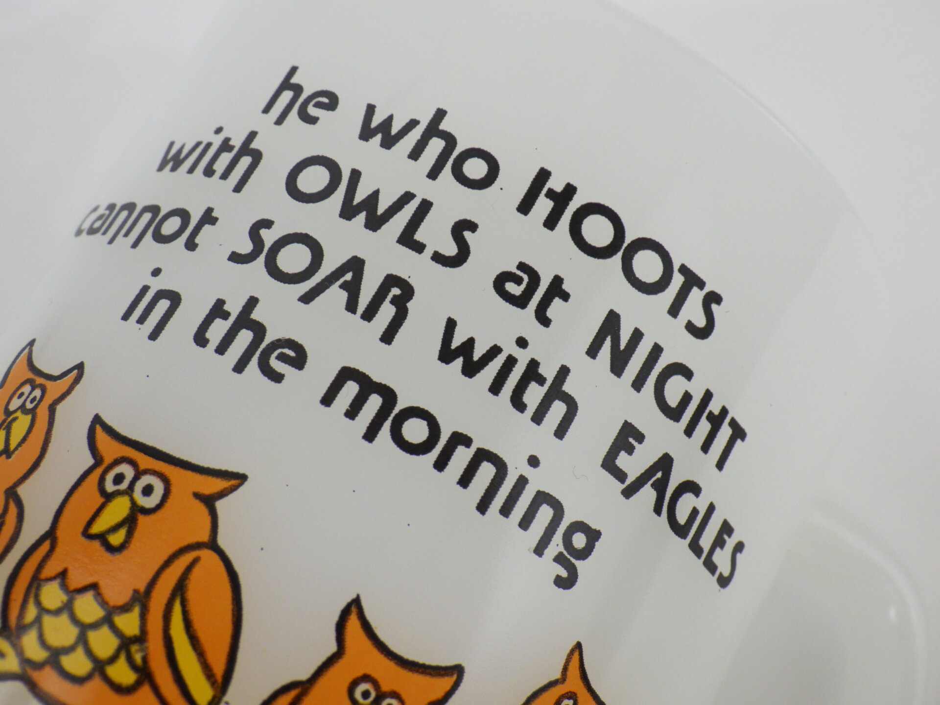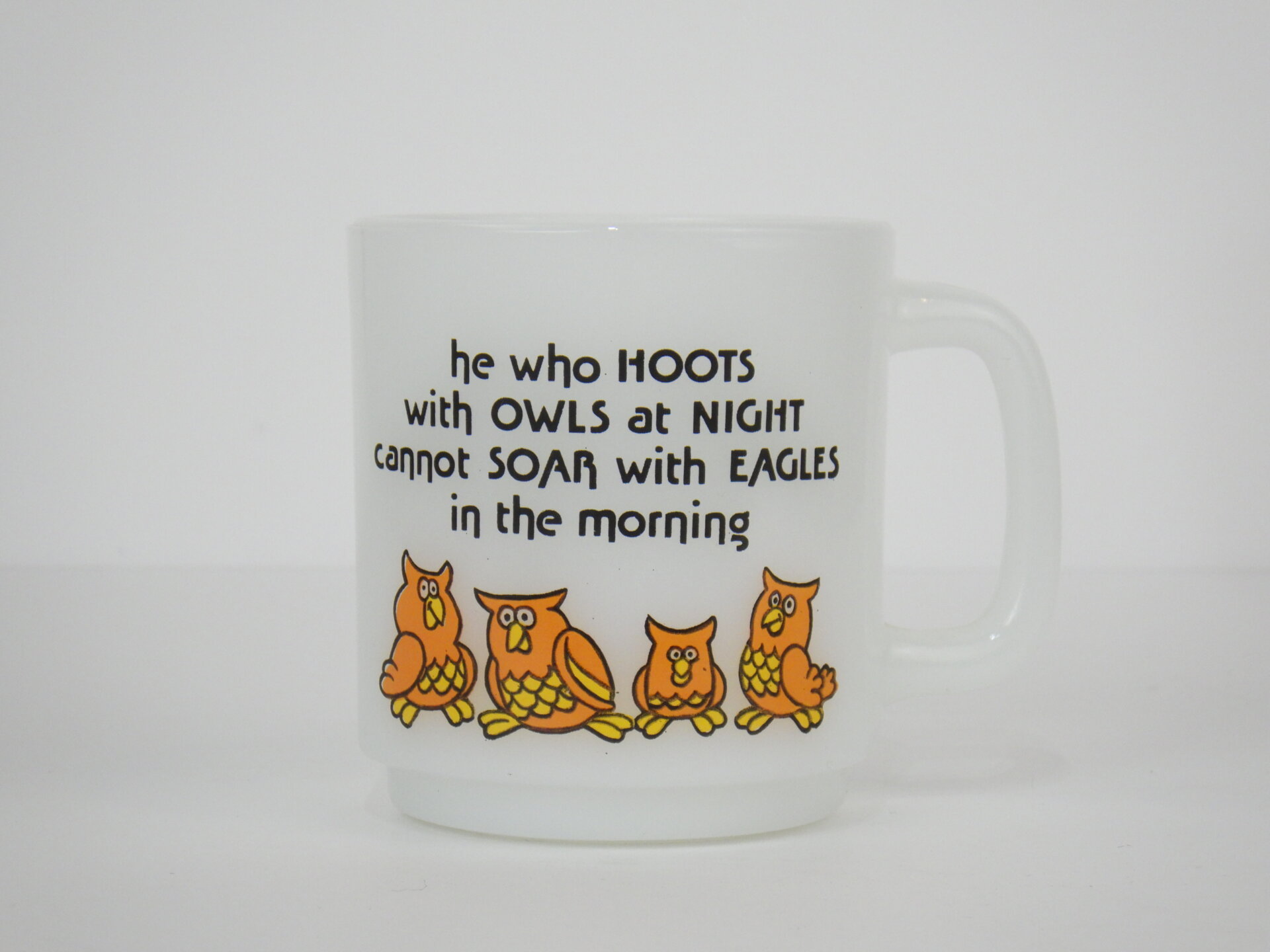 | アメリカで買い付けました。 ギフトやステーショナリーなどのアイテムを扱う会社のマグシリーズです。 可愛い四羽のフクロウのプリントと共に「夜にフクロウと鳴く者は朝にワシと舞い上がれない」と書かれています。 誰と行動を共にするか、どんな環境に身を置くかで、自分の成長や得られる結果が大きく変わる、という意味のことわざです。 |