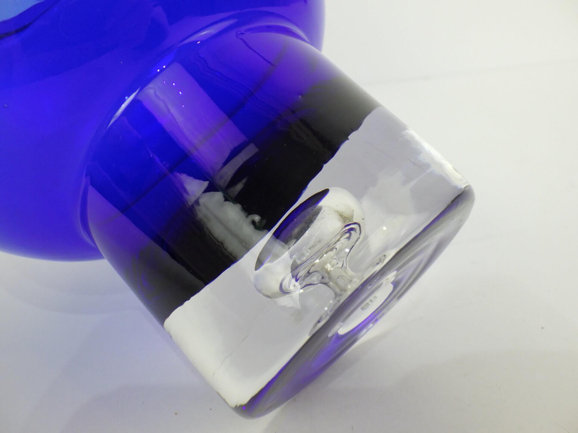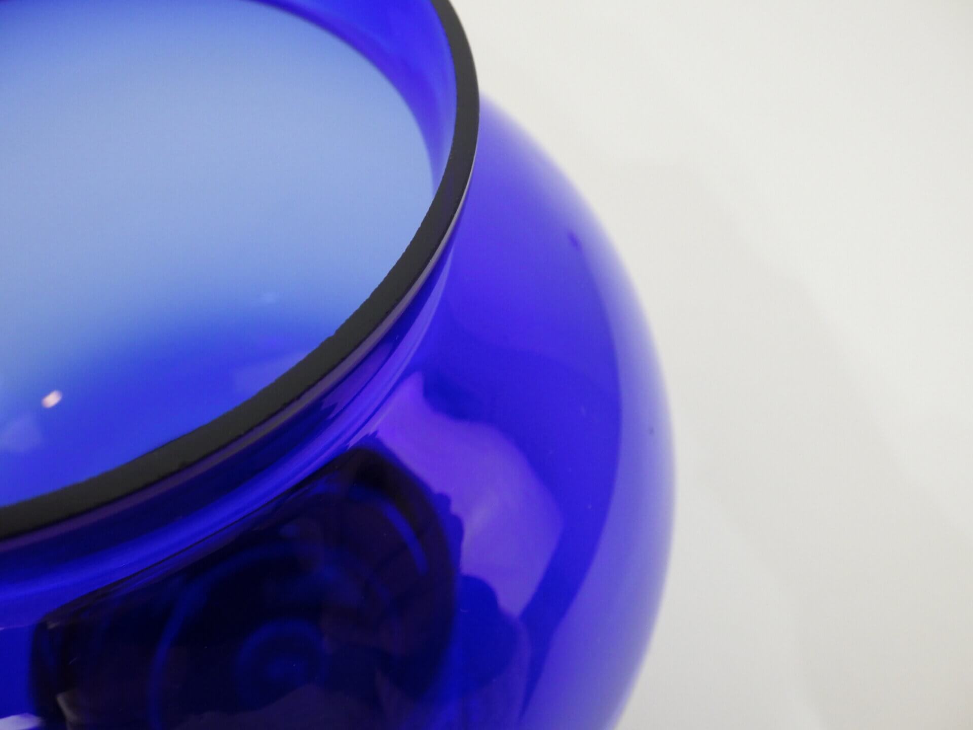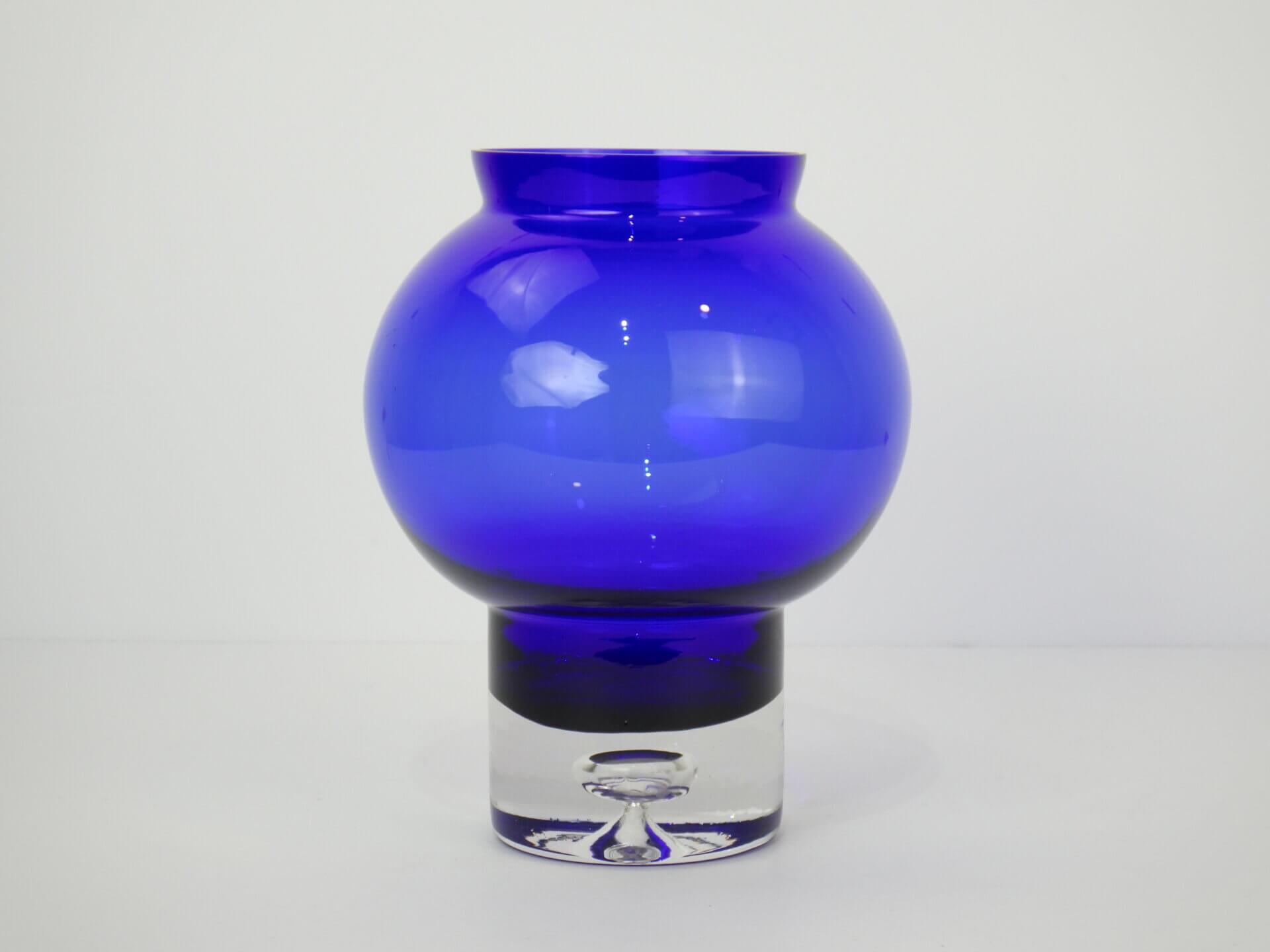 | アメリカで買い付けました。 ビンテージのフラワーベースです。 深いブルーと無色透明の台座部分のコントラストが非常に美しく、まるで宙に浮いているかのような視覚効果を生み出します。 ミッドセンチュリー期の北欧、アメリカのアートガラスに共通する、「実用品と彫刻の中間」のような思想を感じさせる佇まい。 枝物などを添えてみても良さそうですし、何も入れずにアートオブジェとして飾って楽しむのにもおすすめです。 |