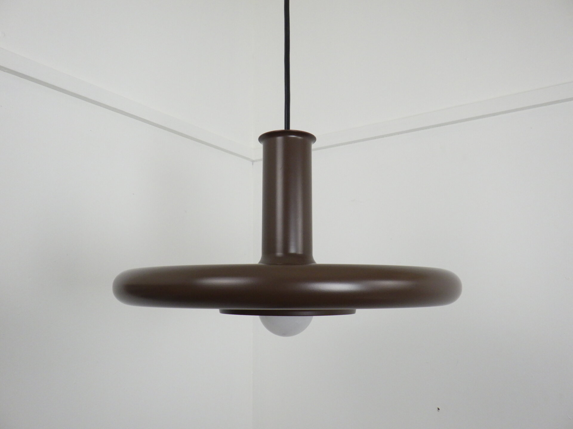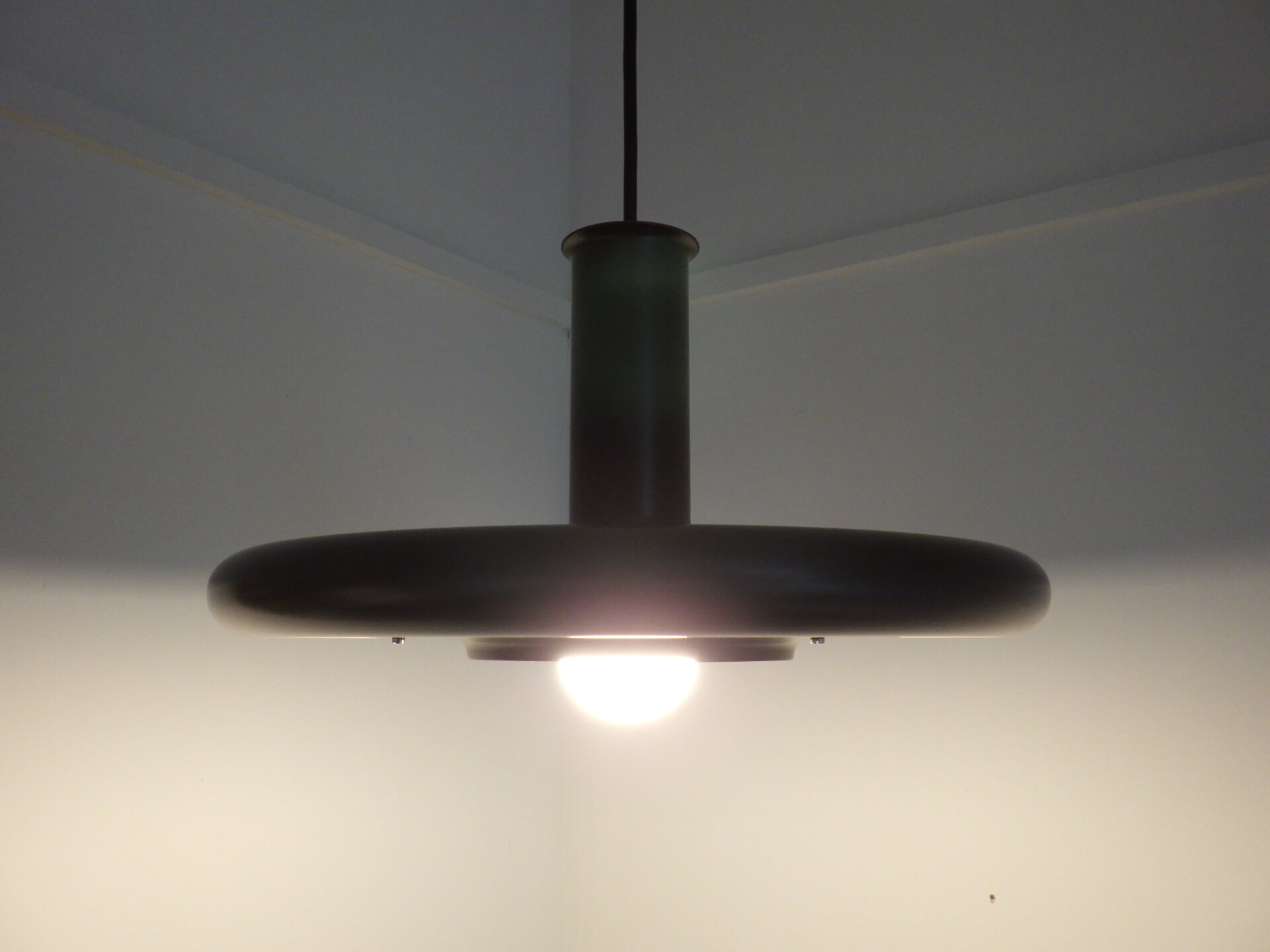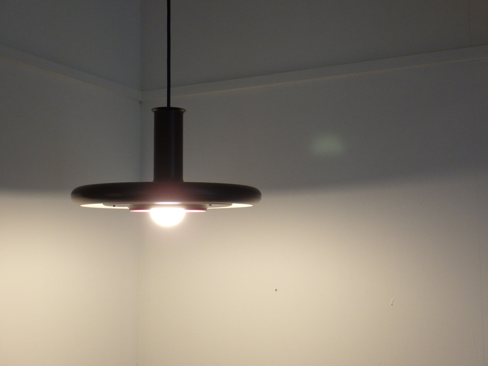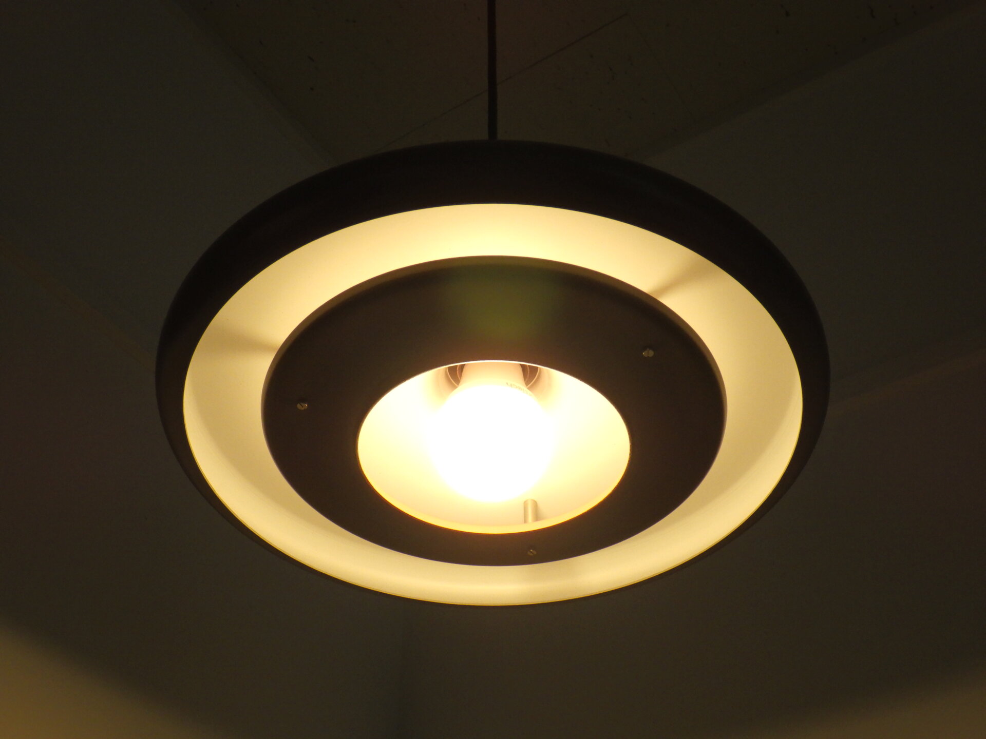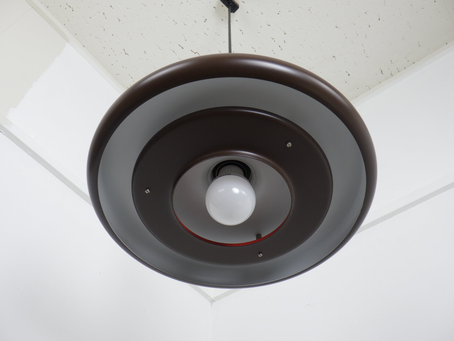 | ヨーロッパで買い付けました。 Hans DueがFog&Mørupのためにデザインしたビンテージペンダントランプ「Optima」です。 Fog&Mørupはデンマーク照明の黄金期を支えた名門メーカーで、「光をデザインする」という北欧思想を体現した存在。 今回ご紹介するこちらのランプの最大の特徴は、浮遊感のあるフラットなシェードの形状。 まるで円盤の様に広がるフォルムが、光源を美しく包み込み、眩しさを抑えながら空間全体をやさしく照らします。 注目は内側のシェードの裏側に施された赤いライン。 点灯するとそのラインに反射して、ほんのりあたたかい色味を放ちます。 実用性と造形美を高次元で融合させたランプは、インテリア愛好家からも高い評価を受けています。 ダイニングやキッチン、リビングの主役としてはもちろん、ミッドセンチュリー家具やモダンな空間とも相性抜群。 空間に「時代を超えた品格」を添えてくれる一灯です。 |