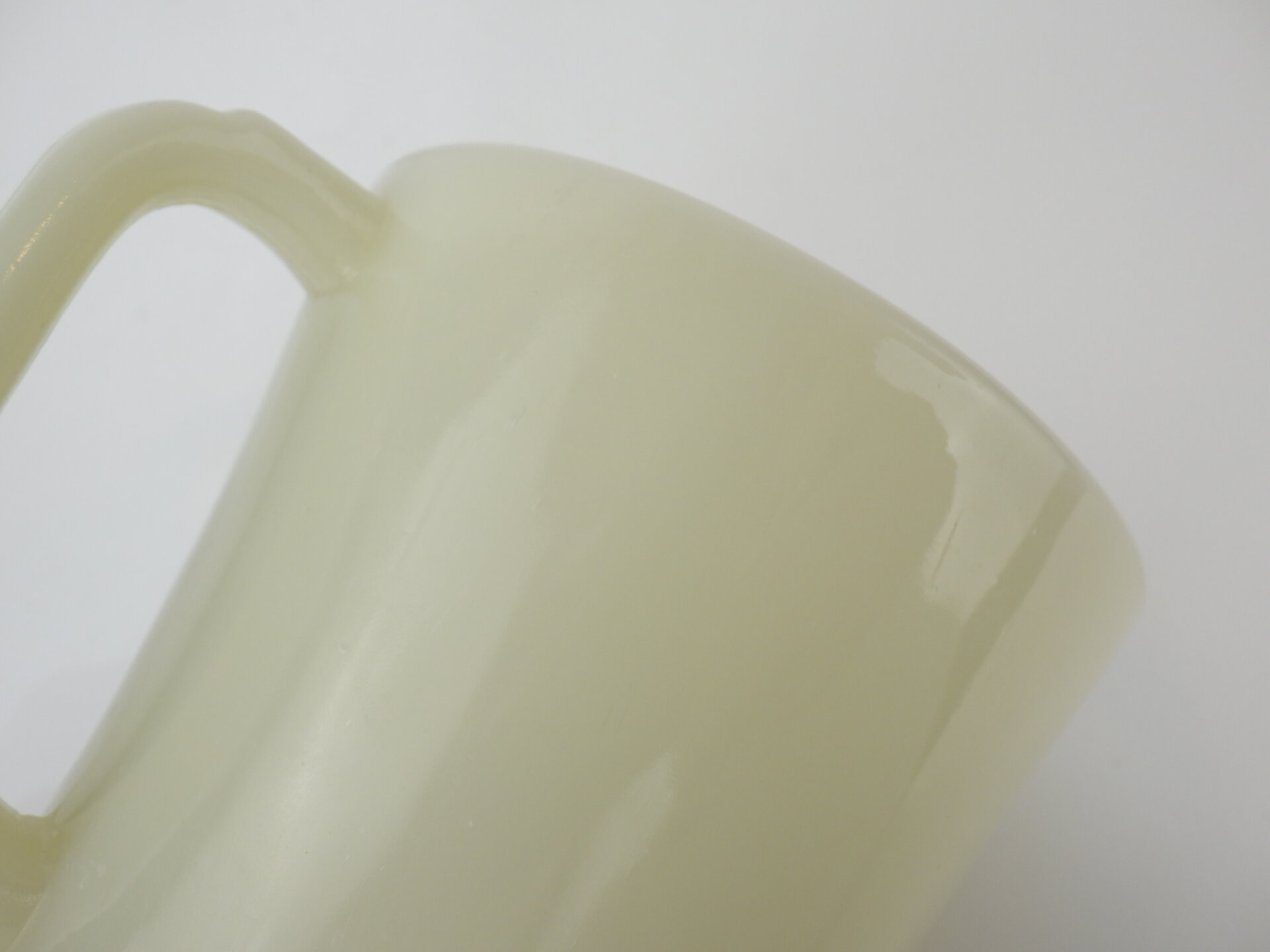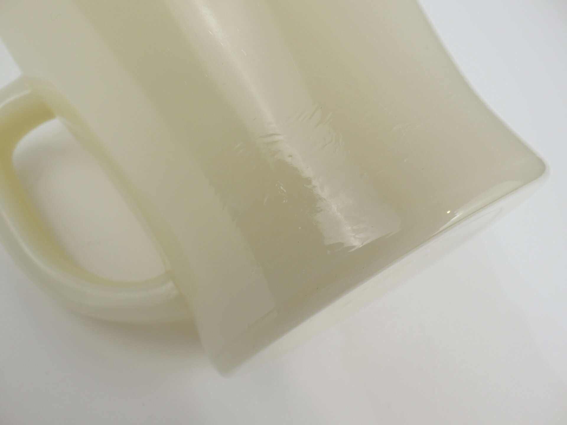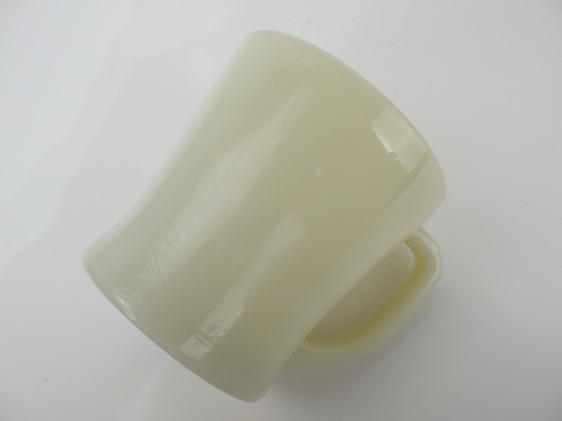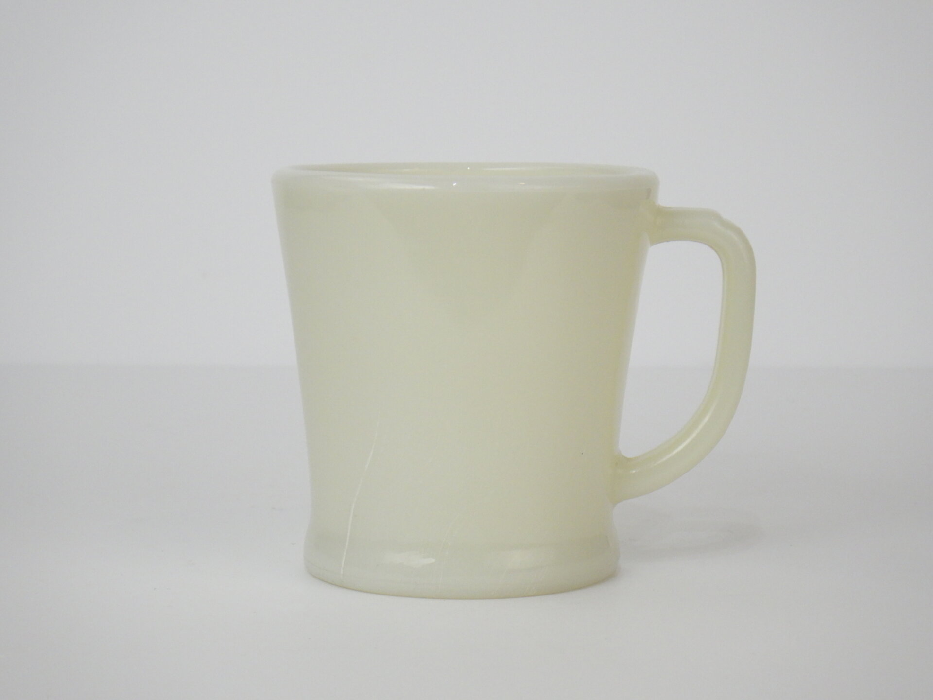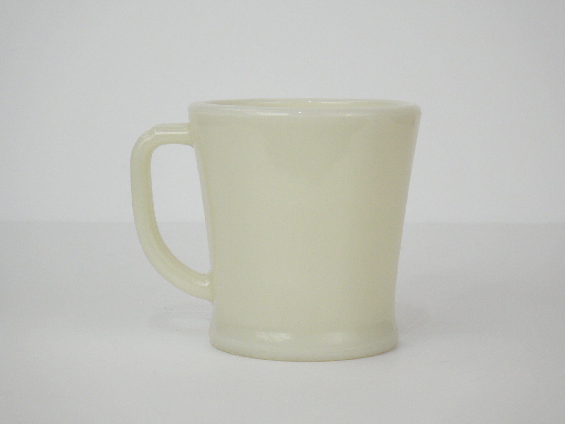 | アメリカで買い付けました。 ファイヤーキングのアイボリー、Dハンドルマグです。 こちらのシェービングは初期のDハンドルで、別名「フラットボトムマグ」と呼ばれる底が平らなデザインです。(その後のターコイズブルー、ミルクホワイトには存在しません) アイボリーは色のトーン(深み)に個体差が大きいので、お好みの色合いを探すのが楽しいシリーズです。 |