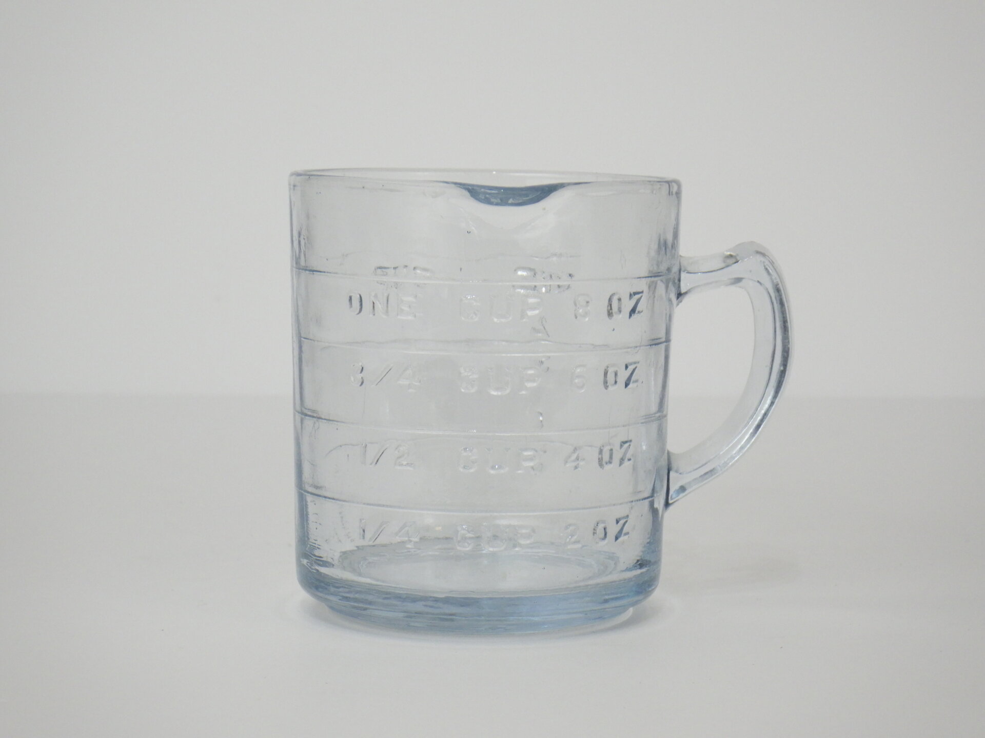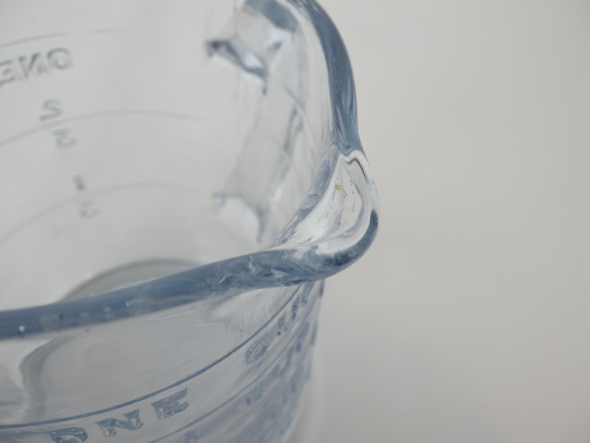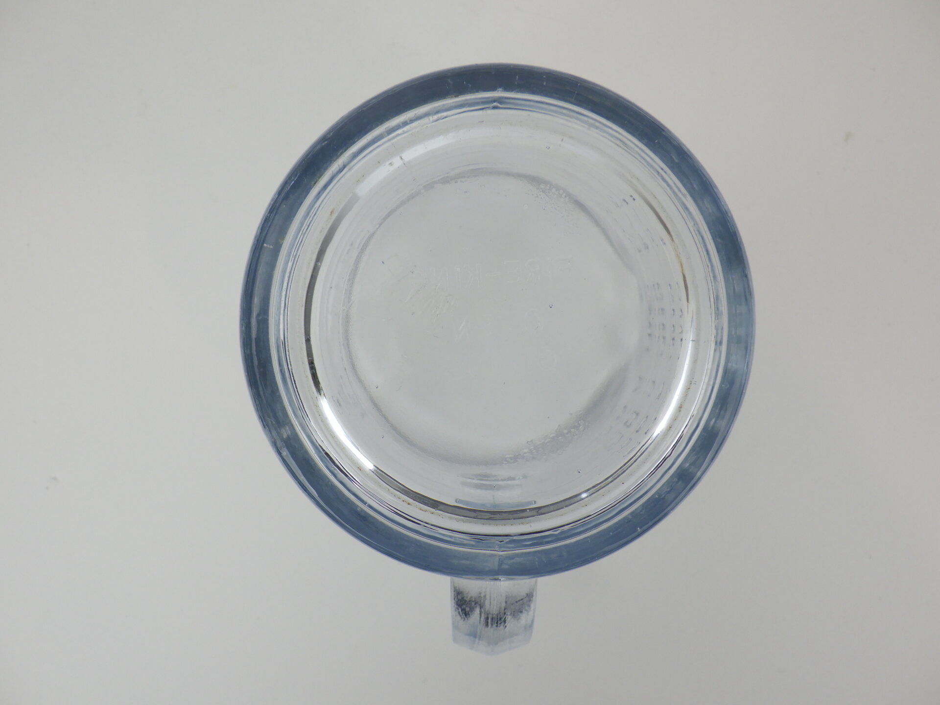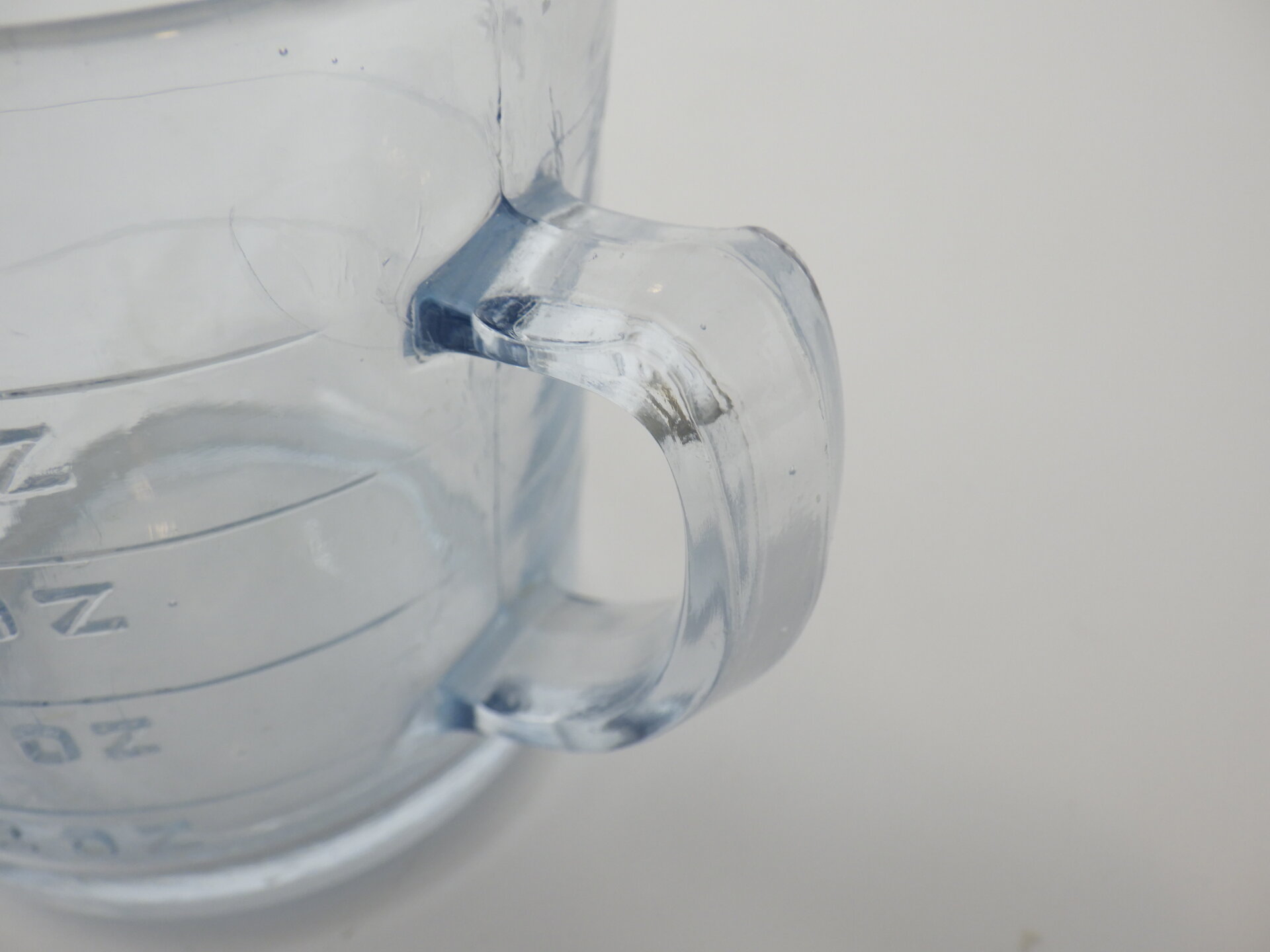 | アメリカで買い付けました。 ファイヤーキング、サファイアブルーのメジャーカップです。 8oz(約240ml)まで測れます。 注ぎ口は一つのタイプ。 ミルクガラスのアイテムとは違い、刻印は上から内部を見た時に正しい向きになるようになっています。(こちらは最初期のブロックレタータイプです) |