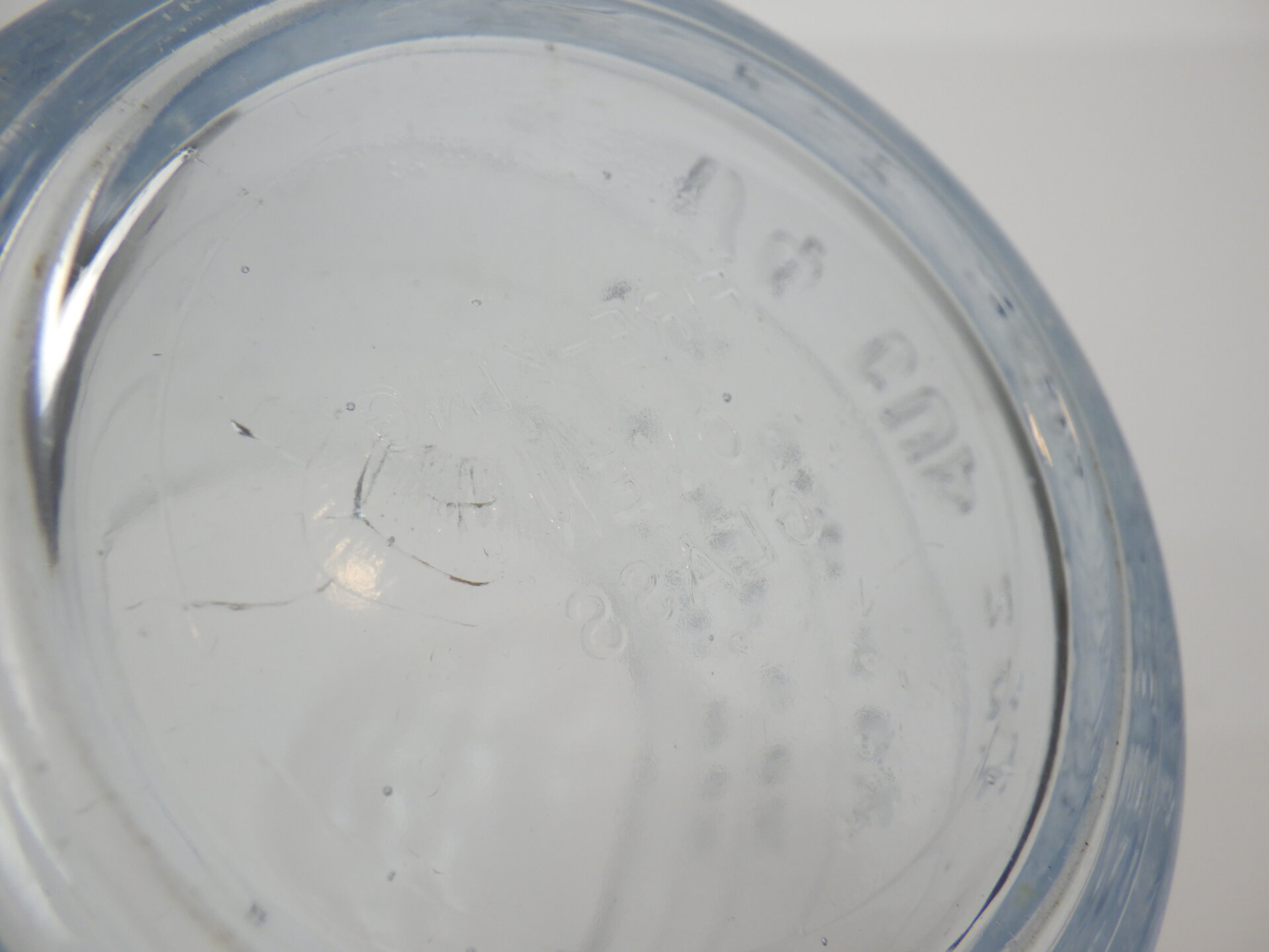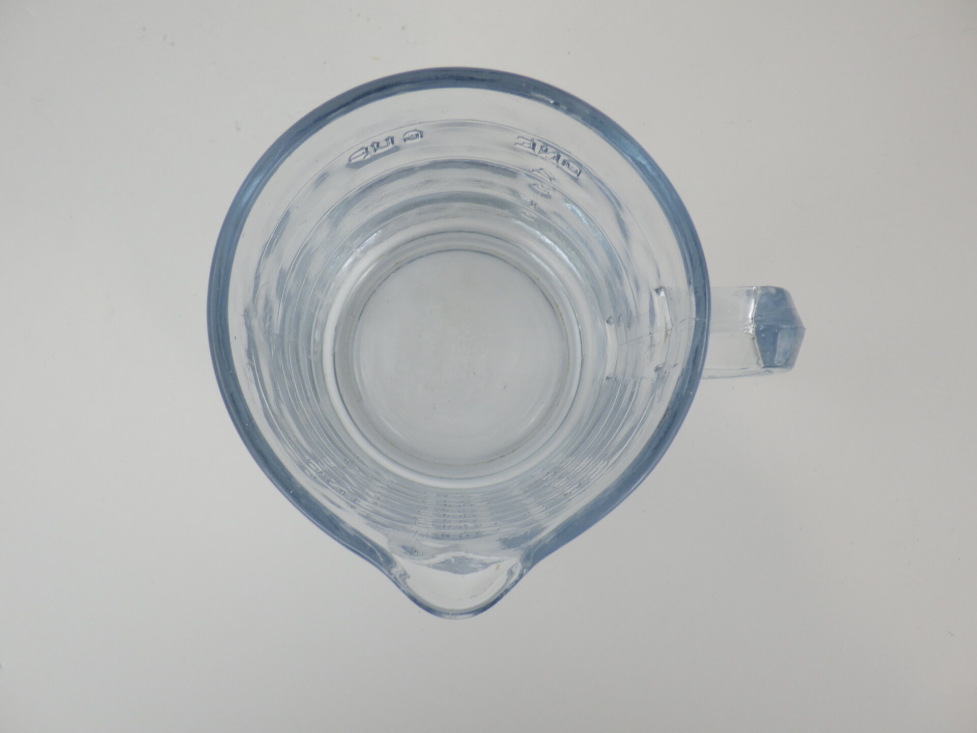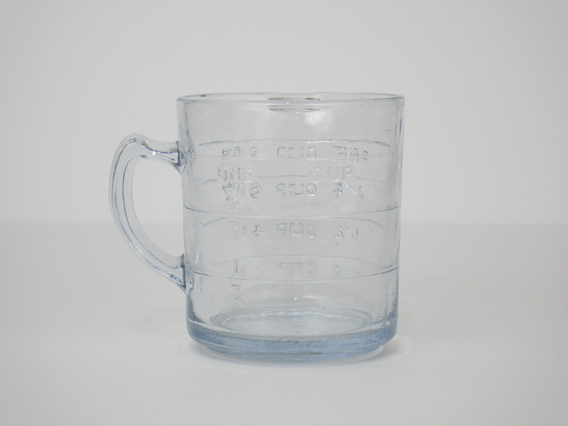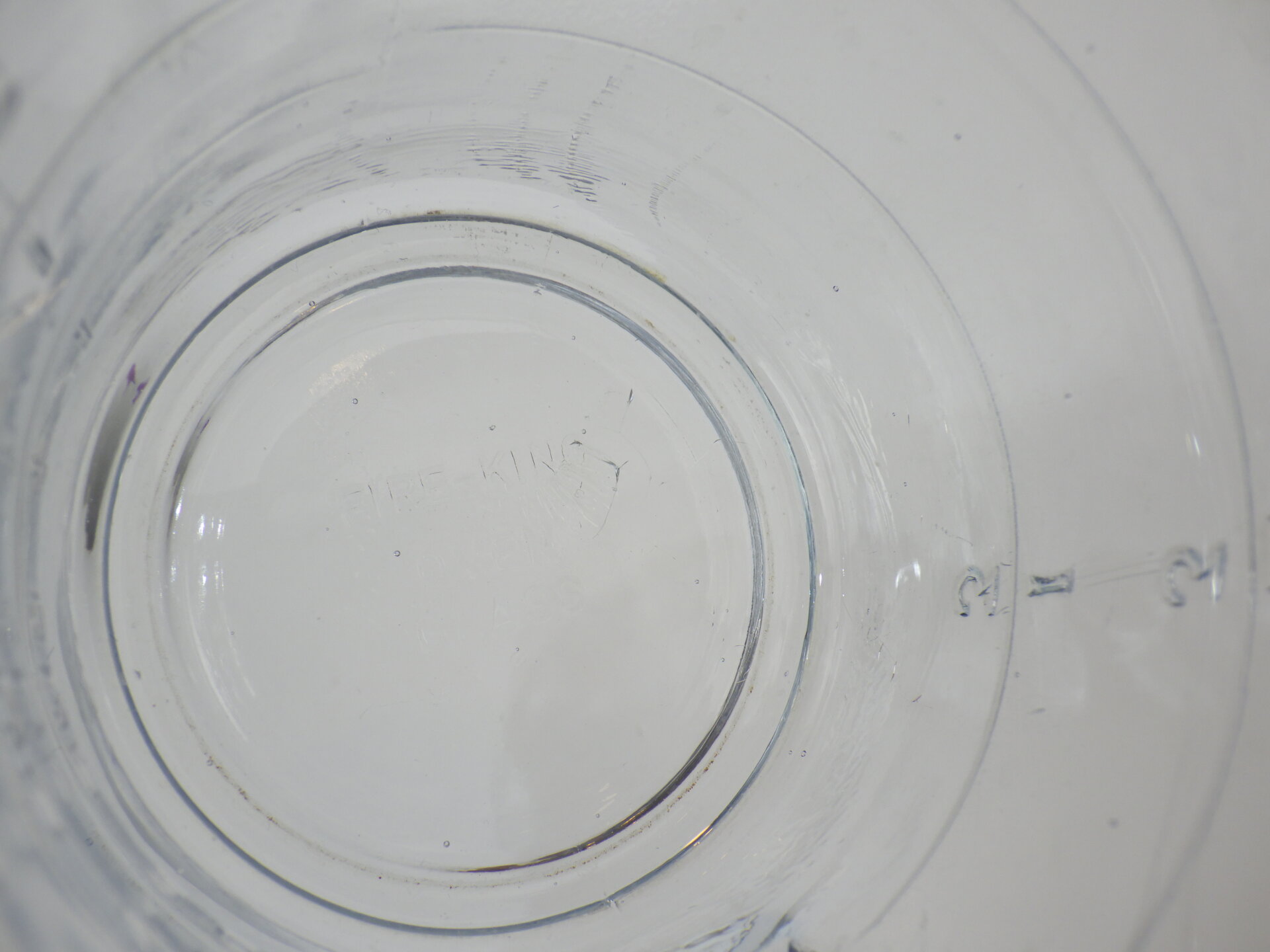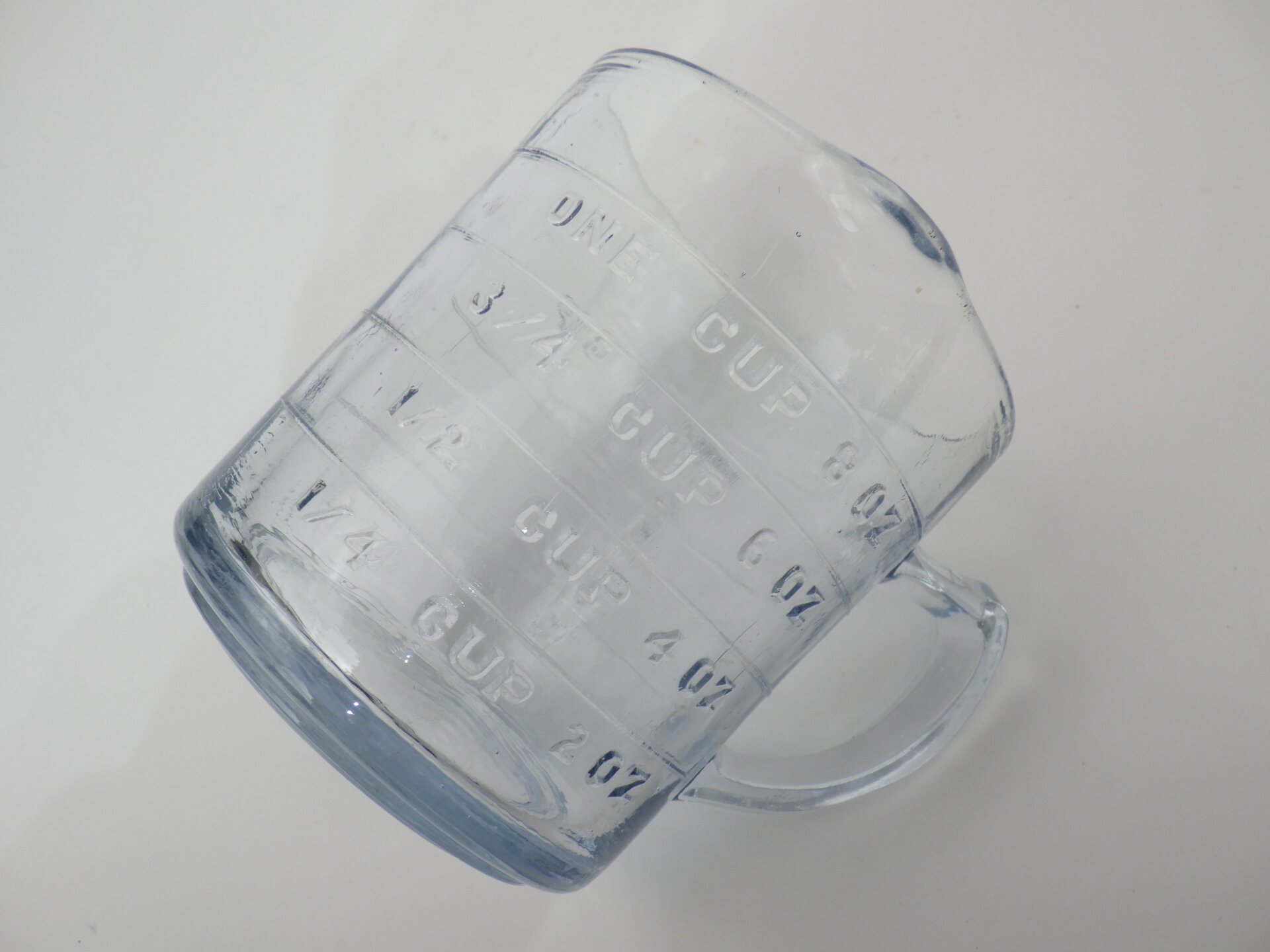 | アメリカで買い付けました。 ファイヤーキング、サファイアブルーのメジャーカップです。 8oz(約240ml)まで測れます。 注ぎ口は一つのタイプ。 ミルクガラスのアイテムとは違い、刻印は上から内部を見た時に正しい向きになるようになっています。(こちらは最初期のブロックレタータイプです) |