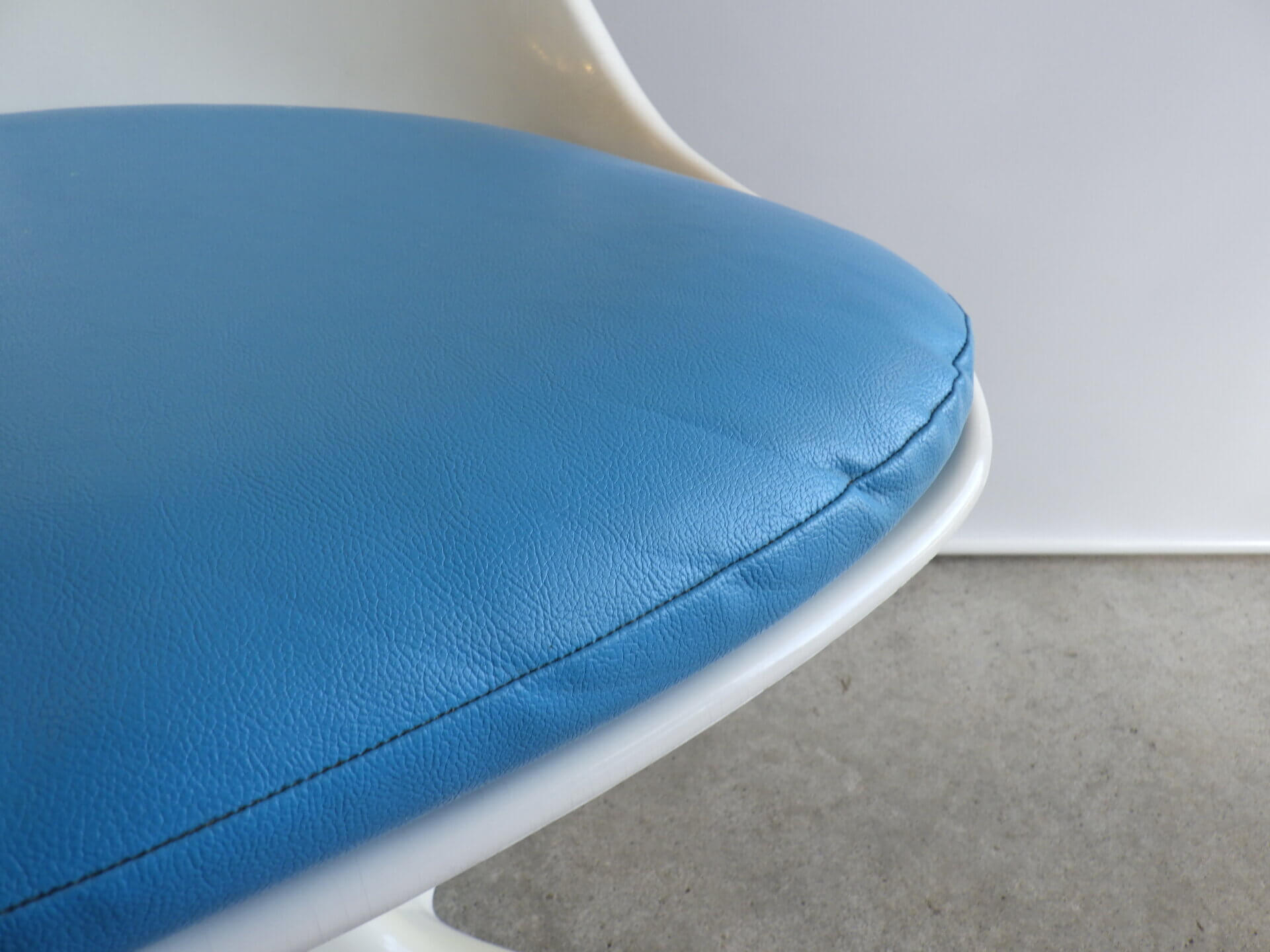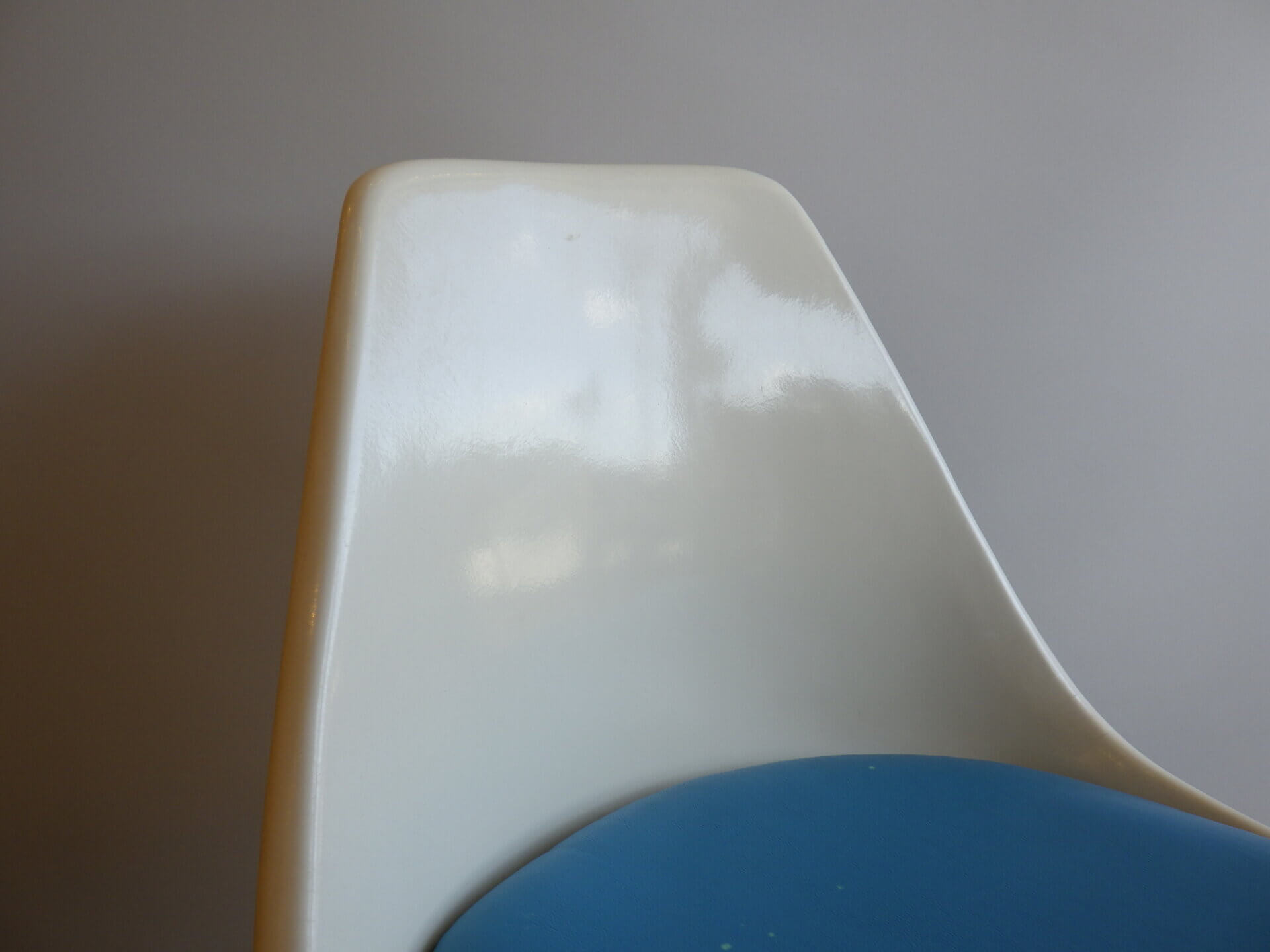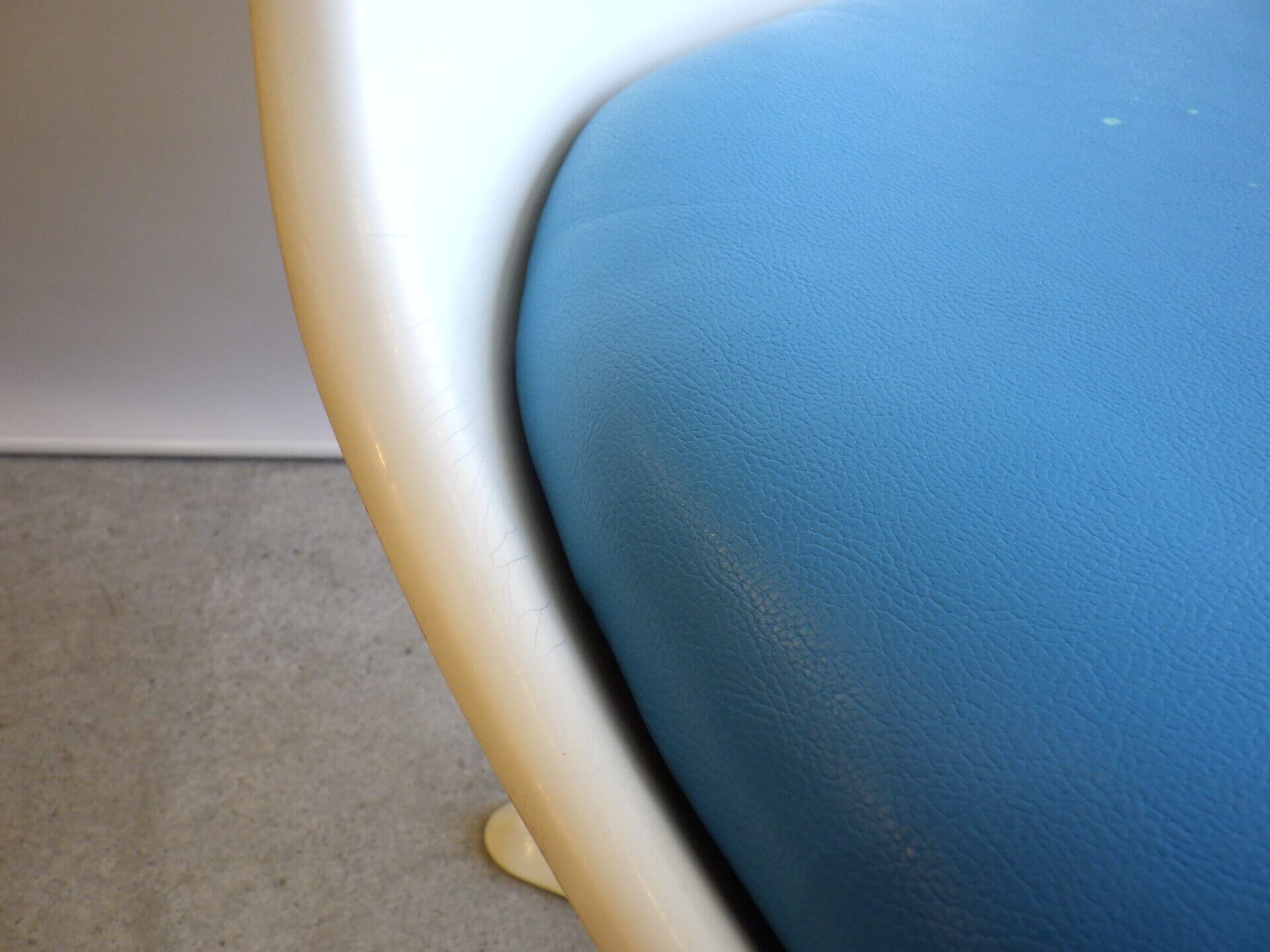 | アメリカで買い付けました。 BURKEのビンテージチェアです。 エーロ・サーリネンのチューリップチェアを思わせる曲線的フォルムが特徴のチェア。 一体成形のFRPシェルとスチール製ベースによるミニマルな構造は、当時の未来志向のデザイン思想をそのまま形にしたような存在です。 スペースエイジなアイテムとも相性は良さそう。 ブルーのクッションがアクセントになり、空間に軽やかな彩りを添える点も魅力的ですので、ダイニングやワークスペースだけでなく、ショップ什器として単体でオブジェのように置いても楽しめそうです。 |
