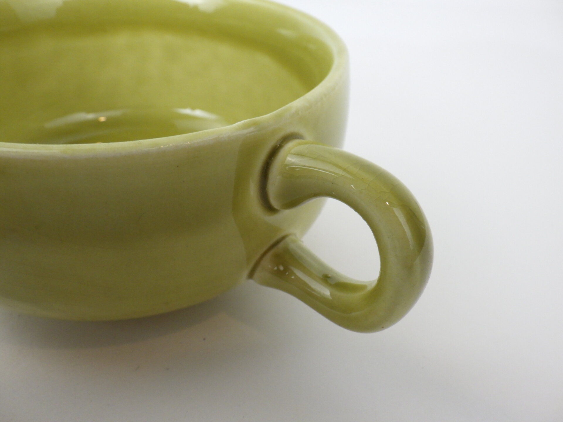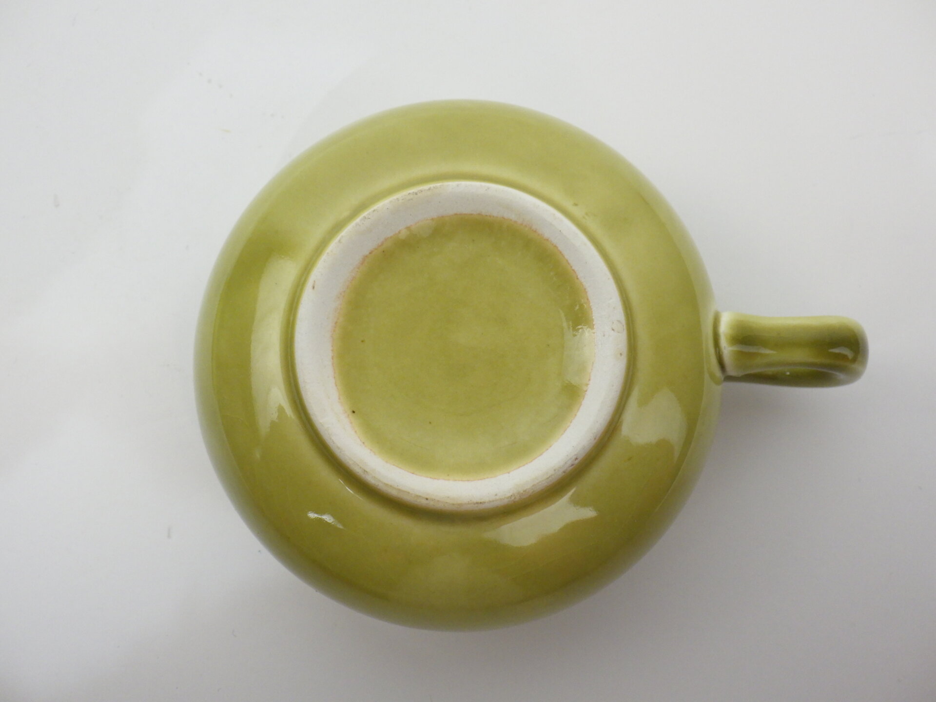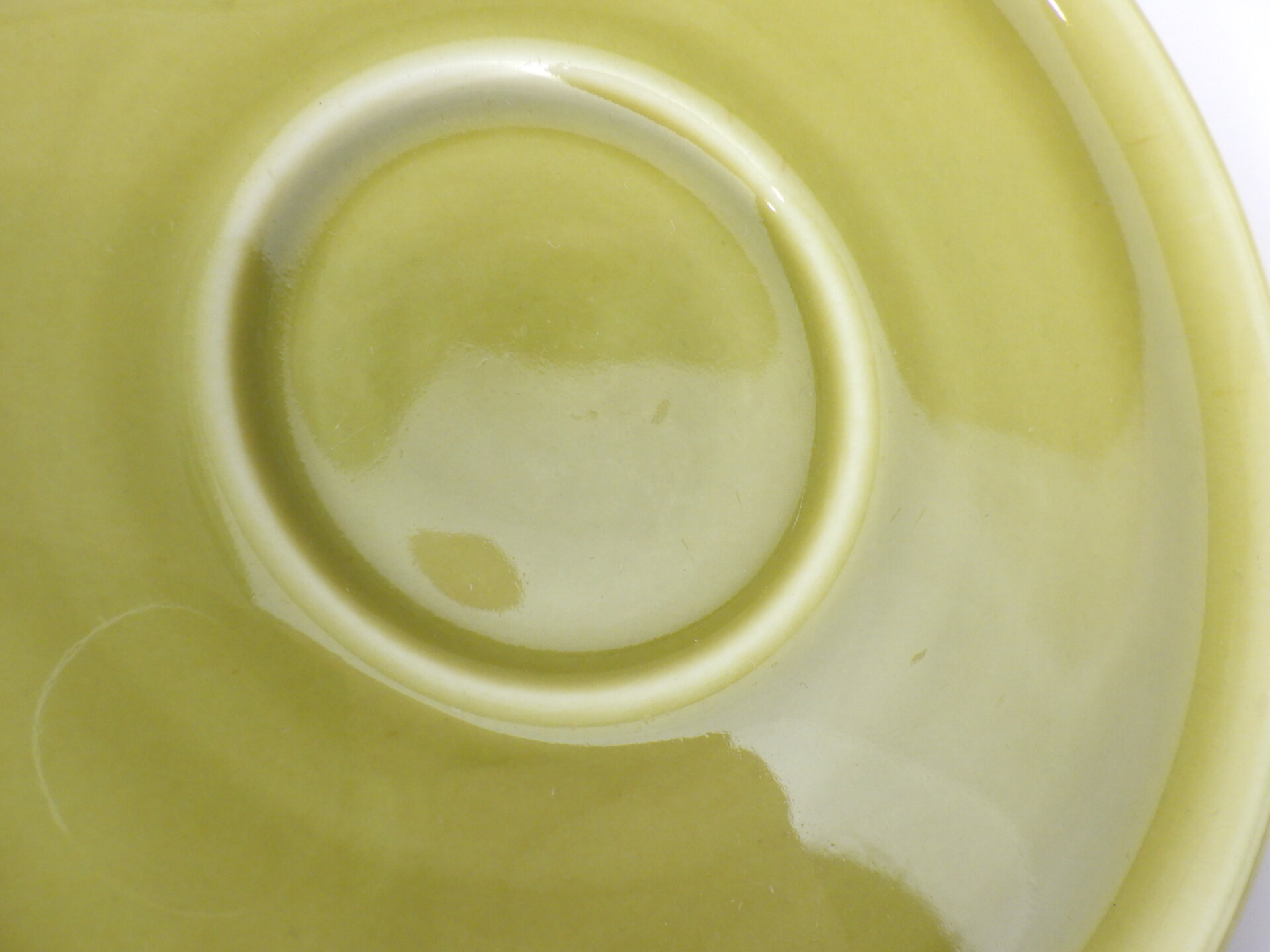 | アメリカを代表する工業デザイナー「ラッセル・ライト」デザインによる、1939年から1959年に製造されたSteubenville(スチューベンヴィル)社製のアメリカンモダンシリーズです。 ラッセル・ライトは、それまでの時代の主流であった華美な装飾を廃し、機能的でシンプル、それでいてデザイン的で安価な食器を生み出し、当時のアメリカにおける食器の価値観を大きく変えました。 こちらのC&Sはラッセルライトらしい丸みがあり、縁がぽってりしているデザインで、時代を経ても全く古めかしさを感じません。 こちらはフランスを代表するリキュールの一つである「シャルトリューズ」をイメージしたイエローカラーが印象的で、ラッセルライトらしさを存分にお楽しみいただけると思います。 |