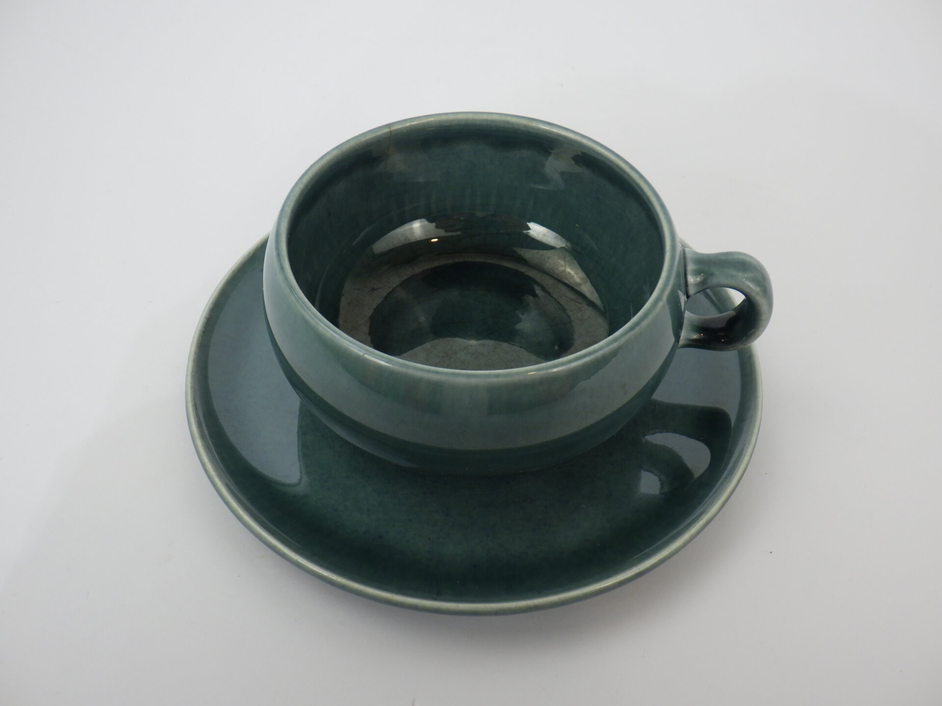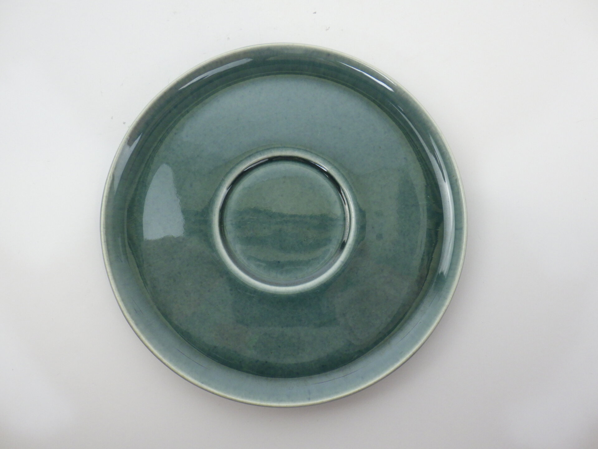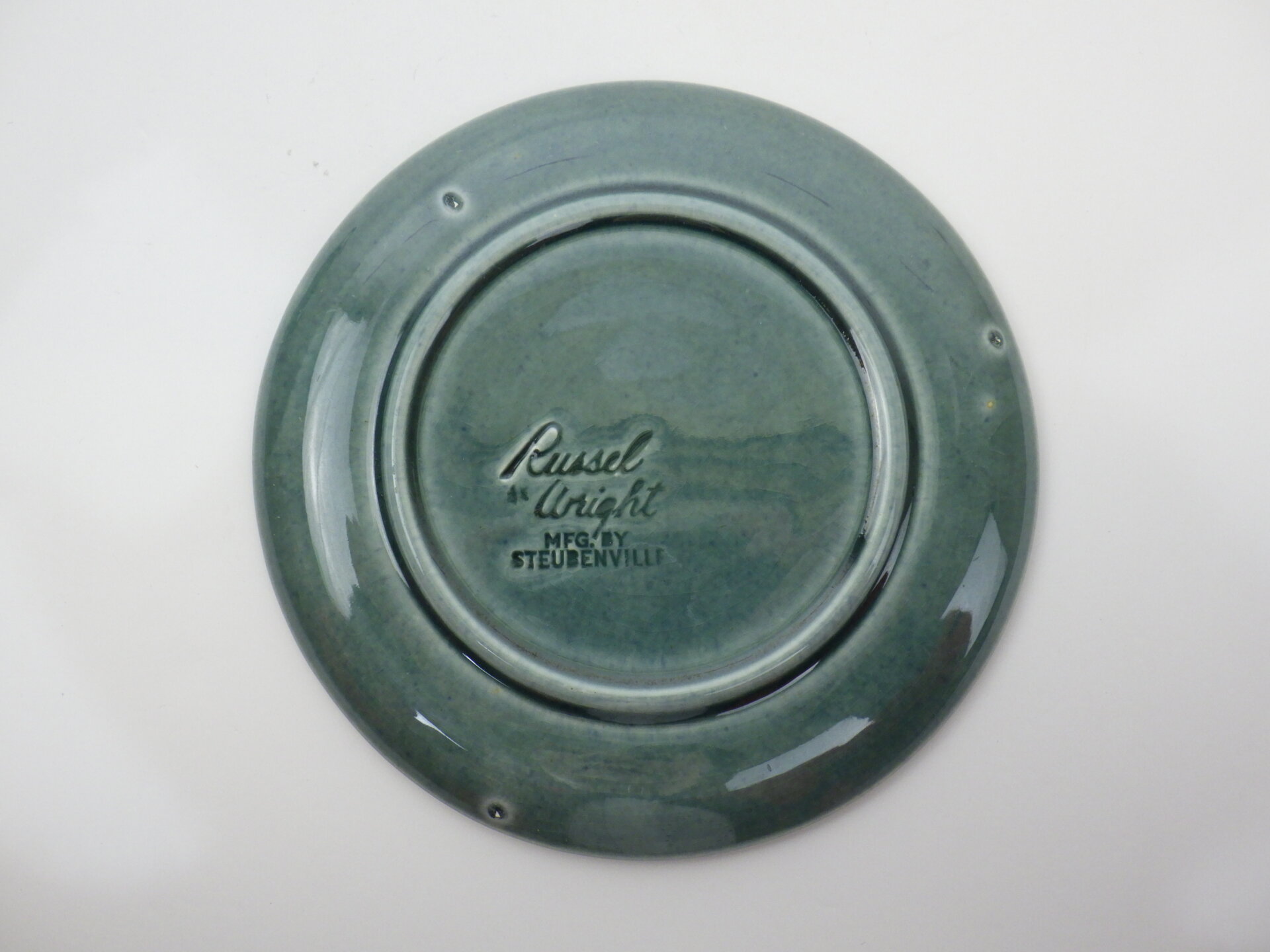 | アメリカを代表する工業デザイナー「ラッセル・ライト」デザインによる、1939年から1959年に製造されたSteubenville(スチューベンヴィル)社製のアメリカンモダンシリーズです。 ラッセル・ライトは、それまでの時代の主流であった華美な装飾を廃し、機能的でシンプル、それでいてデザイン的で安価な食器を生み出し、当時のアメリカにおける食器の価値観を大きく変えました。 こちらのC&Sはラッセルライトらしい丸みがあり、縁がぽってりしているデザインで、時代を経ても全く古めかしさを感じません。 こちらは「海の泡」という意味の「シーフォーム」カラーで、深みのある青緑が印象的です。 |