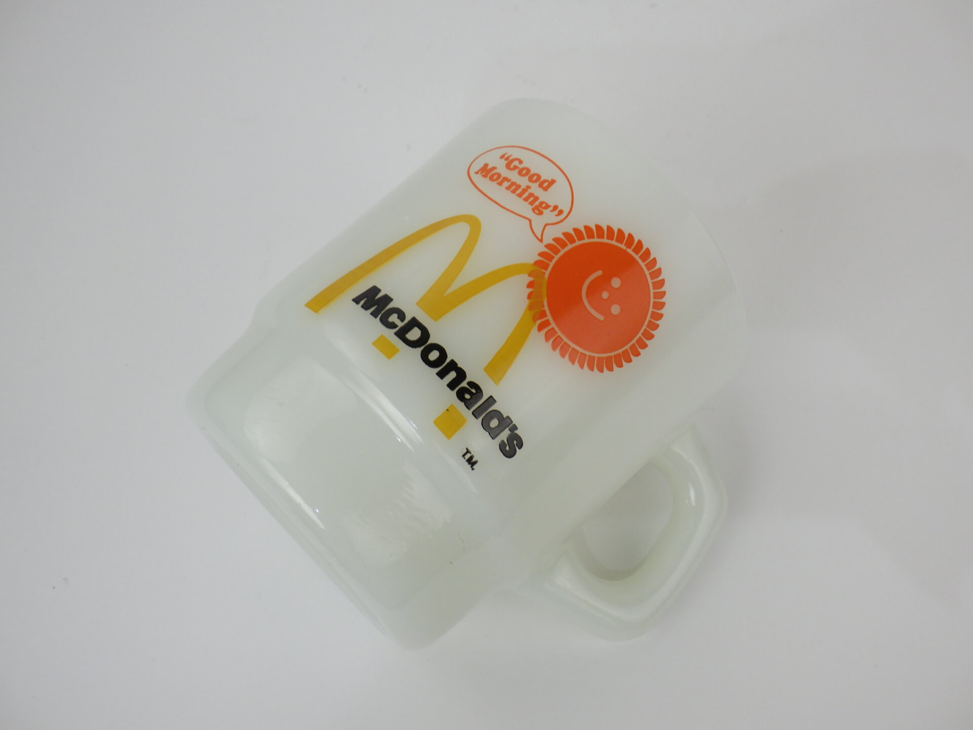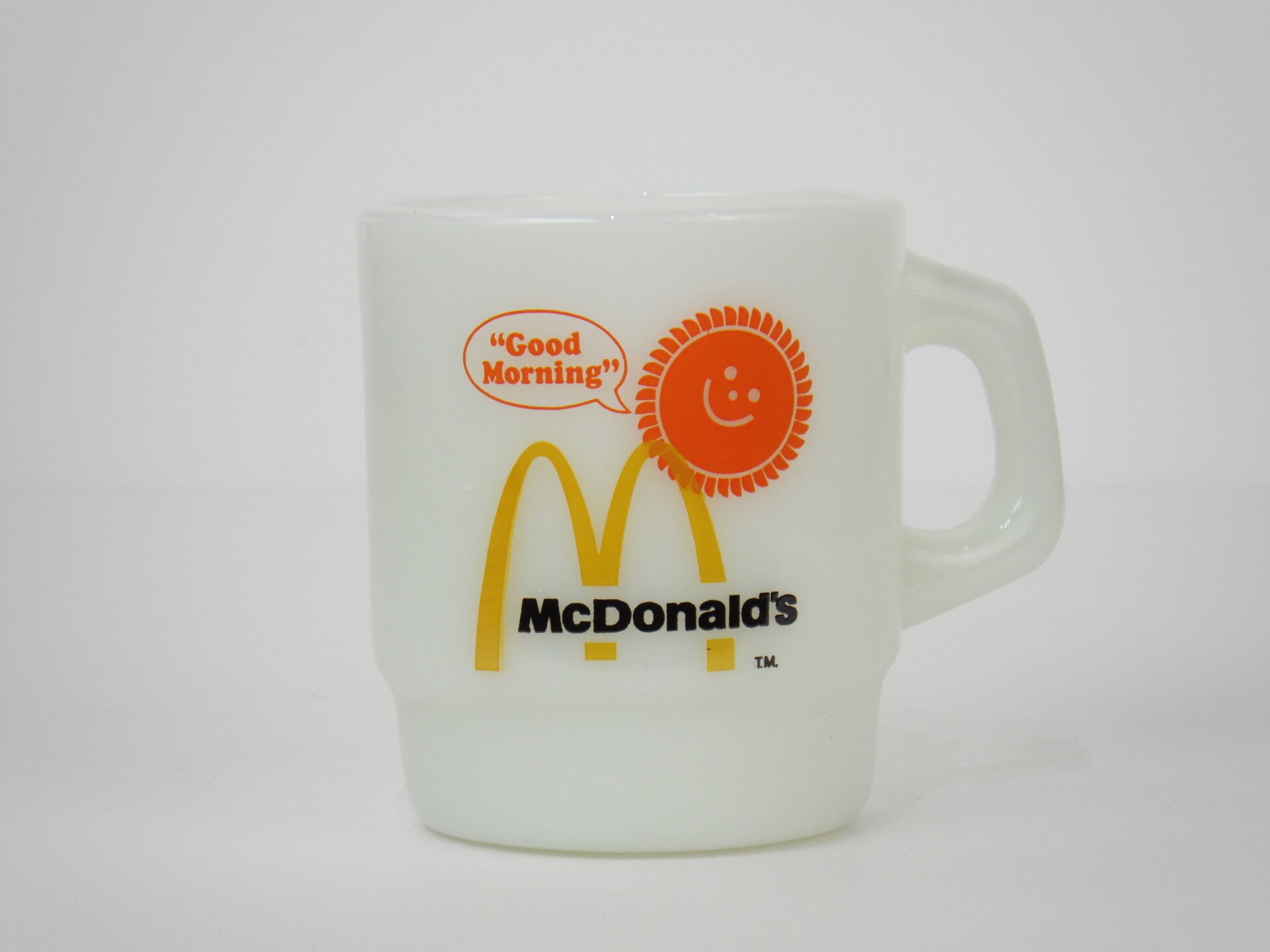 | アメリカで買い付けました。 ファイヤーキングのアドマグの中でも圧倒的人気を誇る、マクドナルドマグです。 当時はブレックファーストセットなどを注文するとノベルティとしてもらえました。 太陽のモチーフやお馴染みのMのロゴなどポップで可愛らしく、ワクワクするデザインです。 「初めてのファイヤーキング」におすすめなアイテムですよ。 |