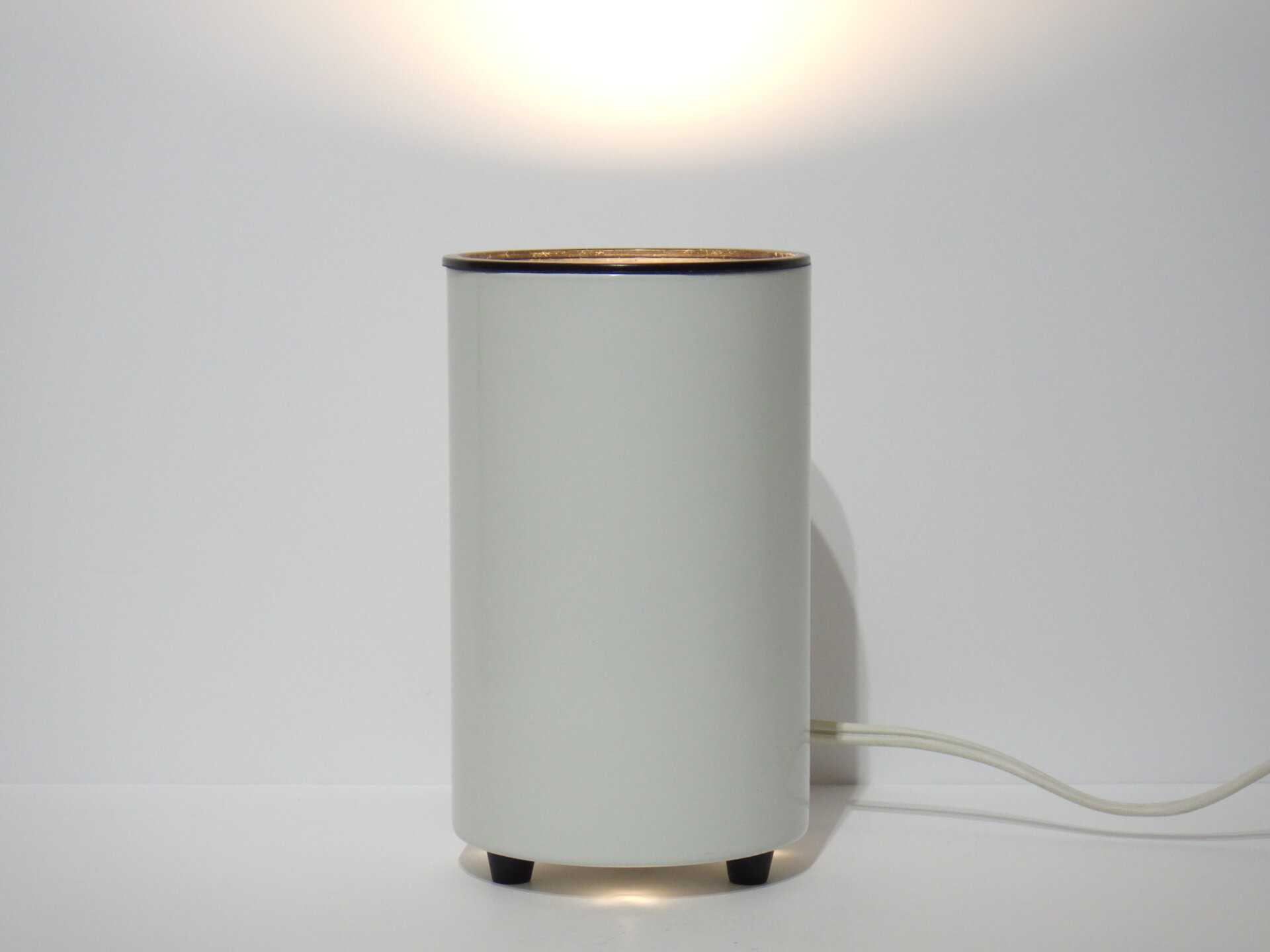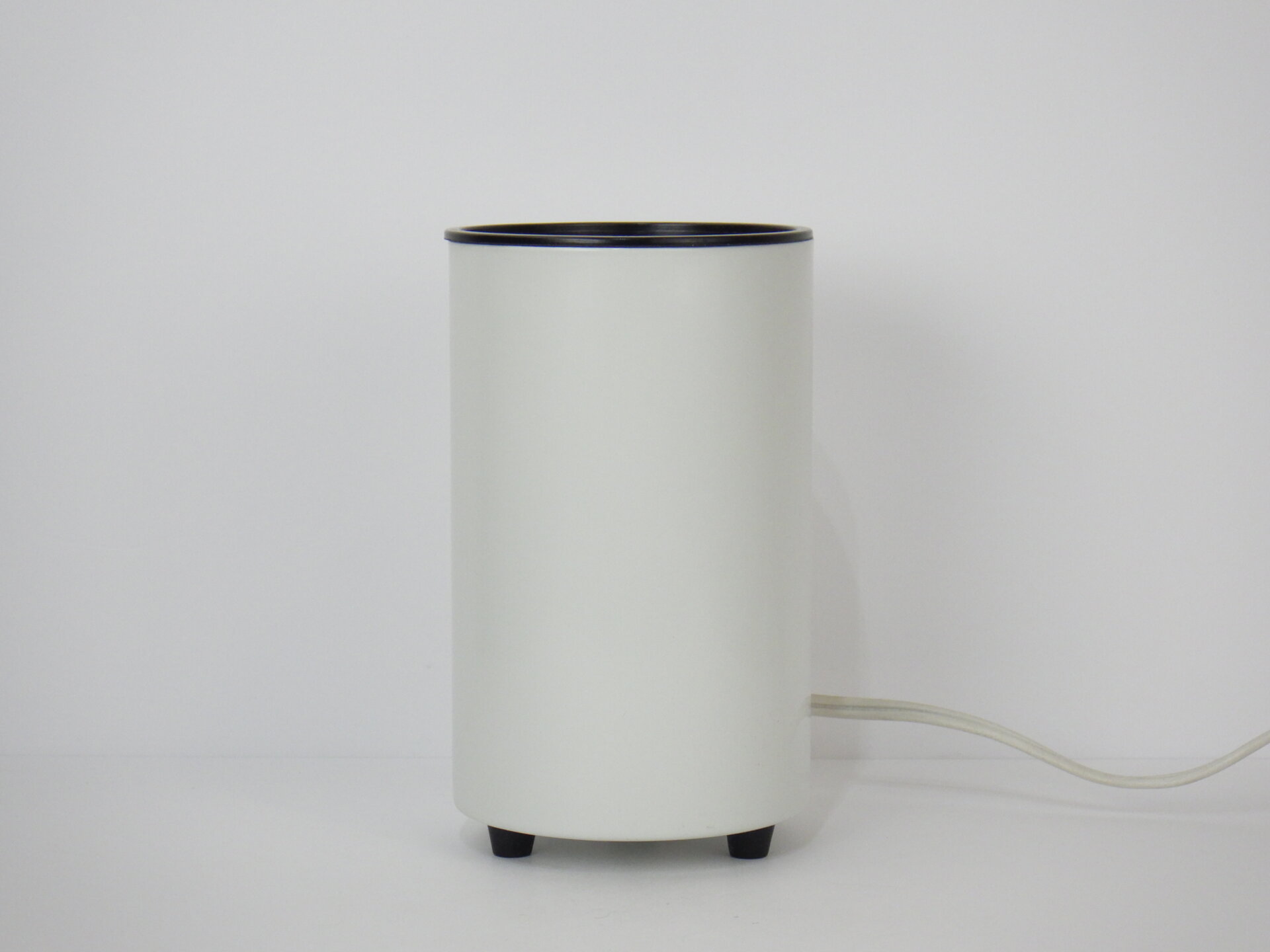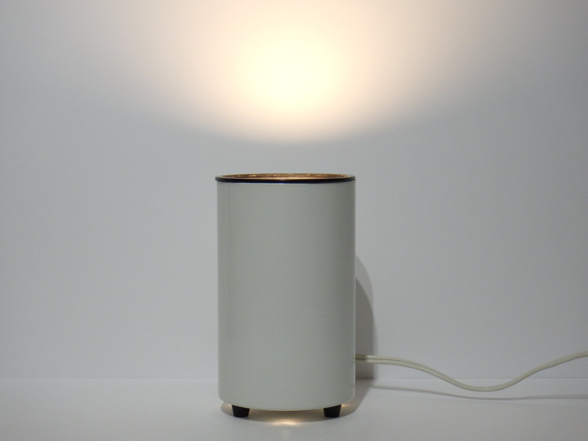 | アメリカで買い付けました。 ビンテージのテーブルランプです。 装飾など可能なまでにそぎ落とし、真っ白な円柱ボディに、上下にわずかなブラックが足されただけのシンプルなデザイン。 灯りをともすと柔らかく滲むように広がる光。 足元は数センチ浮いており、そこからもかすかに灯りがもれます。 ホテルライクな空間作りをされている方や、ミニマルな間接照明をお探しの方にぴったりなデザインです。 コード部分のスイッチでON/OFFが切り替えられます。 (電球の口金サイズ:E26 LED対応) |
