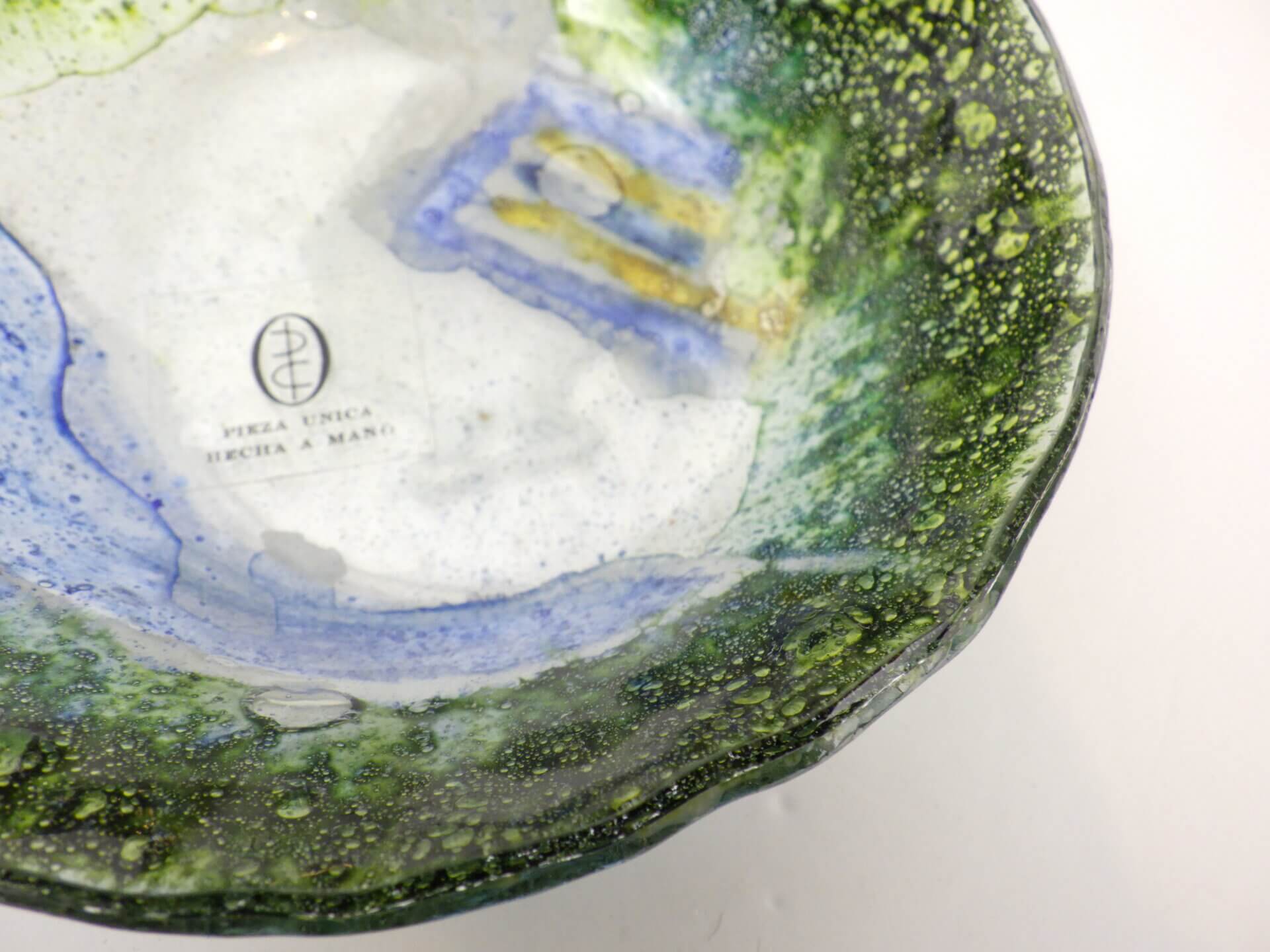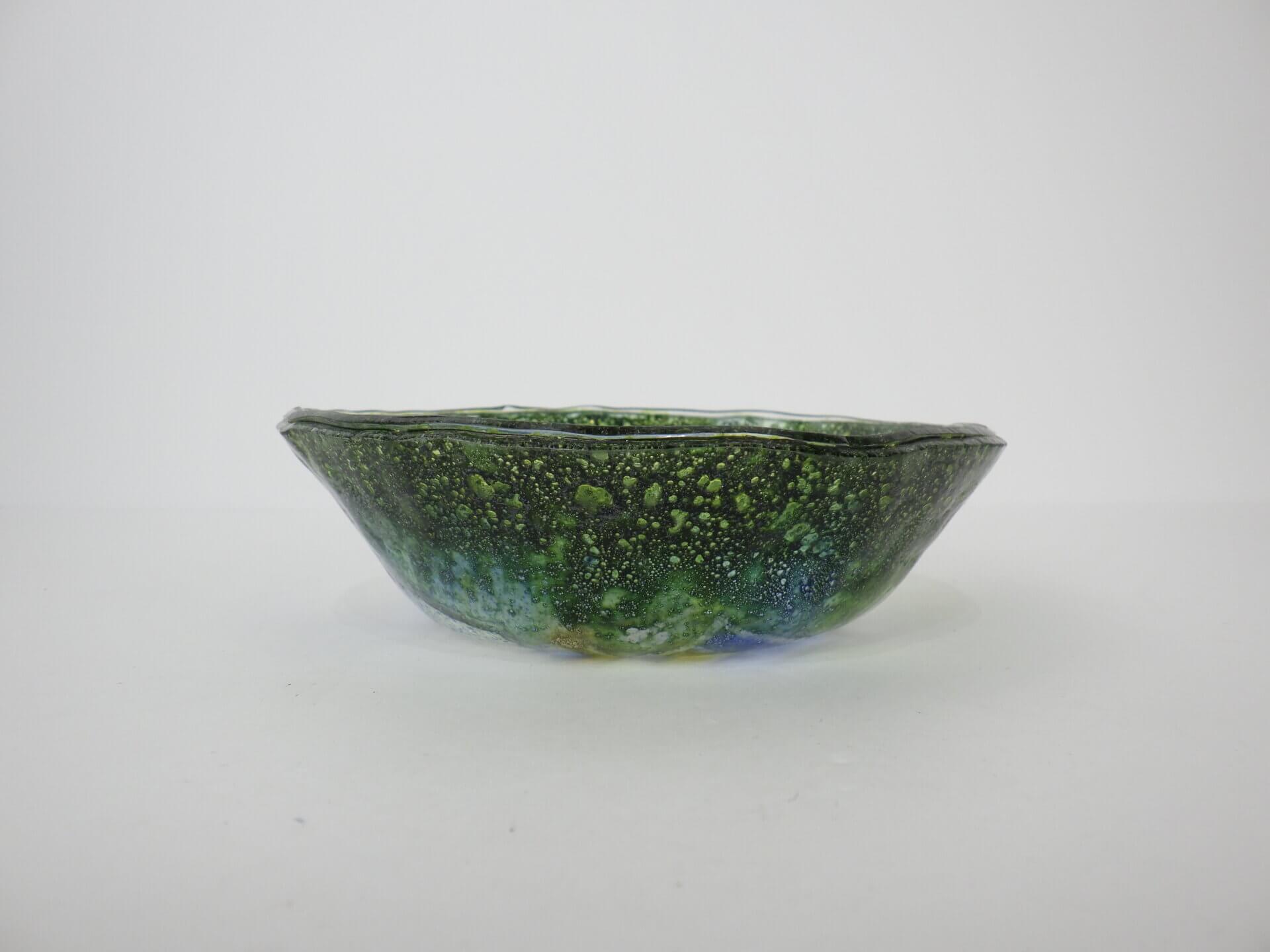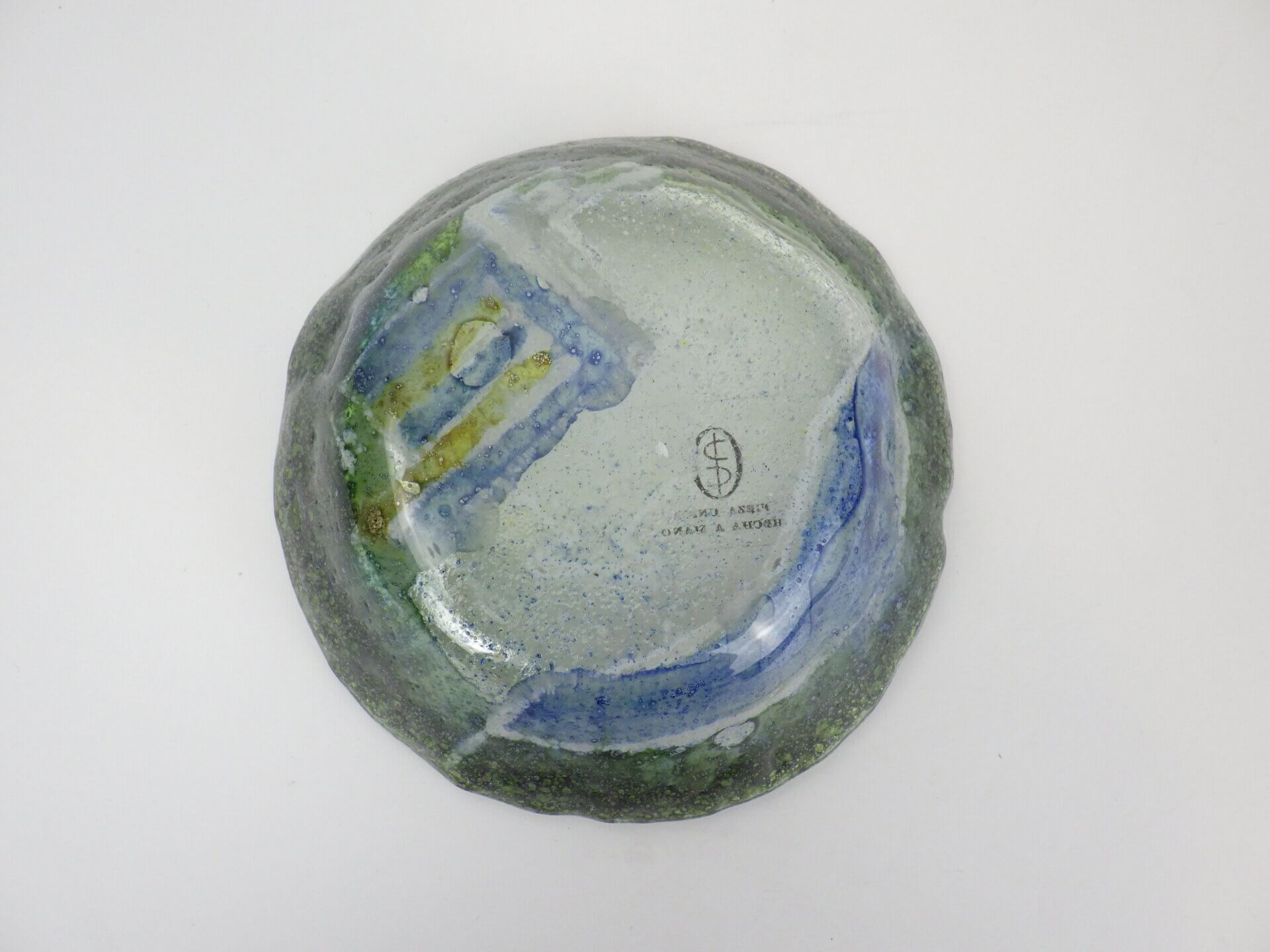 | アメリカで買い付けました。 イタリア、ムラーノ島で作られた、ハンドメイドのアートガラスです。 ガラスの中に閉じ込められた無数の気泡と、グリーン、ブルー、イエローが溶け合う抽象的な模様は、まるで海や鉱石の断面のような表情で、光を受けることで奥行きのある色彩が浮かび上がります。 ムラーノガラスは13世紀から続くイタリアを代表するガラス工芸ですが、1960~70年代にはこうした芸術性の高いアートガラスが数多く制作されました。 またラベルから推測されるに、こちらは海外輸出用アイテムだったようです。 アクセサリートレーや小物置き、灰皿としてはもちろん、オブジェの様に飾るだけでも空間に彩りを添えてくれるアイテムですね。 |