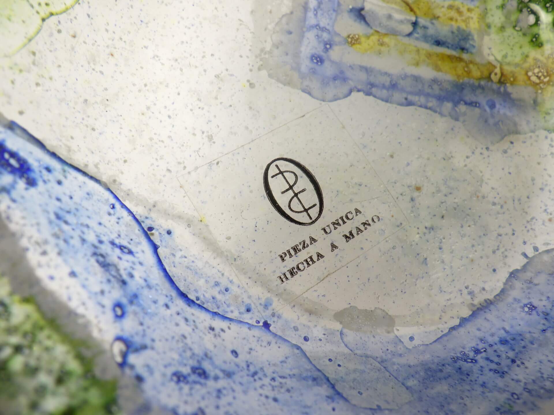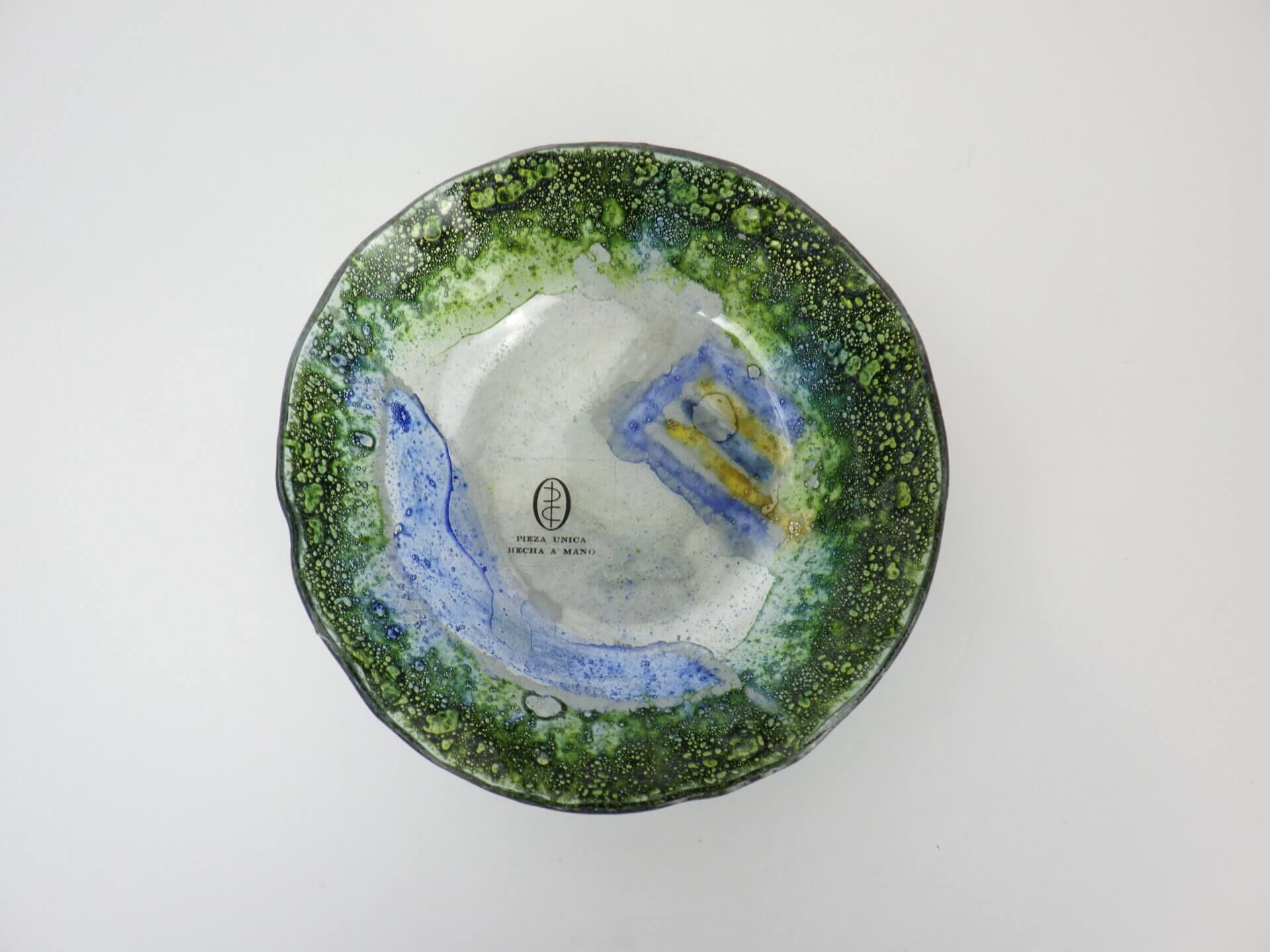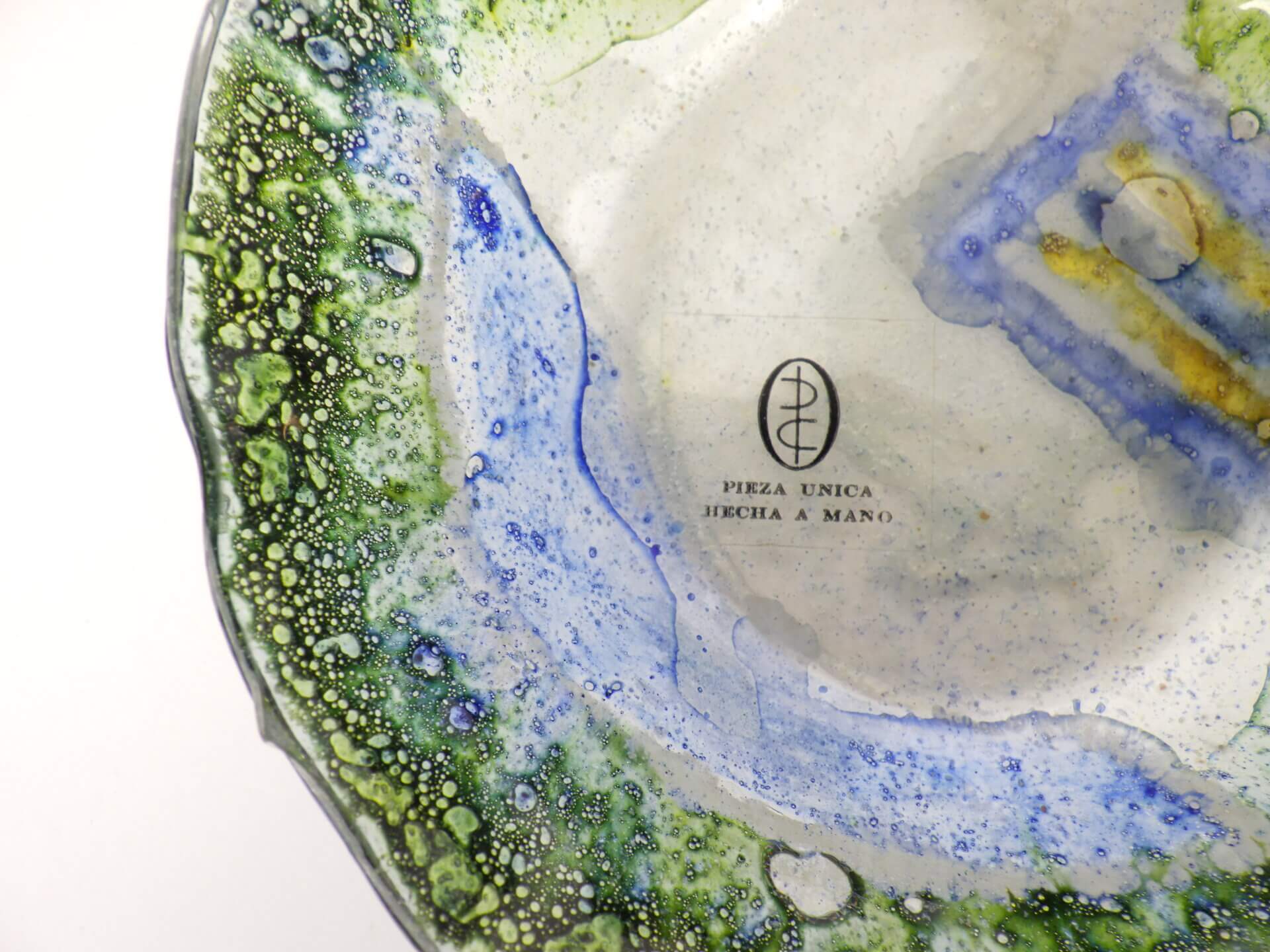 | アメリカで買い付けました。 イタリア、ムラーノ島で作られた、ハンドメイドのアートガラスです。 ガラスの中に閉じ込められた無数の気泡と、グリーン、ブルー、イエローが溶け合う抽象的な模様は、まるで海や鉱石の断面のような表情で、光を受けることで奥行きのある色彩が浮かび上がります。 ムラーノガラスは13世紀から続くイタリアを代表するガラス工芸ですが、1960~70年代にはこうした芸術性の高いアートガラスが数多く制作されました。 またラベルから推測されるに、こちらは海外輸出用アイテムだったようです。 アクセサリートレーや小物置き、灰皿としてはもちろん、オブジェの様に飾るだけでも空間に彩りを添えてくれるアイテムですね。 |