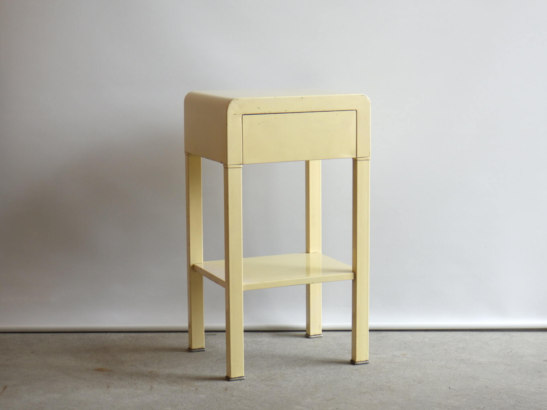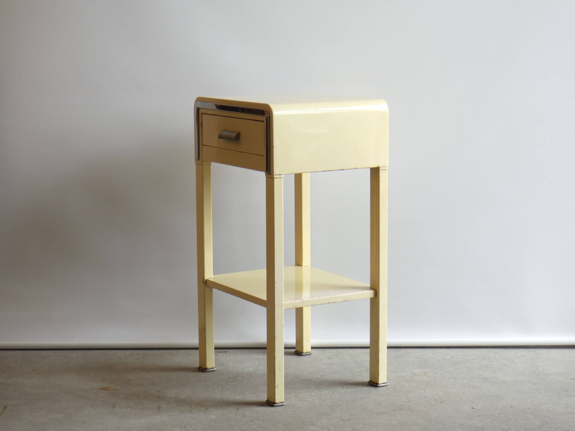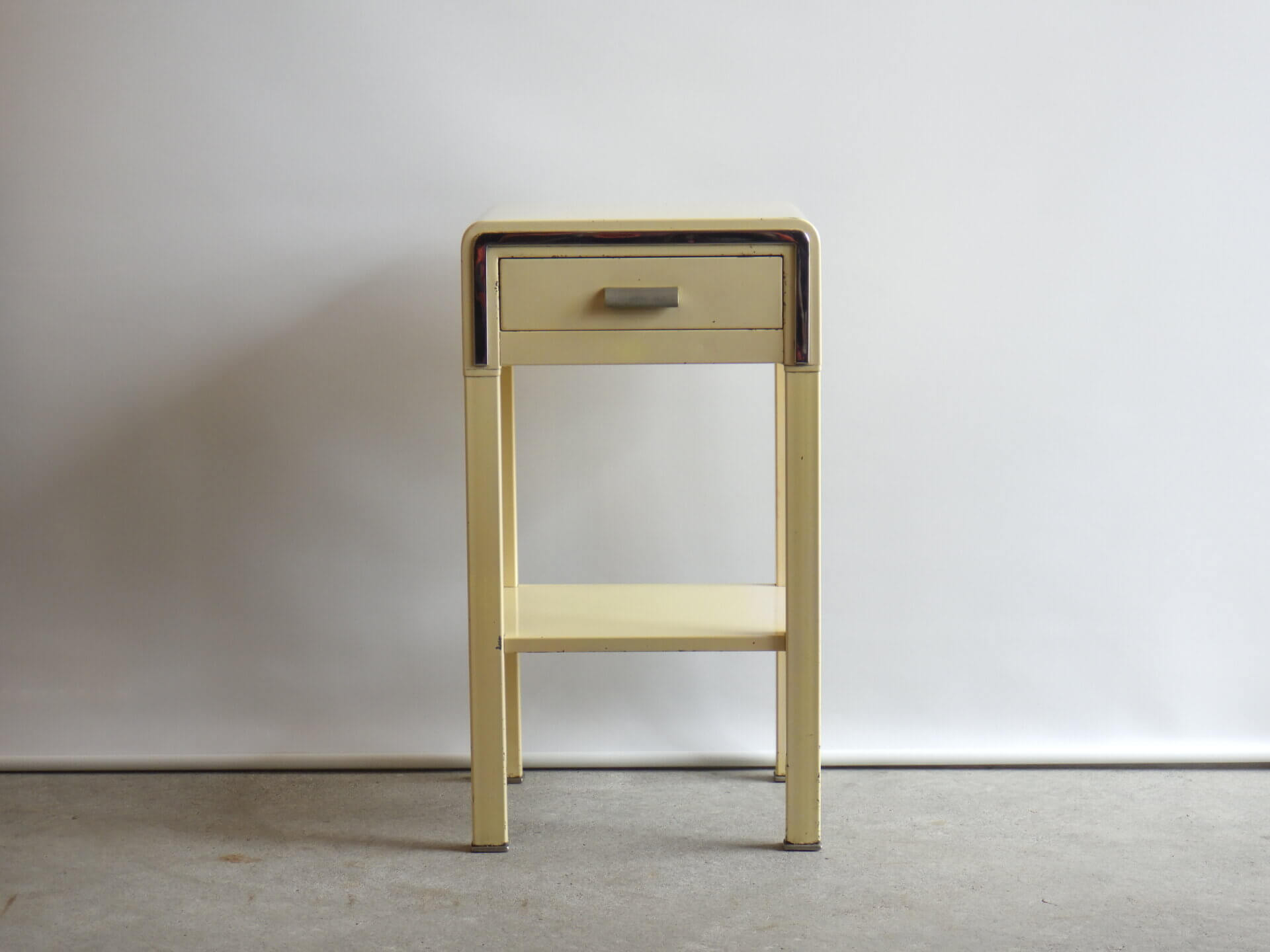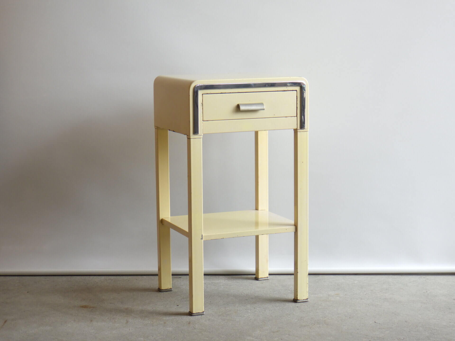 | アメリカで買い付けました。 二十世紀を代表するアメリカの工業デザイナー「Norman Bel Geddes(ノーマン・ベル・ゲデス)」がデザインを手掛けた、ビンテージナイトスタンドです。 マットレスのメーカーとして有名なシモンズですが、それまで木製家具が主流だった時代に、ノーマン・ベル・ゲデスと組んでスチール製ベッドルーム家具を提案し、世界的に有名になりました。 こちらのナイトスタンドもしっかりとその流れを汲んでおり、丸みを帯びたトップのフォルムや、無駄を削ぎ落した構造には、アールデコからストリームラインモダンへと移行するデザインの空気感が感じられます。 柔らかなクリームカラーの塗装に、ニッケルメッキのコントラストが目を惹き、無機質な素材でありながらもどこか温かみを感じられる、絶妙なバランス。 引き出しと下段シェルフを備えた実用的な設計なので、ベッドサイドはもちろん、ソファサイドやエントランス、店舗什器としても活躍できそう。 木製家具が中心の空間に取り入れることで、程良い緊張感と抜け感をプラスし、コンパクトながら空間にしっかりとした個性を与えてくれるアイテムです。 |