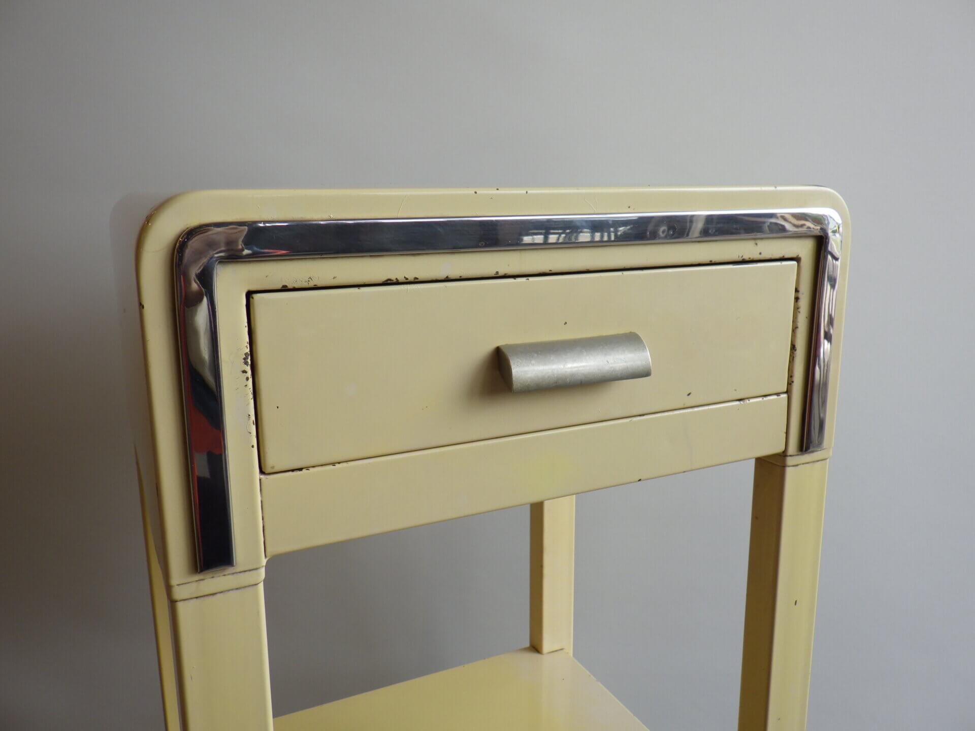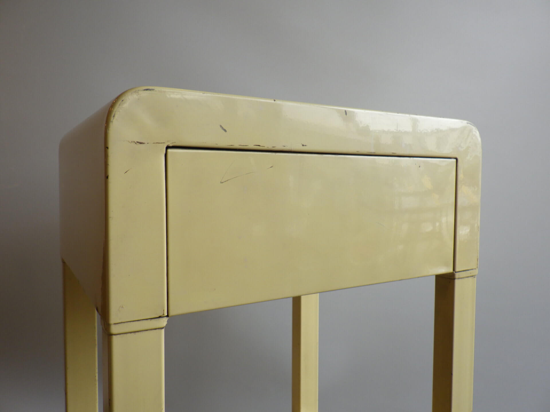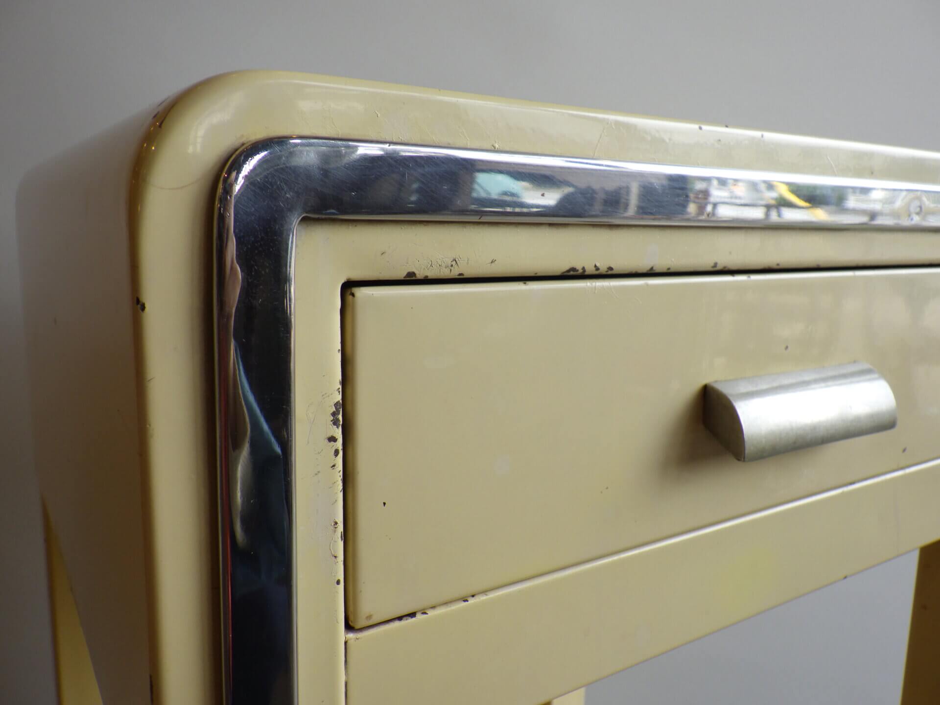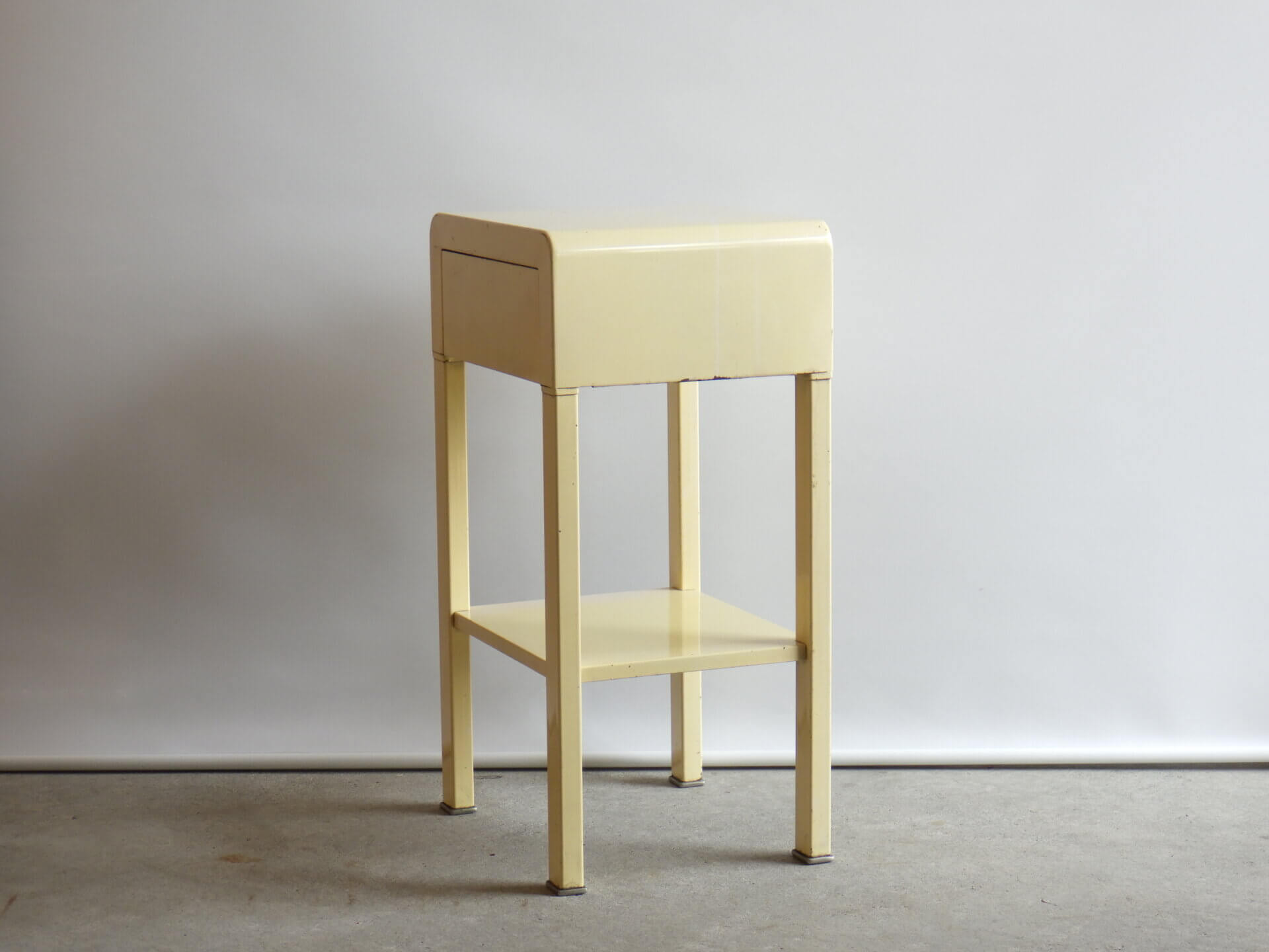 | アメリカで買い付けました。 二十世紀を代表するアメリカの工業デザイナー「Norman Bel Geddes(ノーマン・ベル・ゲデス)」がデザインを手掛けた、ビンテージナイトスタンドです。 マットレスのメーカーとして有名なシモンズですが、それまで木製家具が主流だった時代に、ノーマン・ベル・ゲデスと組んでスチール製ベッドルーム家具を提案し、世界的に有名になりました。 こちらのナイトスタンドもしっかりとその流れを汲んでおり、丸みを帯びたトップのフォルムや、無駄を削ぎ落した構造には、アールデコからストリームラインモダンへと移行するデザインの空気感が感じられます。 柔らかなクリームカラーの塗装に、ニッケルメッキのコントラストが目を惹き、無機質な素材でありながらもどこか温かみを感じられる、絶妙なバランス。 引き出しと下段シェルフを備えた実用的な設計なので、ベッドサイドはもちろん、ソファサイドやエントランス、店舗什器としても活躍できそう。 木製家具が中心の空間に取り入れることで、程良い緊張感と抜け感をプラスし、コンパクトながら空間にしっかりとした個性を与えてくれるアイテムです。 |