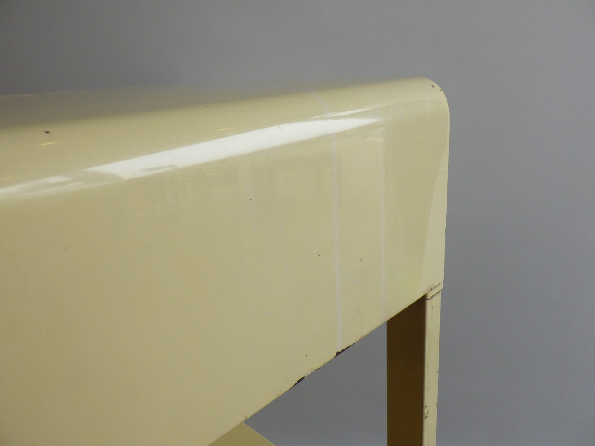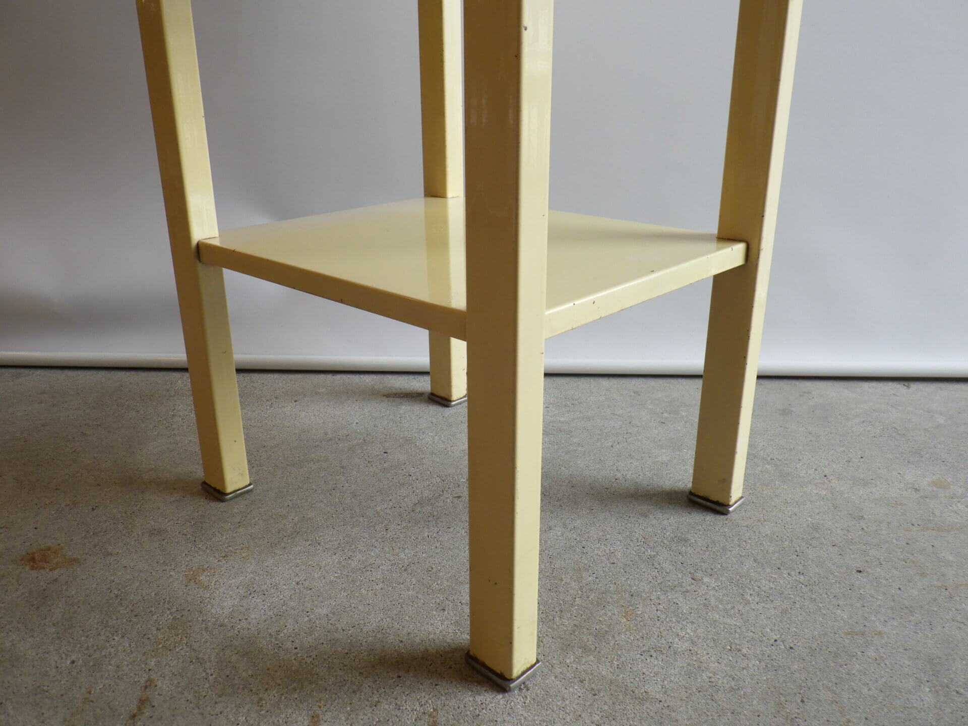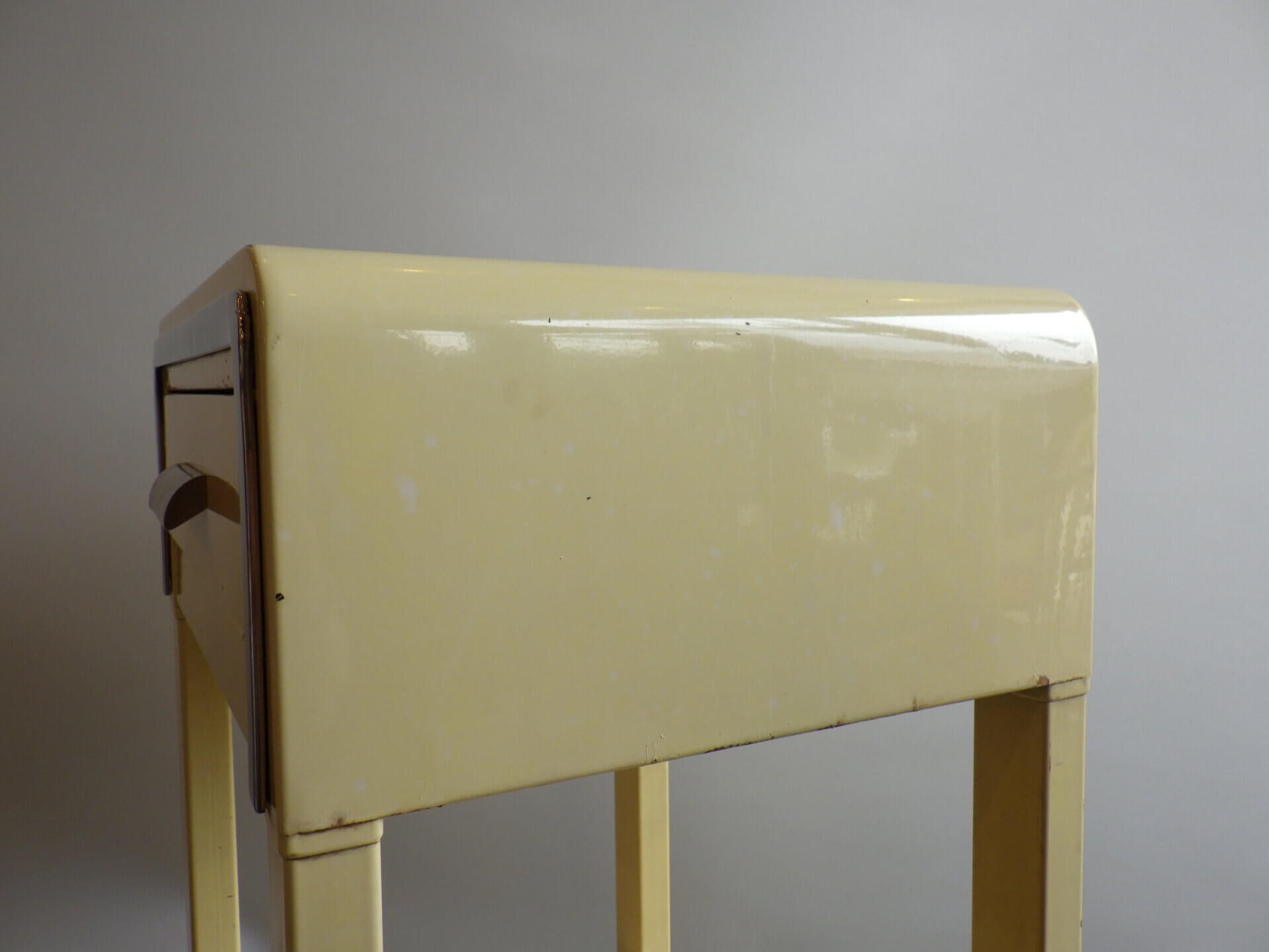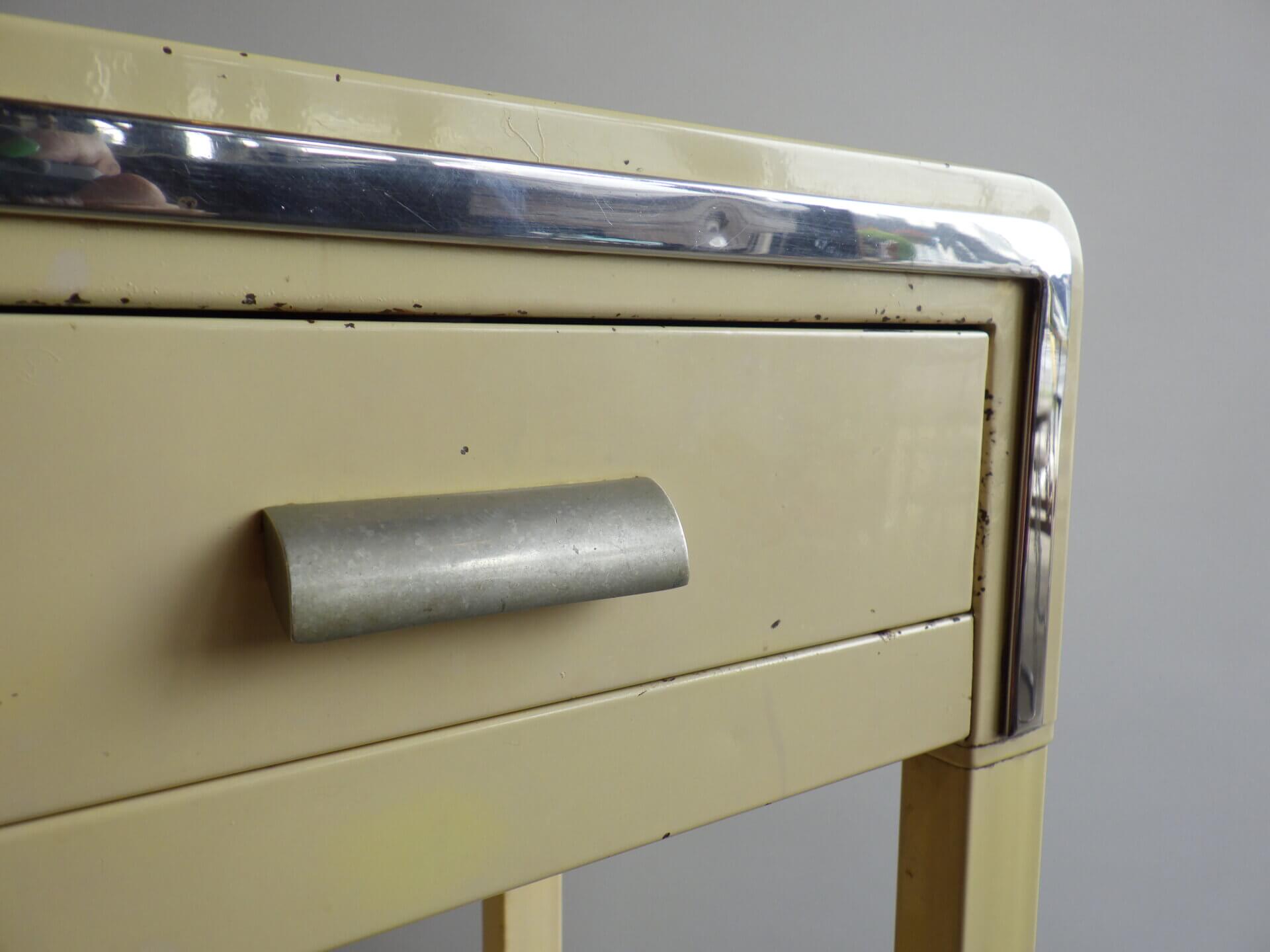 | アメリカで買い付けました。 二十世紀を代表するアメリカの工業デザイナー「Norman Bel Geddes(ノーマン・ベル・ゲデス)」がデザインを手掛けた、ビンテージナイトスタンドです。 マットレスのメーカーとして有名なシモンズですが、それまで木製家具が主流だった時代に、ノーマン・ベル・ゲデスと組んでスチール製ベッドルーム家具を提案し、世界的に有名になりました。 こちらのナイトスタンドもしっかりとその流れを汲んでおり、丸みを帯びたトップのフォルムや、無駄を削ぎ落した構造には、アールデコからストリームラインモダンへと移行するデザインの空気感が感じられます。 柔らかなクリームカラーの塗装に、ニッケルメッキのコントラストが目を惹き、無機質な素材でありながらもどこか温かみを感じられる、絶妙なバランス。 引き出しと下段シェルフを備えた実用的な設計なので、ベッドサイドはもちろん、ソファサイドやエントランス、店舗什器としても活躍できそう。 木製家具が中心の空間に取り入れることで、程良い緊張感と抜け感をプラスし、コンパクトながら空間にしっかりとした個性を与えてくれるアイテムです。 |