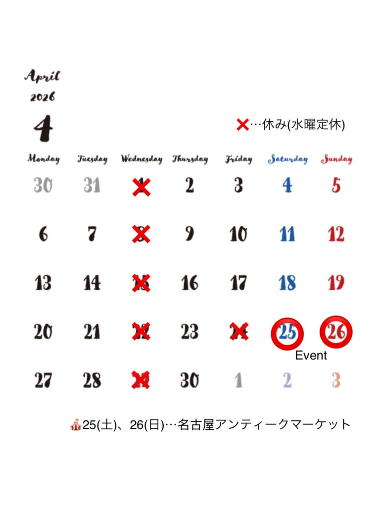 4月25日(土)、26日(日)は、東別院で開催される「名古屋アンティークマーケット」に出展予定です。