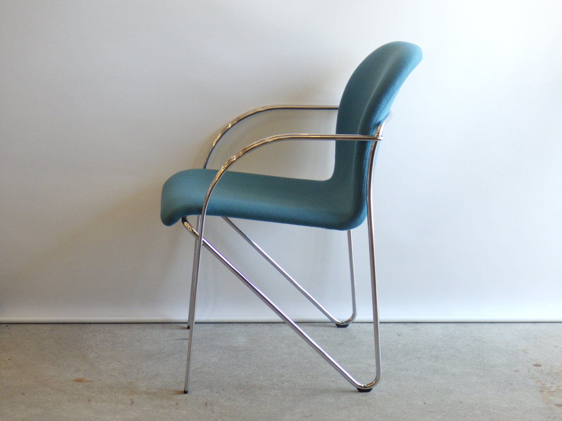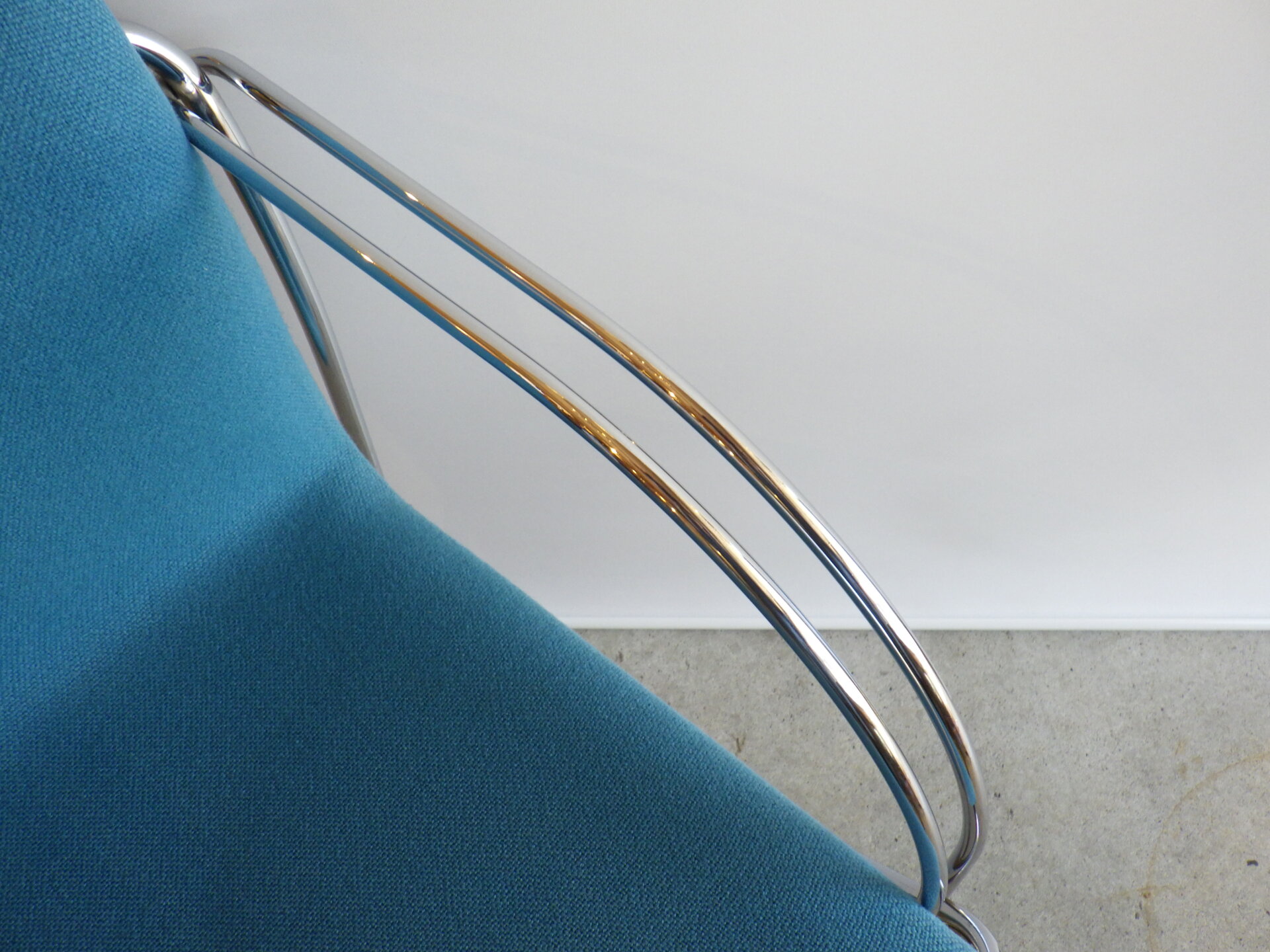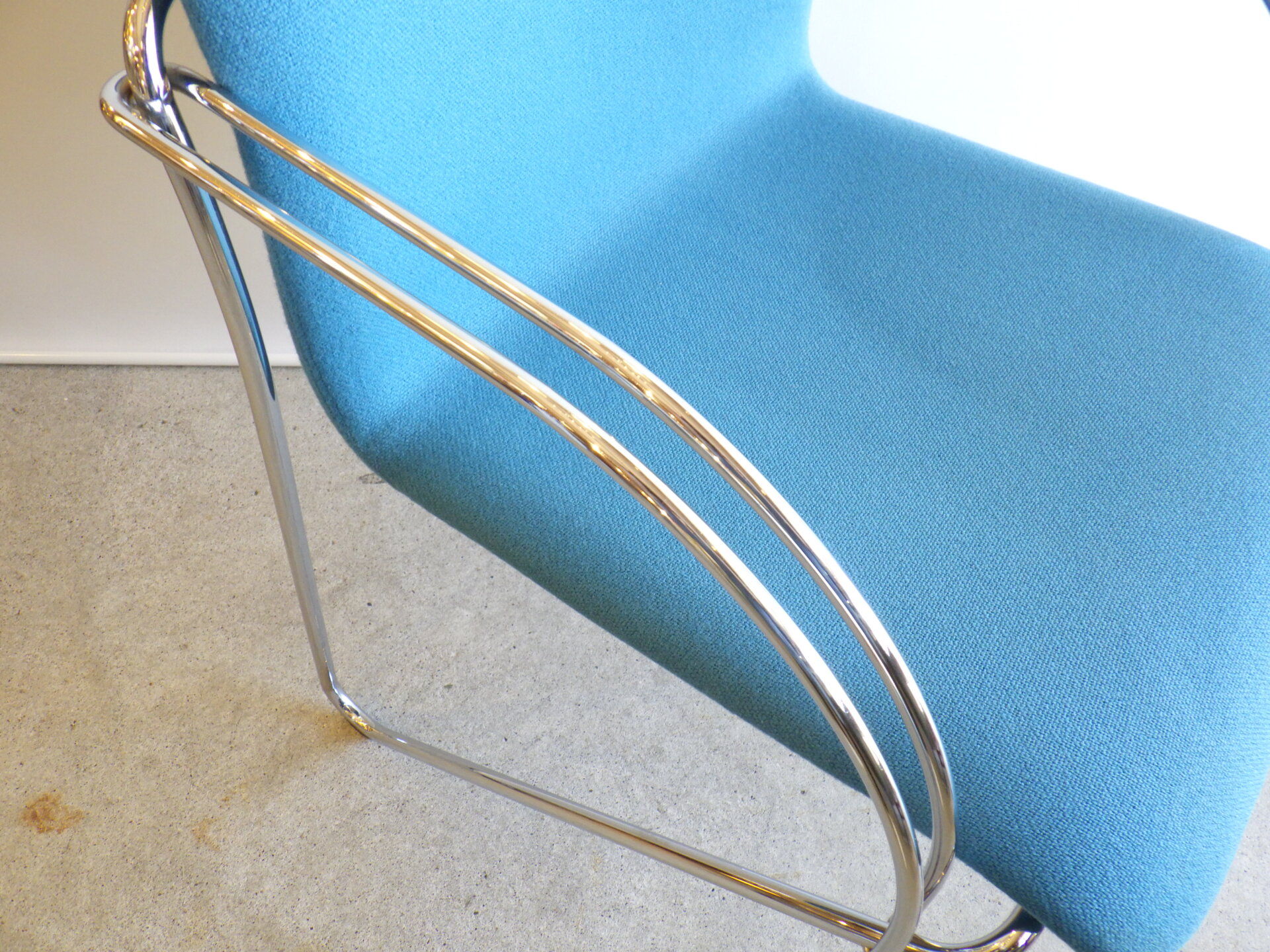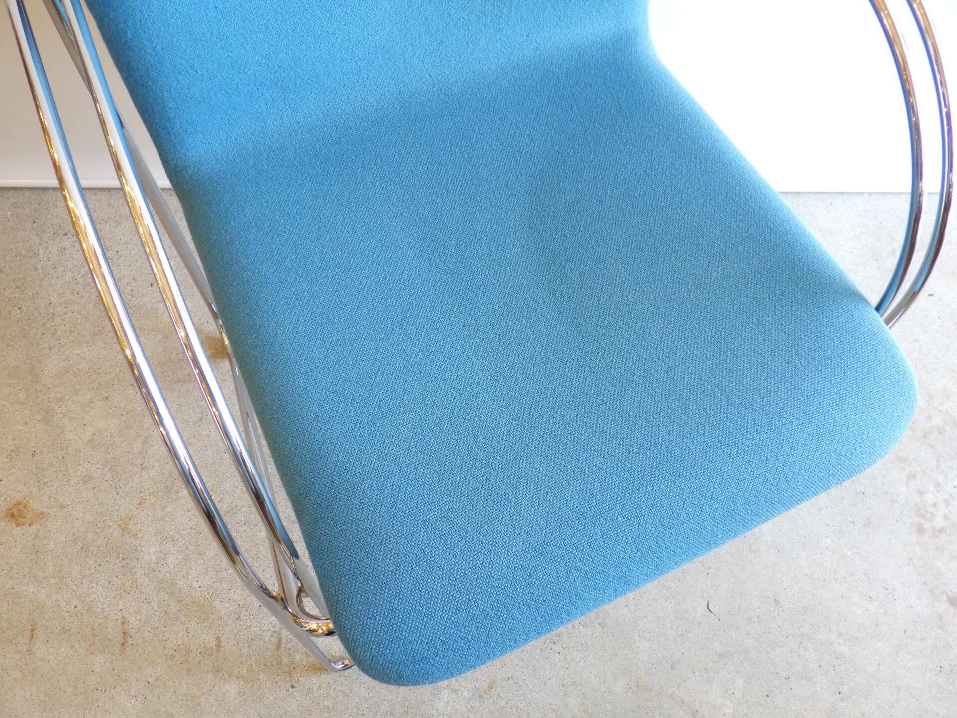 | デンマークで買い付けました。 Alfred Homannデザイン、Labofa社製のスタッキングアームチェアです。 クロムメッキのチューブフレームと、身体に沿うように成形されたシートが特徴で、軽やかな構造と快適な座り心地を両立した一脚です。 視覚的に抜けのあるフレーム構造は空間に圧迫感を与えず、ダイニングやデスク周りにも自然に馴染みます。 ターコイズブルーのファブリックは、ウッドやガラス、モダンなインテリアに程よいアクセントを加え、空間全体の印象を引き締めてくれますよ。 日常使いからディスプレイまで幅広く活躍するアイテムですので、ご自宅使い、店舗什器どちらにもおすすめのアイテムです。 |