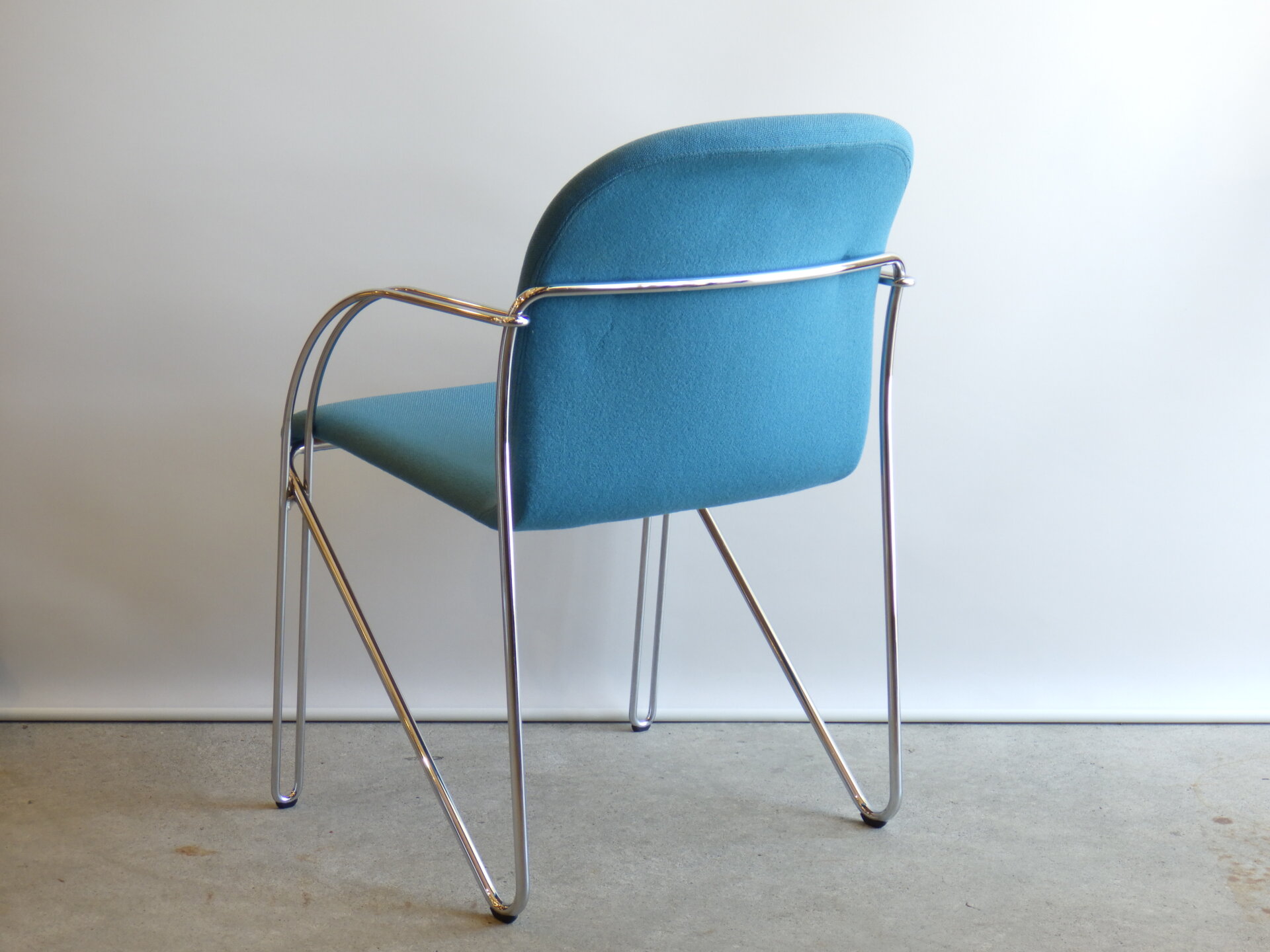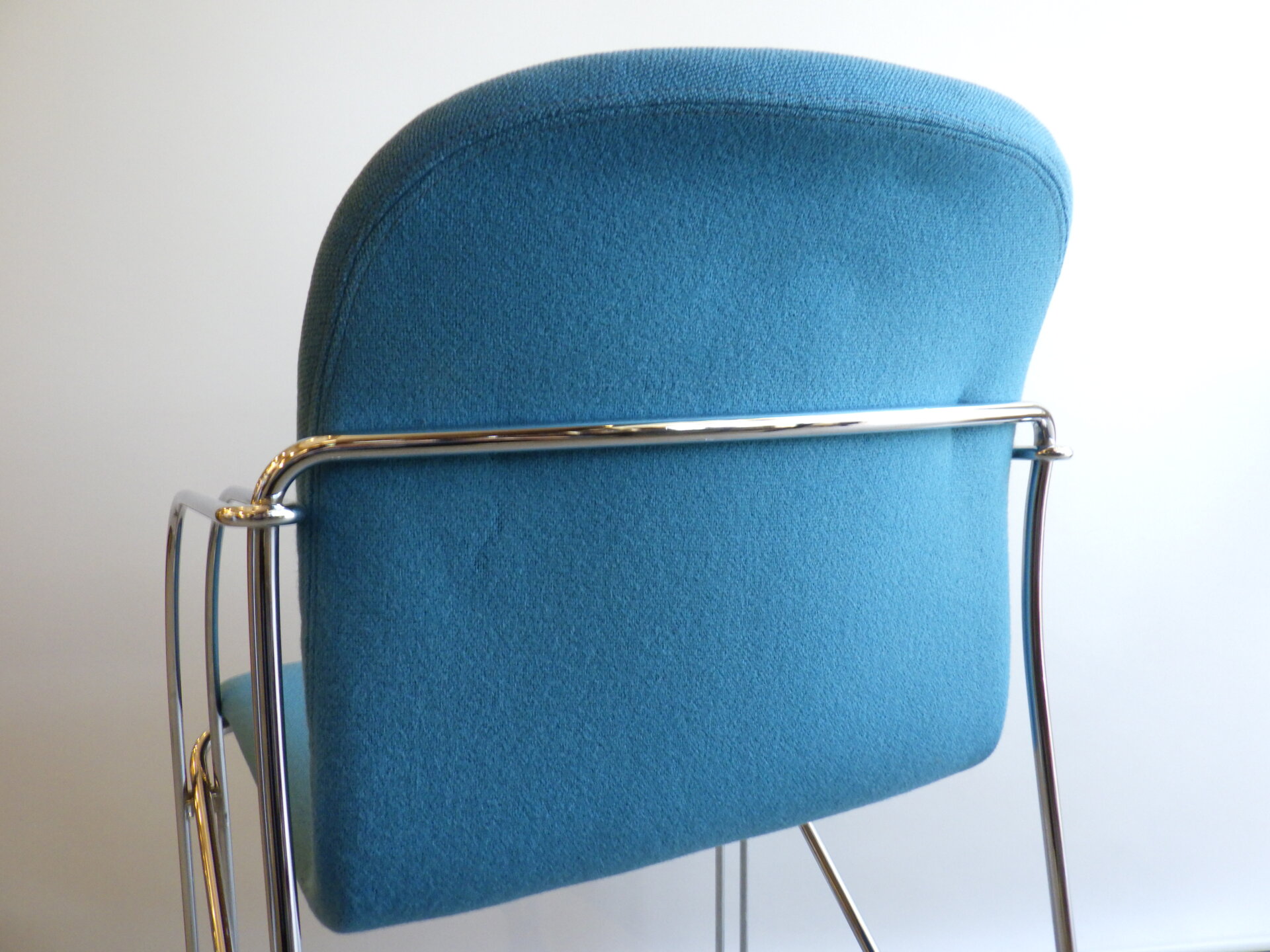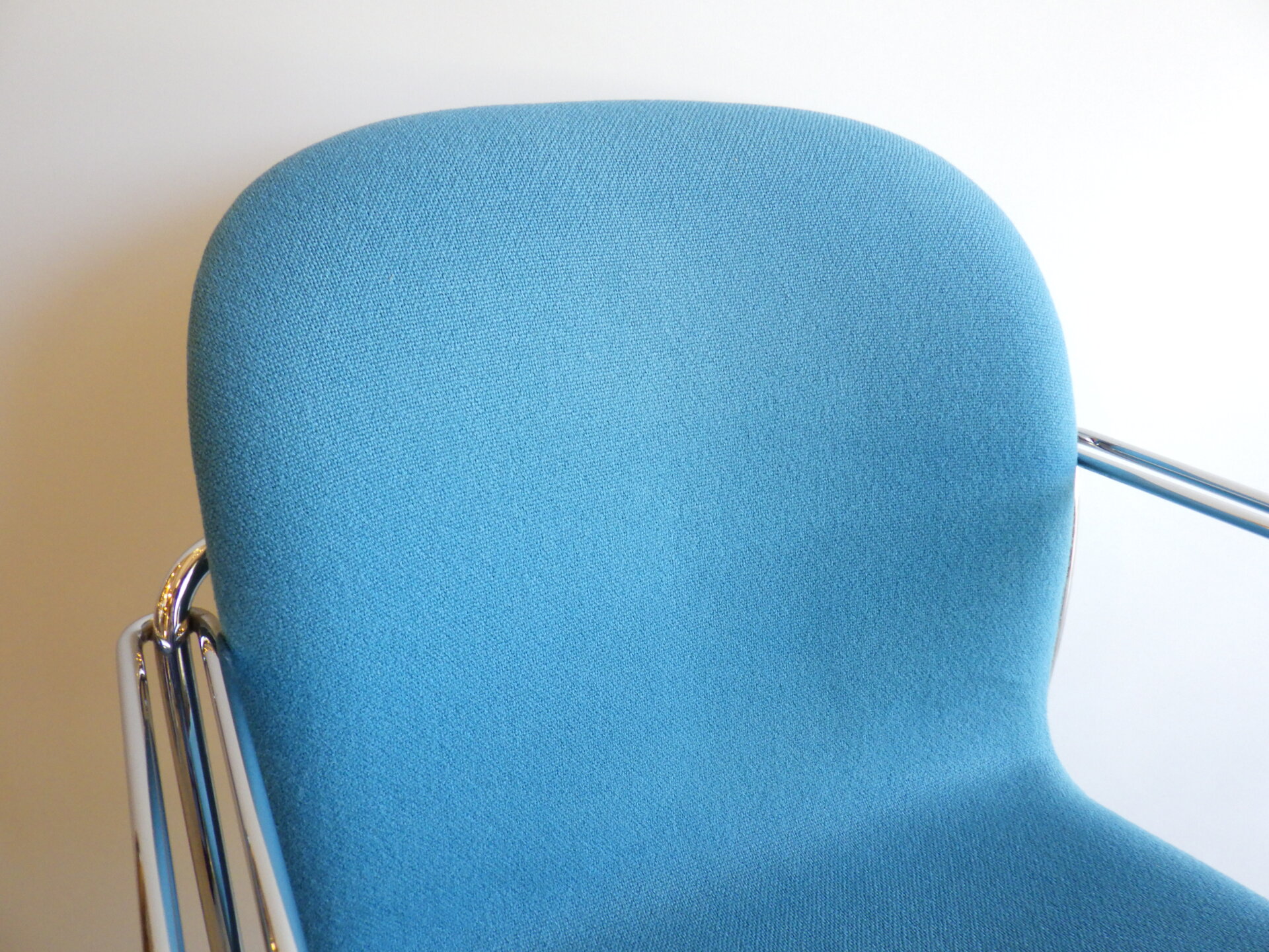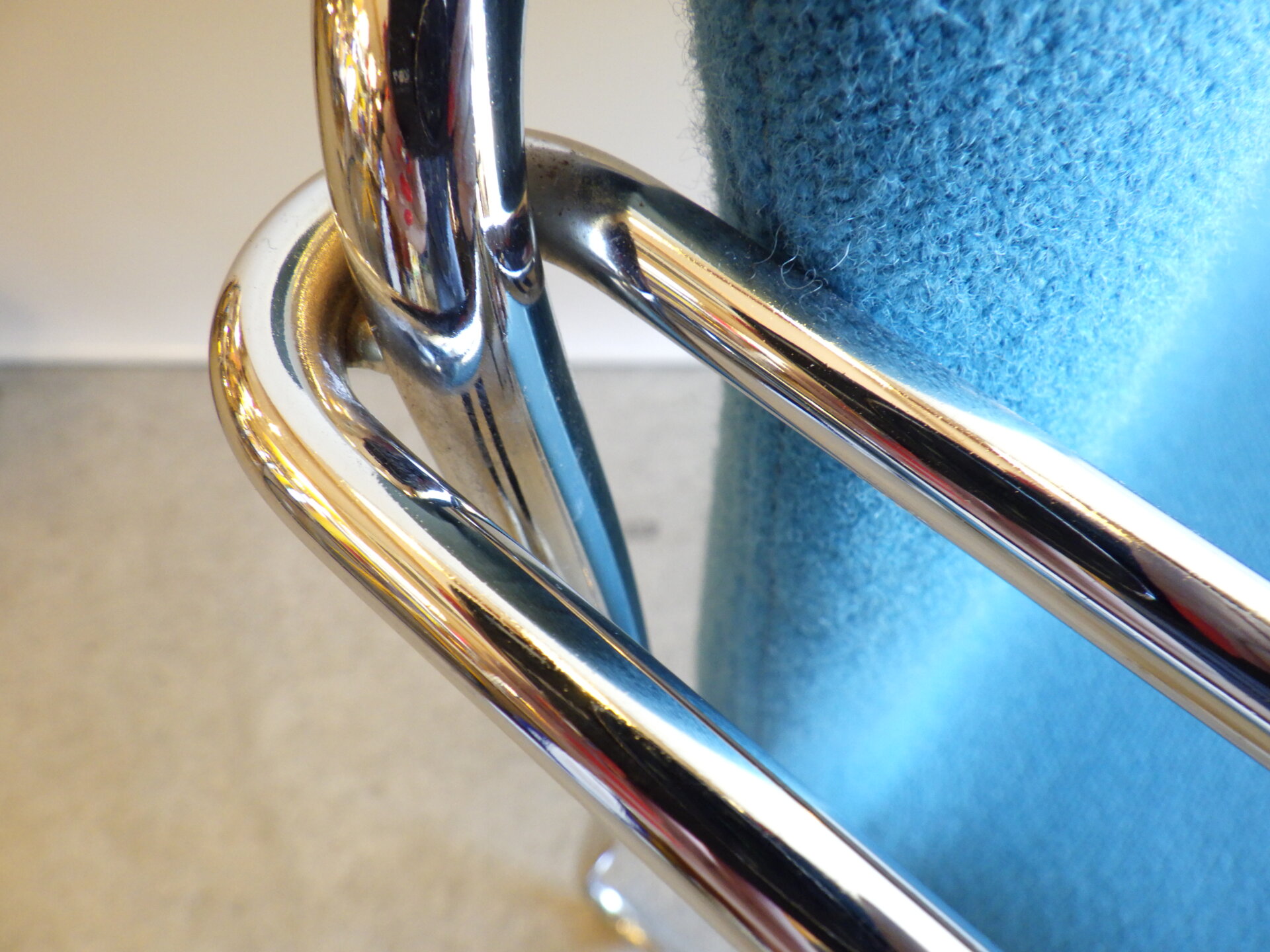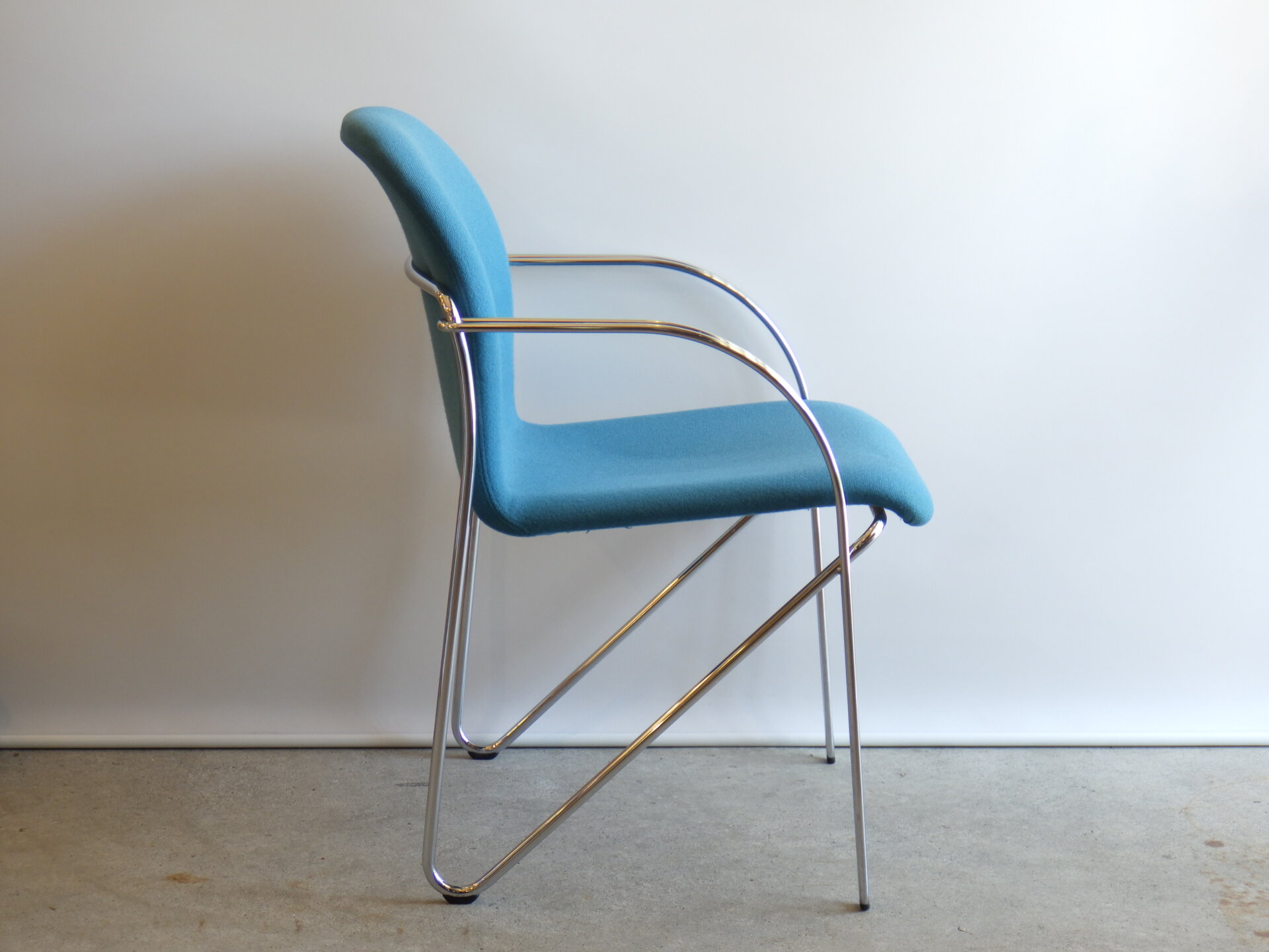 | デンマークで買い付けました。 Alfred Homannデザイン、Labofa社製のスタッキングアームチェアです。 クロムメッキのチューブフレームと、身体に沿うように成形されたシートが特徴で、軽やかな構造と快適な座り心地を両立した一脚です。 視覚的に抜けのあるフレーム構造は空間に圧迫感を与えず、ダイニングやデスク周りにも自然に馴染みます。 ターコイズブルーのファブリックは、ウッドやガラス、モダンなインテリアに程よいアクセントを加え、空間全体の印象を引き締めてくれますよ。 日常使いからディスプレイまで幅広く活躍するアイテムですので、ご自宅使い、店舗什器どちらにもおすすめのアイテムです。 |