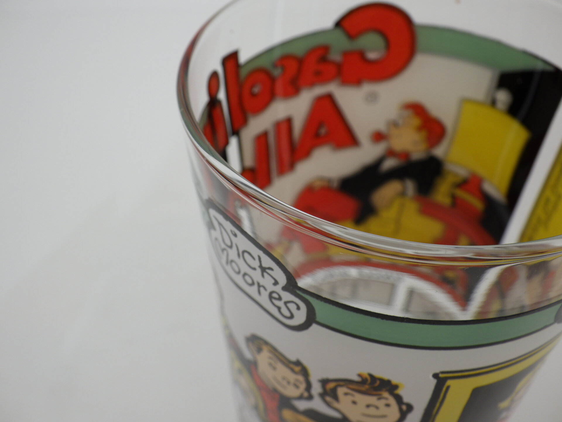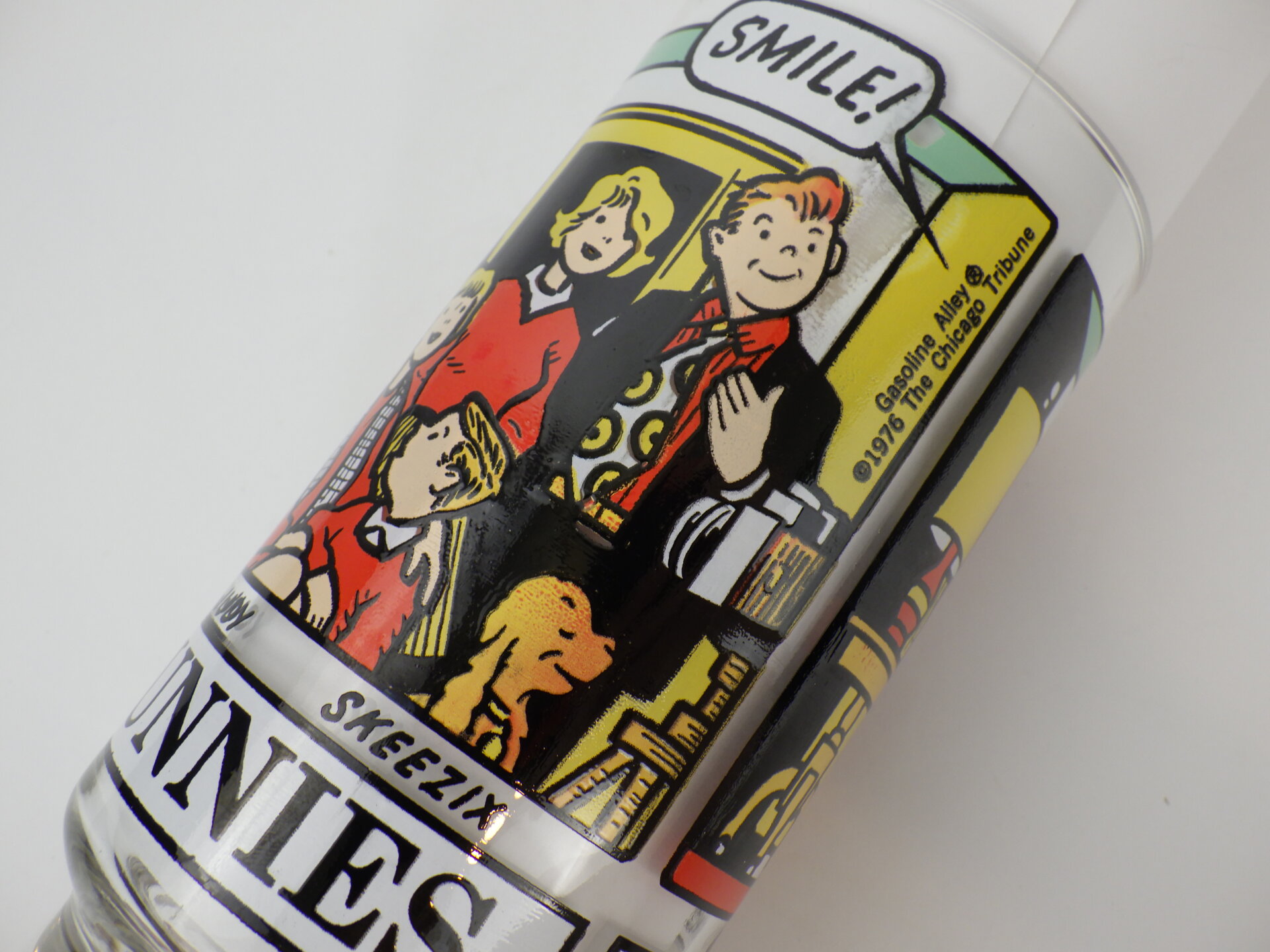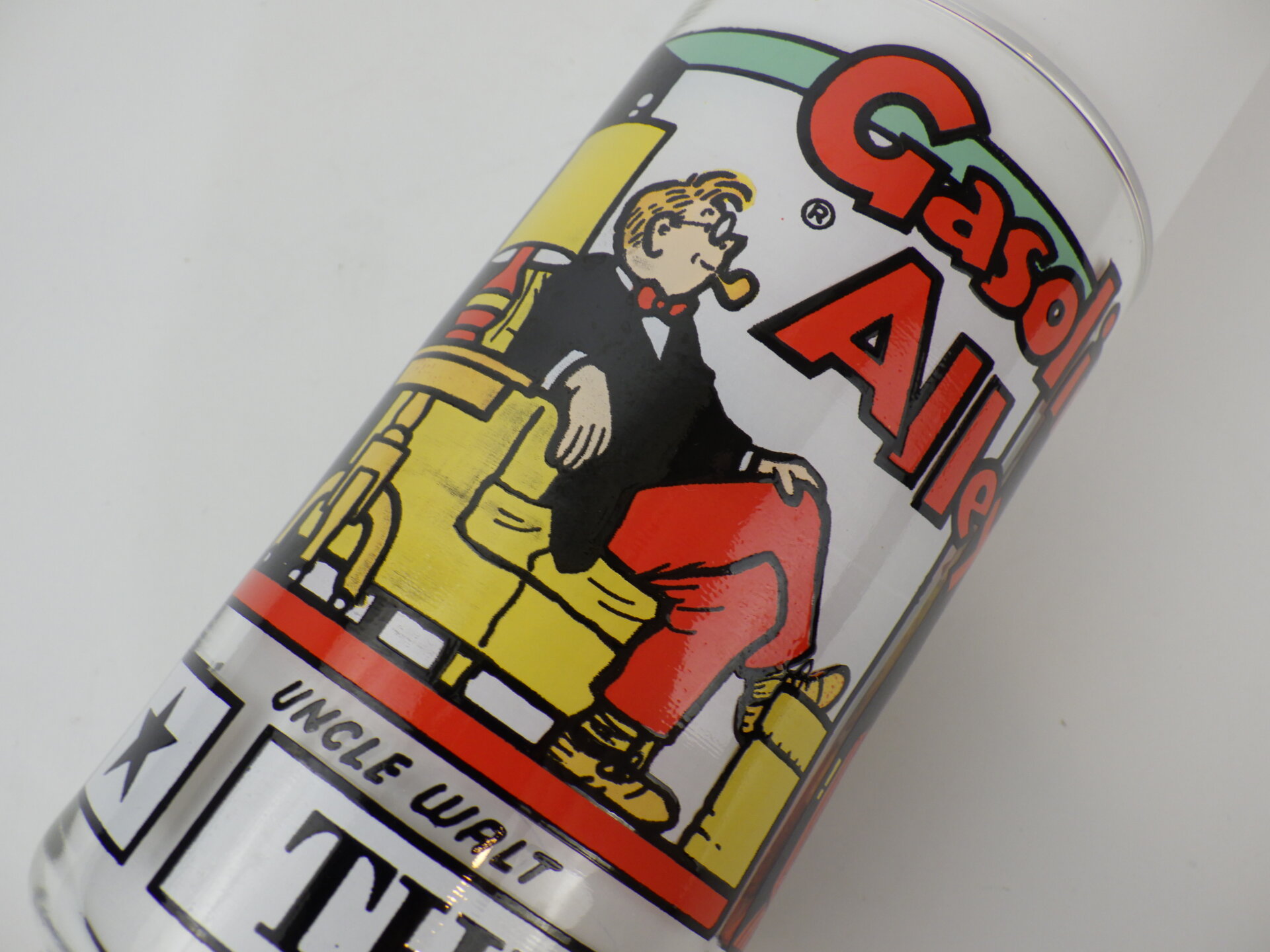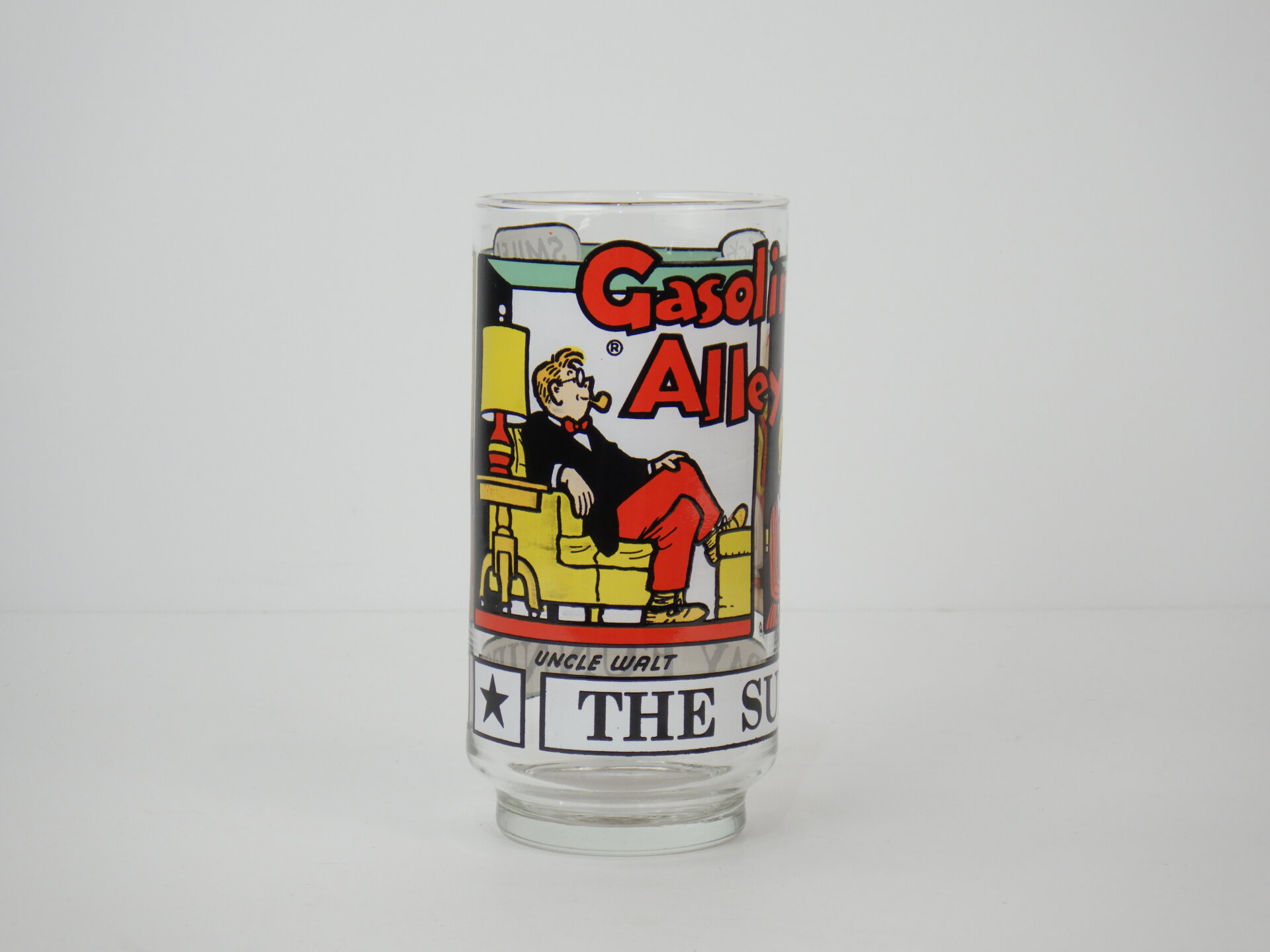 | アメリカで買い付けました。 リビー社製、「THE SUNDAY FUNNIES」シリーズのコレクターズグラスです。 このシリーズは、当時の新聞コミックをモチーフにしたプロモーション用グラスとして、全四種類製造されました。 こちらは1918年から現在まで百年以上続いている、アメリカでもっとも息の長い新聞漫画の一つ、「Gasoline Alley」がモチーフとなっています。 コマ割りや吹き出しをそのまま落とし込んだデザインが、当時のアメリカらしい遊び心とユーモアさを感じさせてくれますね。 |