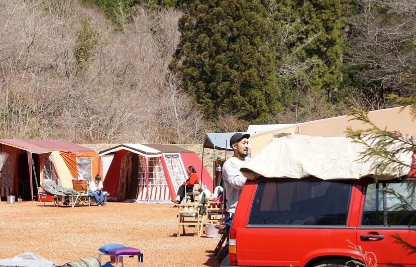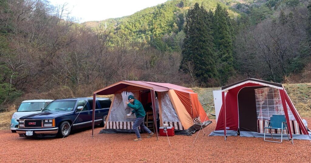 大々的にタイトルに名前を入れられてしまい恐縮ですが、私をもっとキャンプ沼にハメようと画策する(?)ビンテージキャンプ沼の住人の方々が、各々の鉄骨テントやビンテージギア、ヨダレ物の愛車を引っさげて、岐阜県下呂市にある「奥ノ田ヒルズ」さんに集結しました。