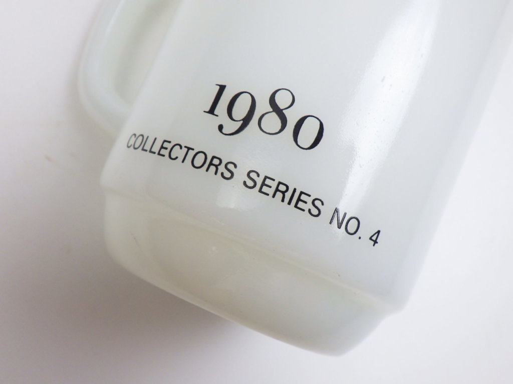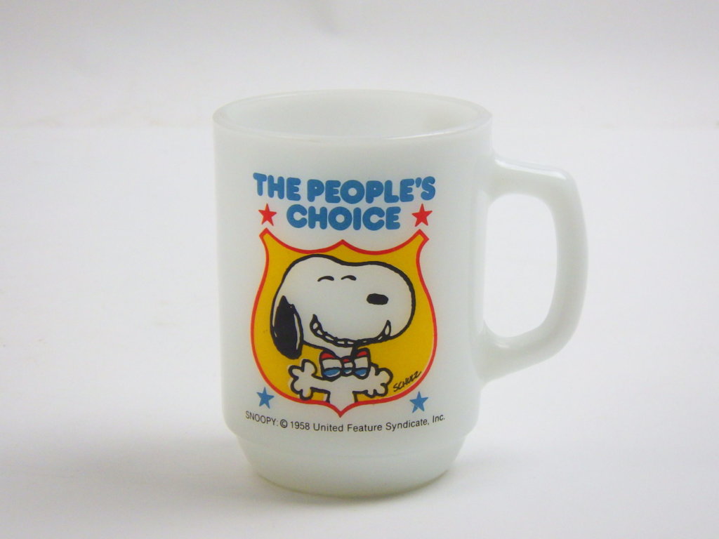 1980年のアメリカ大統領選の時に製造されたマグです。全部で4種類あり、裏面に「COLLECTORS SIRIES NO.1~4」とプリントされており、こちらはNO.4になります。スヌーピーの広げられた手と、星条旗カラーの蝶ネクタイが可愛らしいですね。ちなみにこの時に大統領に選ばれたのは、第40代のロナルド・レーガンでした。