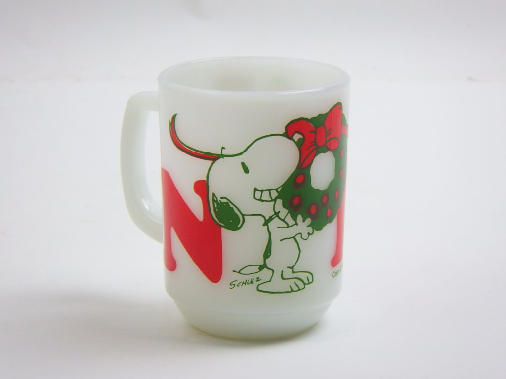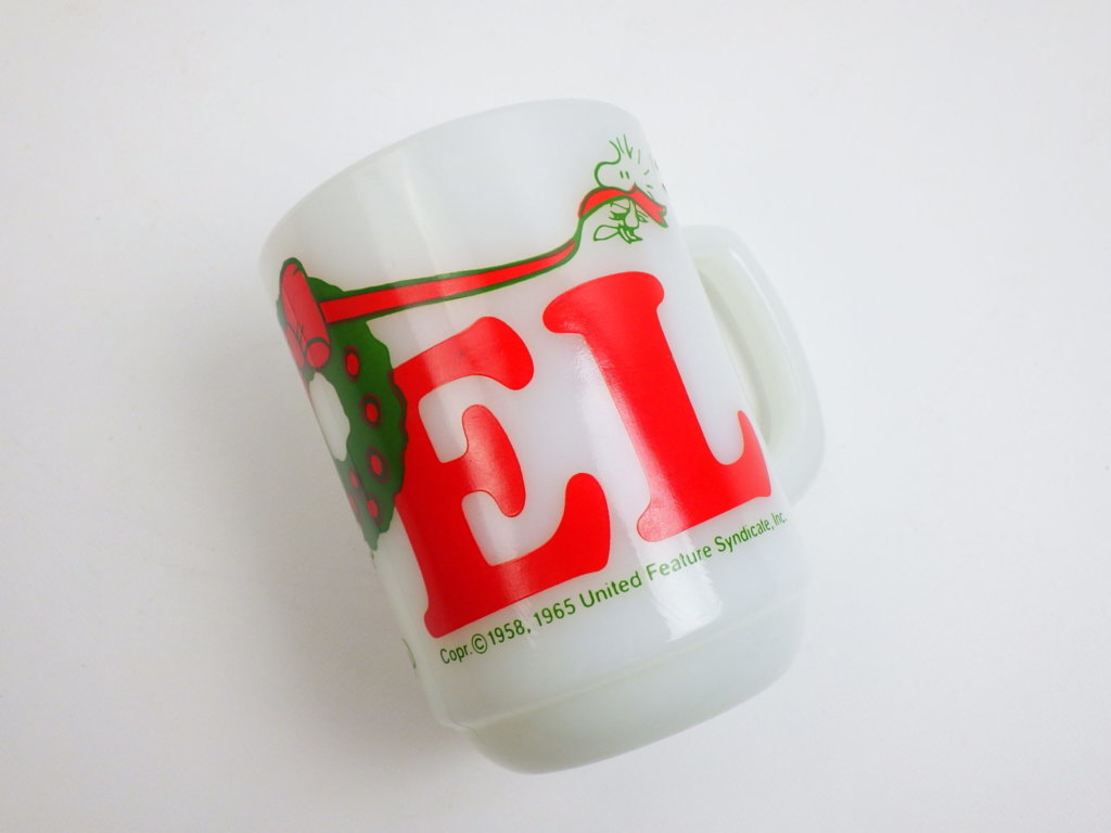 クリスマス限定で生産されたため、数が少なく入手が困難なアイテムです。スヌーピーとウッドストックが仲良くクリスマスリースを飾っているイラストが、マグの全面にプリントされています。